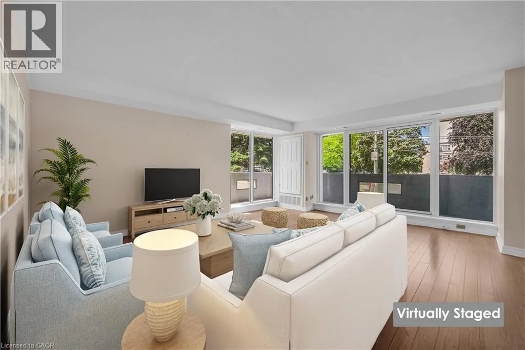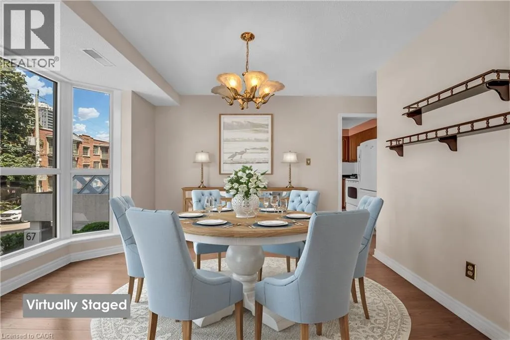 Niagara-QEW to Hamilton, RedHillVlyPkwy, King Exit, Right on King, Right on Mtn Access, Kenilworth to Sherman, Left on CharltonAveE, Right on BayStS |Toronto-QEW to Hamilton, Main St W exit from ON-403W, Merge onto HWY8/MainStW, Right on CarolineStS. BRIGHT, SPACIOUS & STEPS TO EVERYTHING... Unit 203 at 67 Caroline Street South is a 1521 sq ft CORNER UNIT in Bentley Place, nestled in the heart of Hamilton's vibrant Durand North neighbourhood. This bright and beautifully laid-out suite offers the perfect blend of space, comfort, and unbeatable location. Step inside and be greeted by an OVERSIZED LIVING ROOM with expansive windows that flood the space with natural light plus WALK OUT to a private, WRAP-AROUND CORNER BALCONY. The living space flows seamlessly into a formal dining room with bay window and a spacious eat-in kitchen loaded with abundant cabinetry and an extended dining nook, perfect for everyday meals or entertaining guests. The primary suite is your own private haven, featuring a walk-in closet, 4-pc ensuite with soaker tub and separate shower, and a balconette walk-out for a touch of fresh air. A generous second bedroom with walk-in closet, a second full bath, and convenient in-suite laundry complete the layout. This unit includes TWO parking spaces (1 underground P2#4, 1 surface #14), and the building offers fantastic AMENITIES including an exercise room and party room with kitchen. Bonus: the building has all NEW THERMAL WINDOWS (2025), adding value and energy efficiency. Location is everything and this one delivers! Enjoy walkable access to nearby parks, Locke Street, and Hess Village, with boutique shopping, amazing restaurants, and the GO Station just minutes away. If youâre seeking a spacious and sun-filled condo in one of Hamiltonâs most desirable neighbourhoods, this is it. CLICK ON MULTIMEDIA for virtual tour, drone photos, floor plans & more. (id:27476)