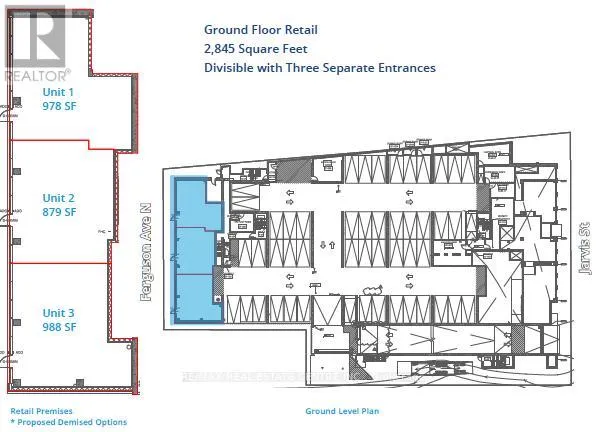 Jarvis & King St East Exceptional Ground Floor Retail Opportunity in Downtown Hamilton! Discover this brand new retail space for lease in the heart of Hamilton's vibrant downtown. Offering 1,857 sq. ft. of prime ground floor space, this unit can be leased as a whole or divided into two separate spaces (978 sq. ft. and 879 sq. ft.) to suit your business needs. Delivered in shell condition, this space is a blank canvas ready for your vision. These units are zoned D1 and premit the uses of Retail, Catering Service, Commercial School, Financial Establishment, Office, Medical Clinic, Restaurant, etc. Benefit from high traffic volumes, excellent exposure, and a built-in customer base as it serves a 15-storey residential building. Conveniently located near major highways and shopping destinations, this location offers exceptional accessibility. Additional highlights include: Two dedicated parking spots andFlexible leasing options - together or separate. Seize the opportunity to establish your business in a growing, high-demand area of downtown Hamilton! (id:27476)
