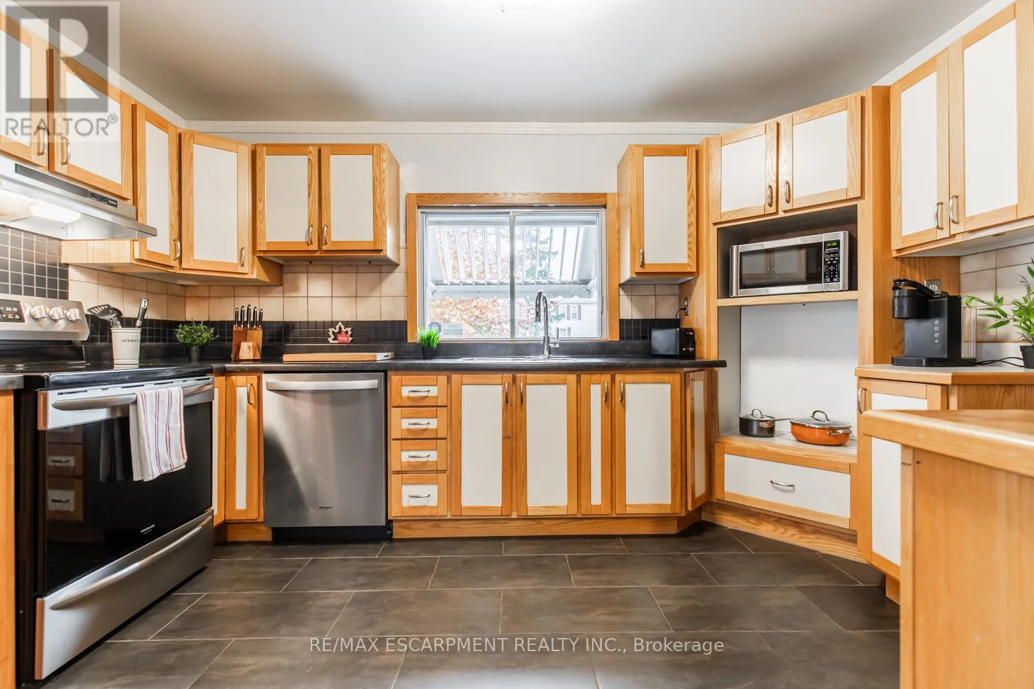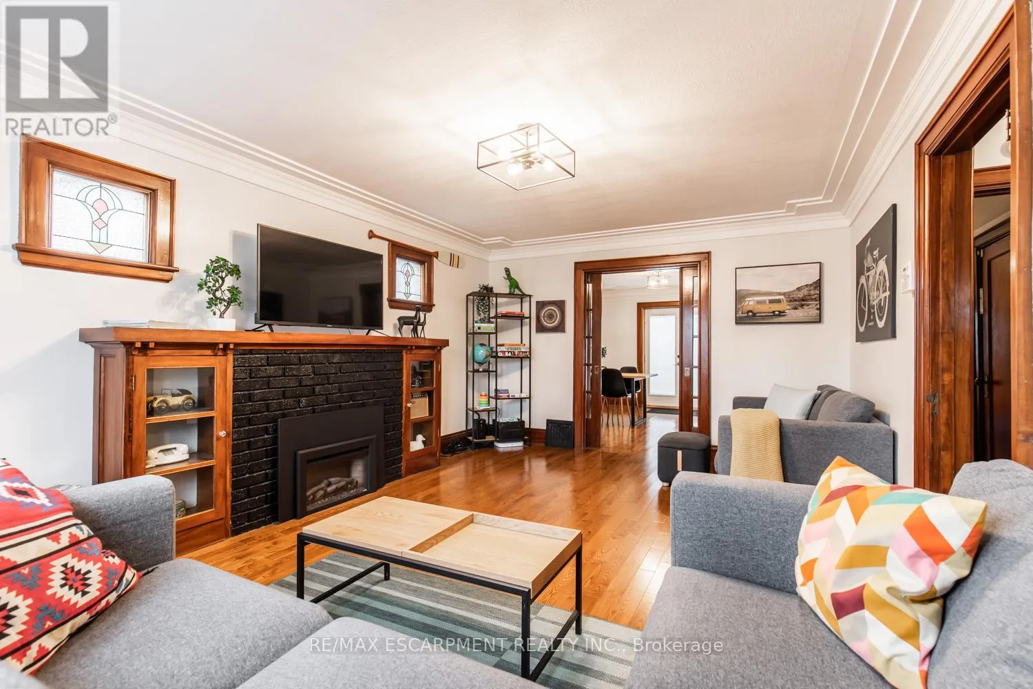 Hwy 8 or King St E. Charming 3-Bed, 2-Bath Stoney Creek Home with In-Law Suite! This bright and open main floor boasts a cozy living room with a fireplace, a kitchen featuring stainless steel appliances, and a spacious dining room with double doors leading to the back deck. Upstairs offers three generously sized bedrooms, a large 4-piece bathroom with laundry, and access to a quaint private balcony. A separate walk-out basement entrance leads to the in-law suite, complete with its own living area, bedroom, kitchen, and washer/dryer. Situated on a large 45 x 239.50 ft lot with a private deck, shed, and a detached garage! This home is close to Battlefield Park, downtown Stoney Creek, parks, shops, great schools, and offers easy highway access. (id:27476)