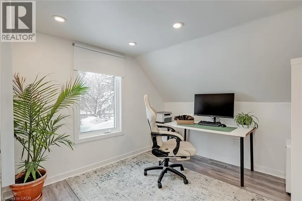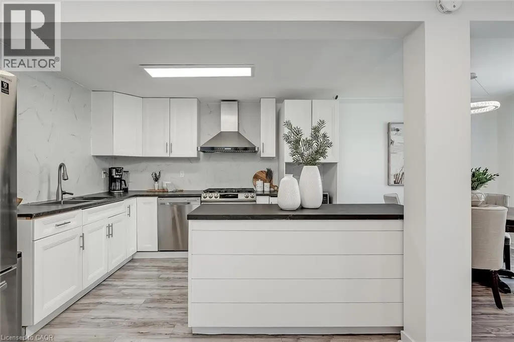 East of Ottawa Street, North of Cannon St E Perfect for first-time buyers, this move-in-ready two bedroom, one bath home is thoughtfully updated on a fully fenced lot. The welcoming front entrance features pot lights and wood-look flooring that continues throughout much of the home. The bright eat-in kitchen is beautifully updated with modern cabinetry, countertops, backsplash, island, updated lighting, and stainless steel appliances including a gas stove. The living room offers patio doors that walk out to a private backyard with a wood deck, shed, BBQ, and patio umbrella, ideal for entertaining or relaxing outdoors. The primary bedroom includes wood-look flooring, pot lights, and an organized closet system, while the second bedroom also features matching flooring and pot lights. The four piece bathroom offers a soaker tub, pedestal sink, vanity mirror, and pot light. The lower level provides laundry with a new dryer, built-in shelving, ample storage, and a rough-in for a future bathroom. Additional updates include exterior siding and eaves troughs, updated flooring, baseboards, trim, interior doors, pot lights, thermostat, exterior security system, updated electrical plus a 100 AMP panel, and has no rental equipment. Close to amazing shops, restaurants, amenities and all that this fantastic neighborhood has to offer. (id:27476)