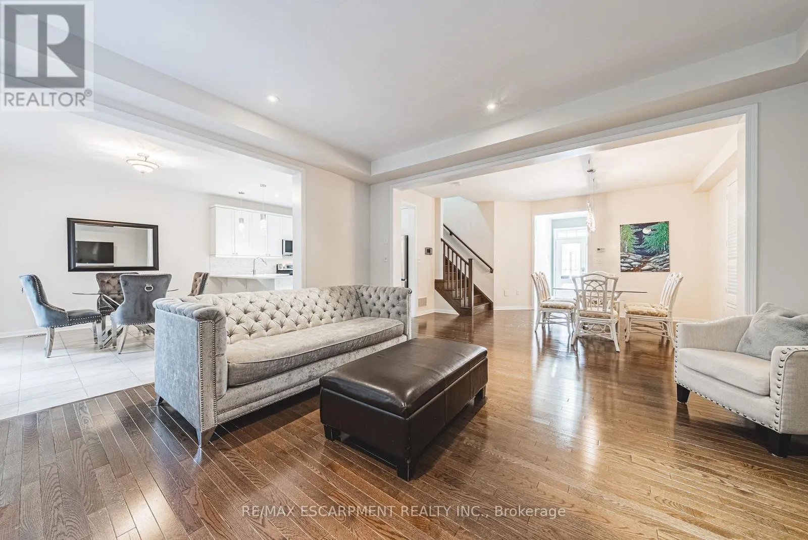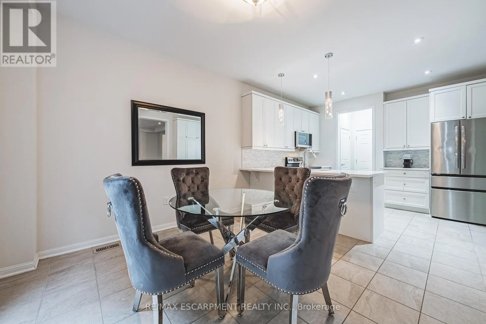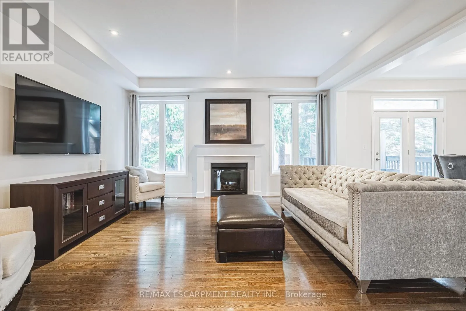 Cross Streets: Kitty Murray. ** Directions: Kitty Murray - Emick - Peer. Spectacular 4-bedroom home with walk-out basement, ideally located across from a park and within walking distance to schools. This beautifully designed residence features a sleek, open-concept layout with impressive kitchen including quartz countertops, stainless steel dishwasher and microwave, elegant marble backsplash, breakfast bar, kitchen dining area with patio doors to balcony, extended upper shaker cabinetry, full-wall pantry, pot drawers and a lazy Susan-perfect for both everyday living and entertaining. This family friendly home also offers a separate formal dining area, adding versatility and charm and open to the impressive great room showcasing coffered 9-foot ceilings, smooth finishes, rich dark-stained hardwood floors, and an abundance pot lighting, creating a refined, magazine-worthy ambiance. The welcoming foyer features a custom niche seating area and the main floor also includes a guest powder room. Enjoy this carpet free home with hardwood flooring & ceramic throughout the first and 2nd floors. The fully finished basement showcases laminate flooring, 4 piece bath, office, spacious Rec room with walk-out to the rear yard and ample storage. The second level boasts four generously sized bedrooms, including a luxurious primary suite with a spa-inspired ensuite featuring a glass shower, soaker corner tub, and elegant finishes. This 2nd floor also provides a second full bathroom and spacious laundry room for every day convenience. Close to all Ancaster has to offer, including shopping, restaurants, golf courses and more. Room sizes approximate. (id:27476)