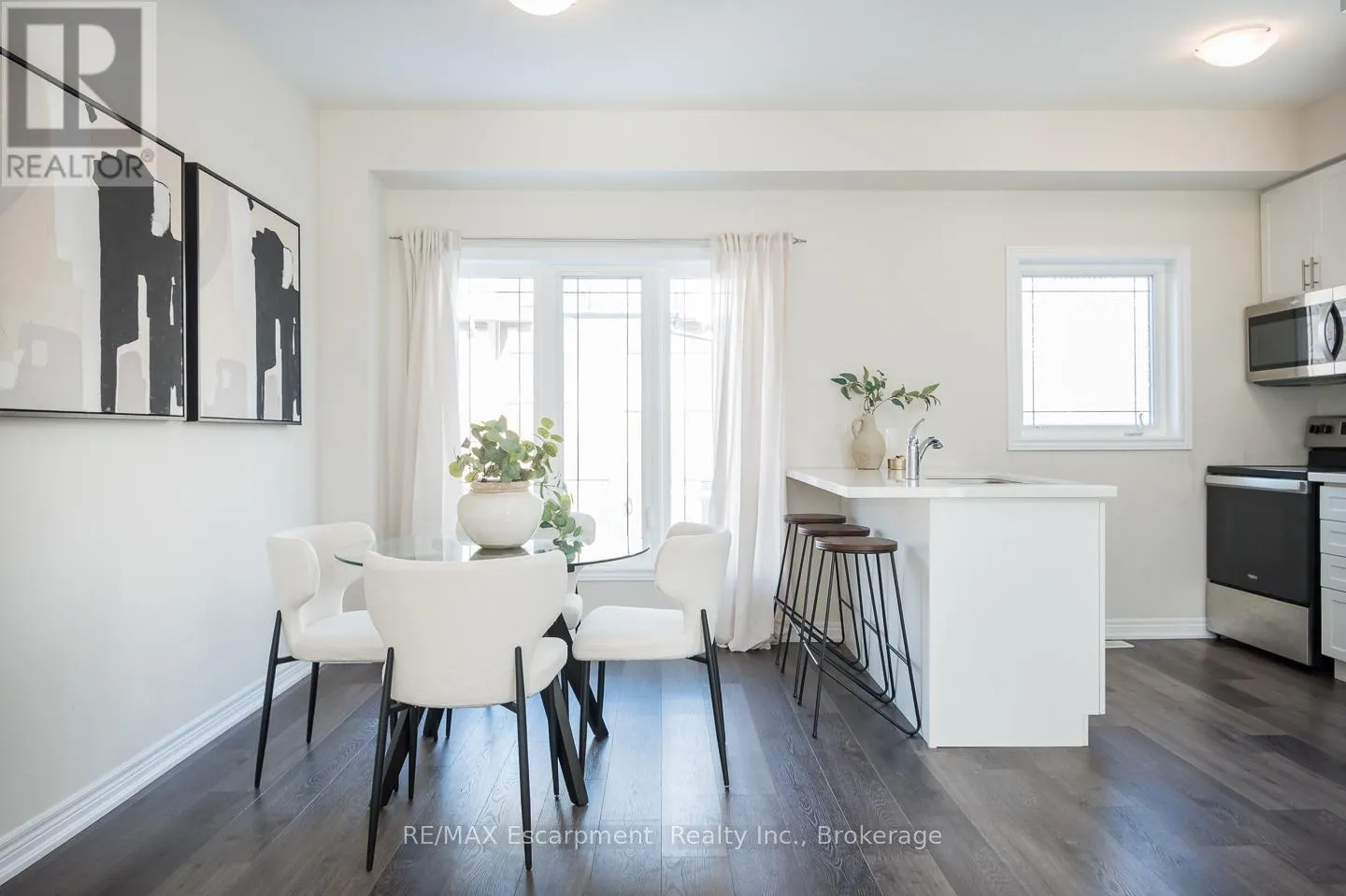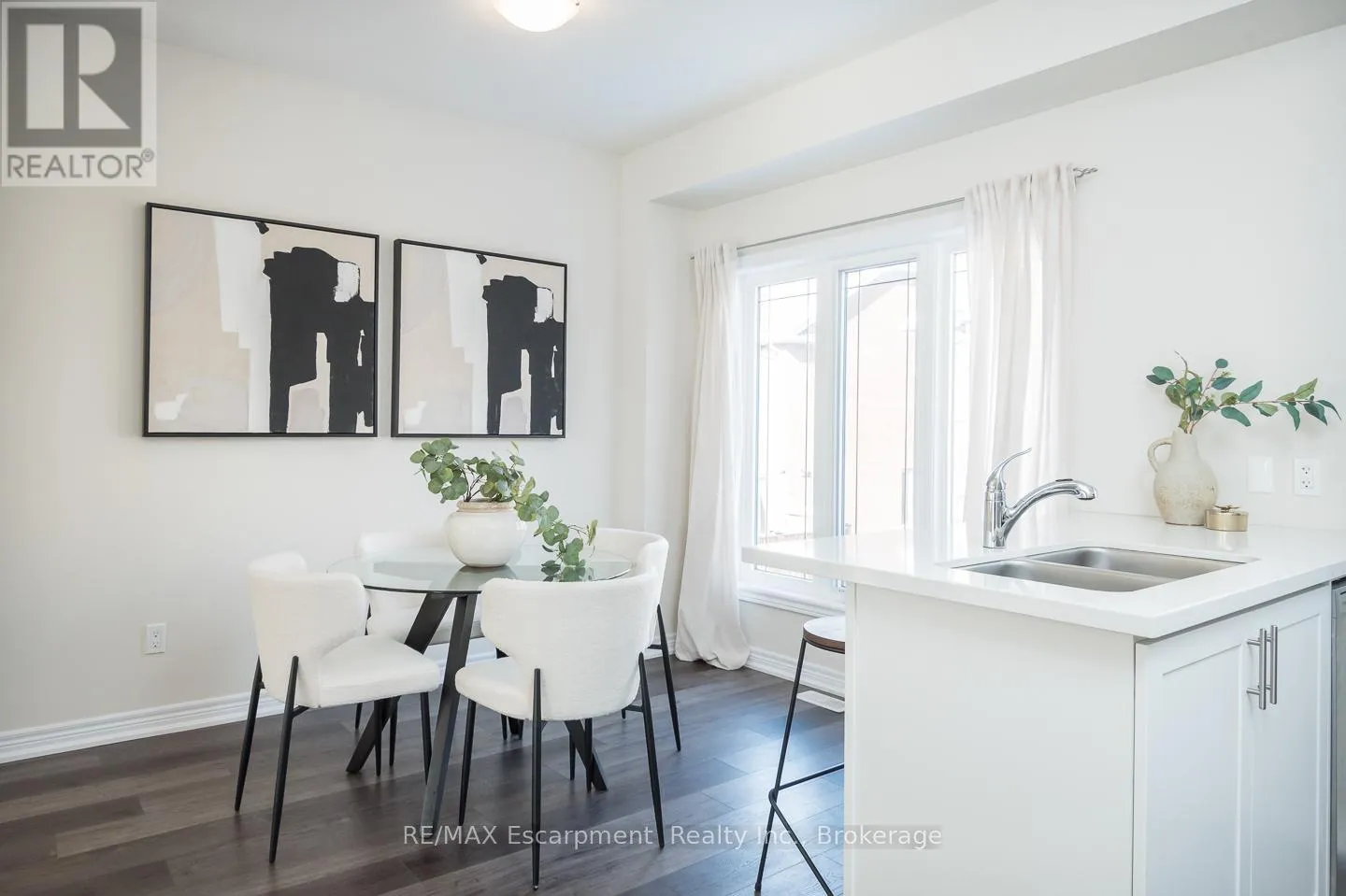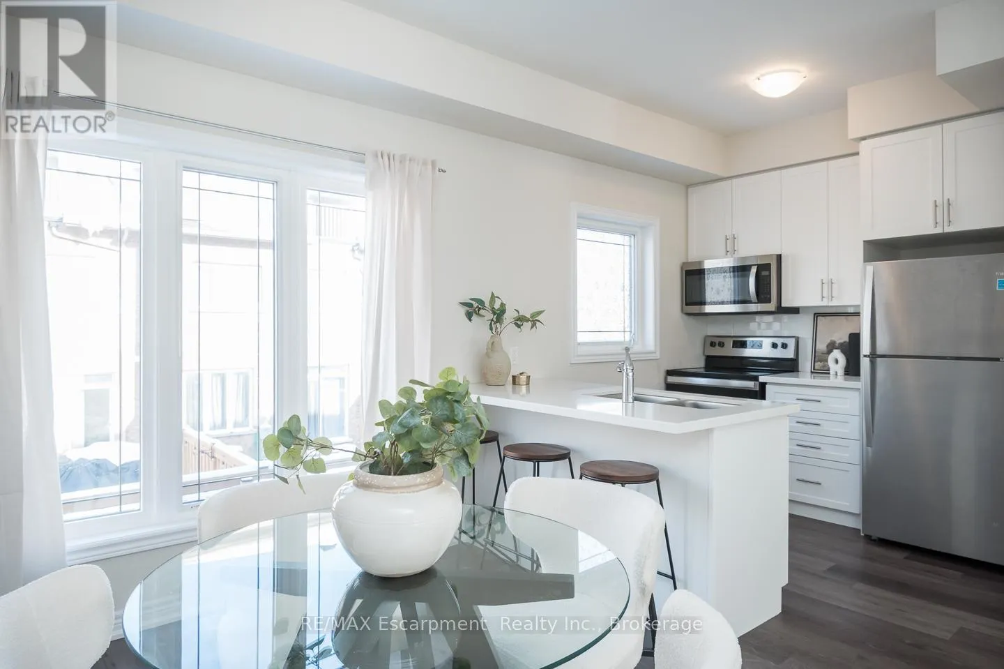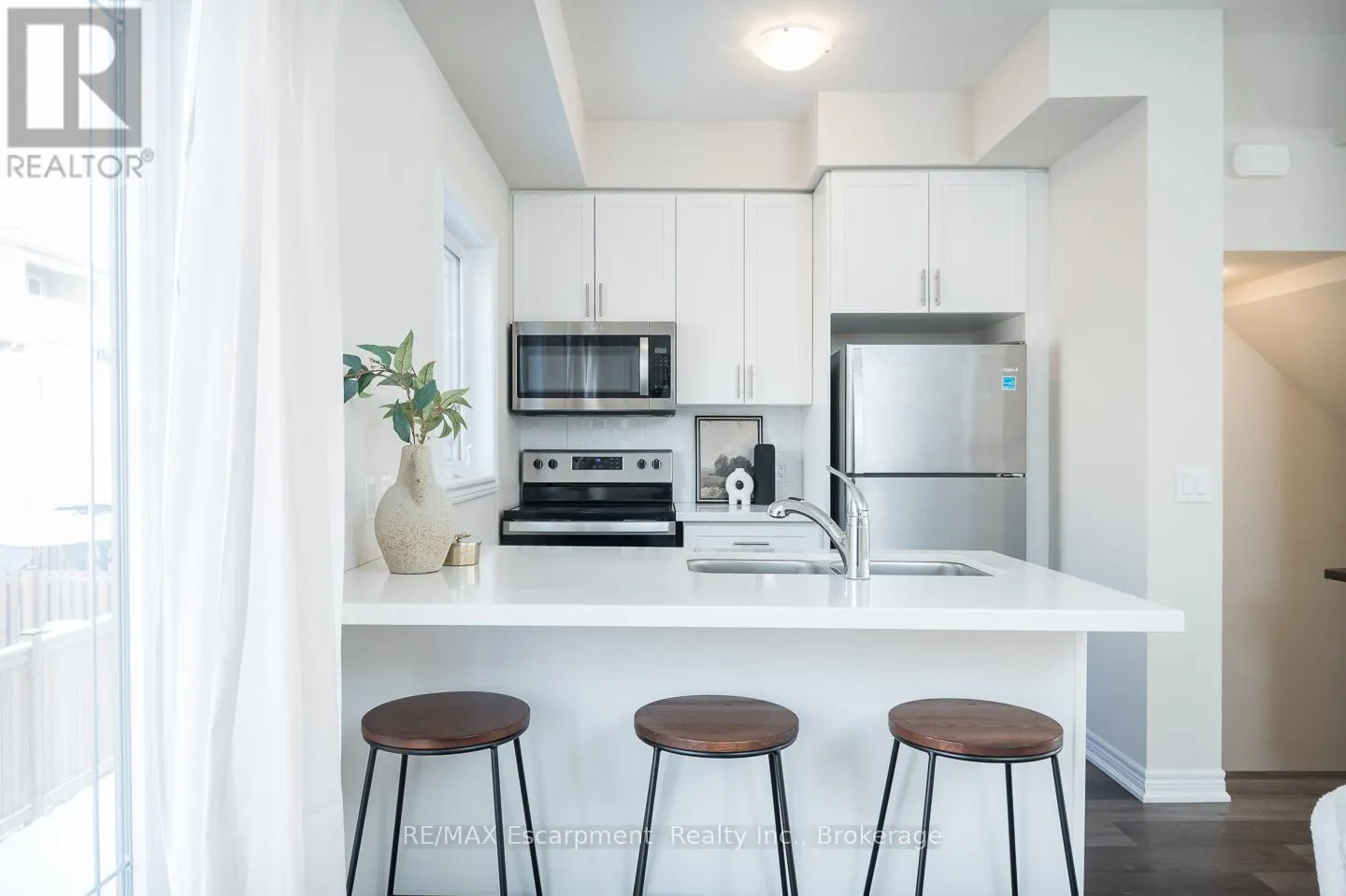 Cross Streets: Picardy and Talence. ** Directions: Upper Centennial Pkwy to Highland Rd W to Picardy. This newer built freehold townhome is thoughtfully finished throughout, offering a clean, modern layout designed for easy day-to-day living. Wide plank, wood-inspired flooring, pot lights, and large windows create a bright, cohesive main level anchored by a sleek kitchen with quartz countertops, stainless steel appliances, tiled backsplash, and a double undermount sink with breakfast bar seating. The upper level is well laid out with two bedrooms, including a primary suite complete with a walk-in closet and a three-piece ensuite featuring quartz finishes and a large window. A second bedroom with a double-door closet and convenient upper-level laundry add to the home's practical appeal, making the space equally suited to professionals or a young family. Outdoors you'll find a rear yard and parking conveniences that include an attached garage, and a driveway parking space, along with visitor parking for guests. Ideally located close to Saltfleet District High School, nearby parks, and everyday amenities enjoy all this move-in ready home has to offer. (id:27476)