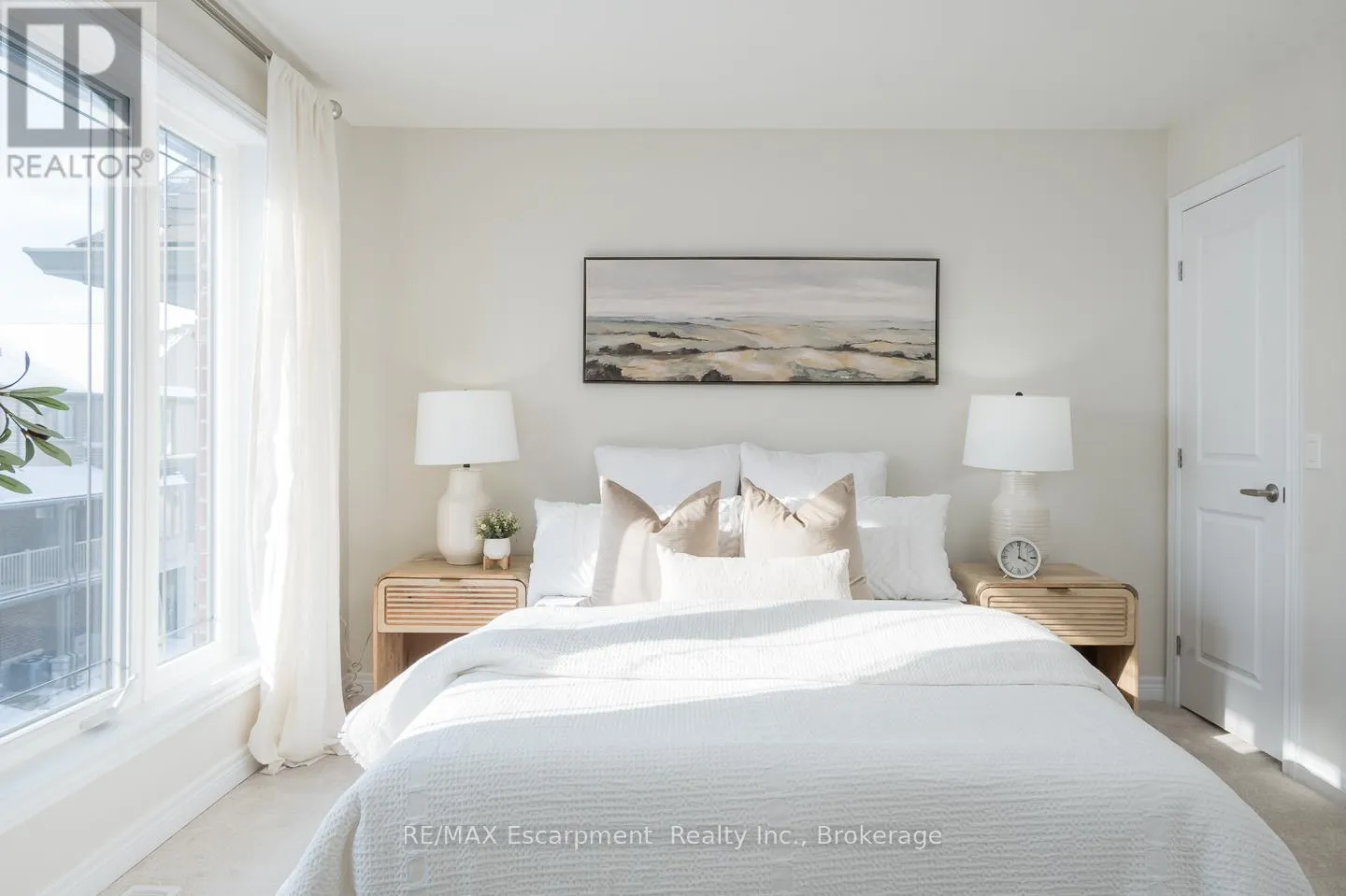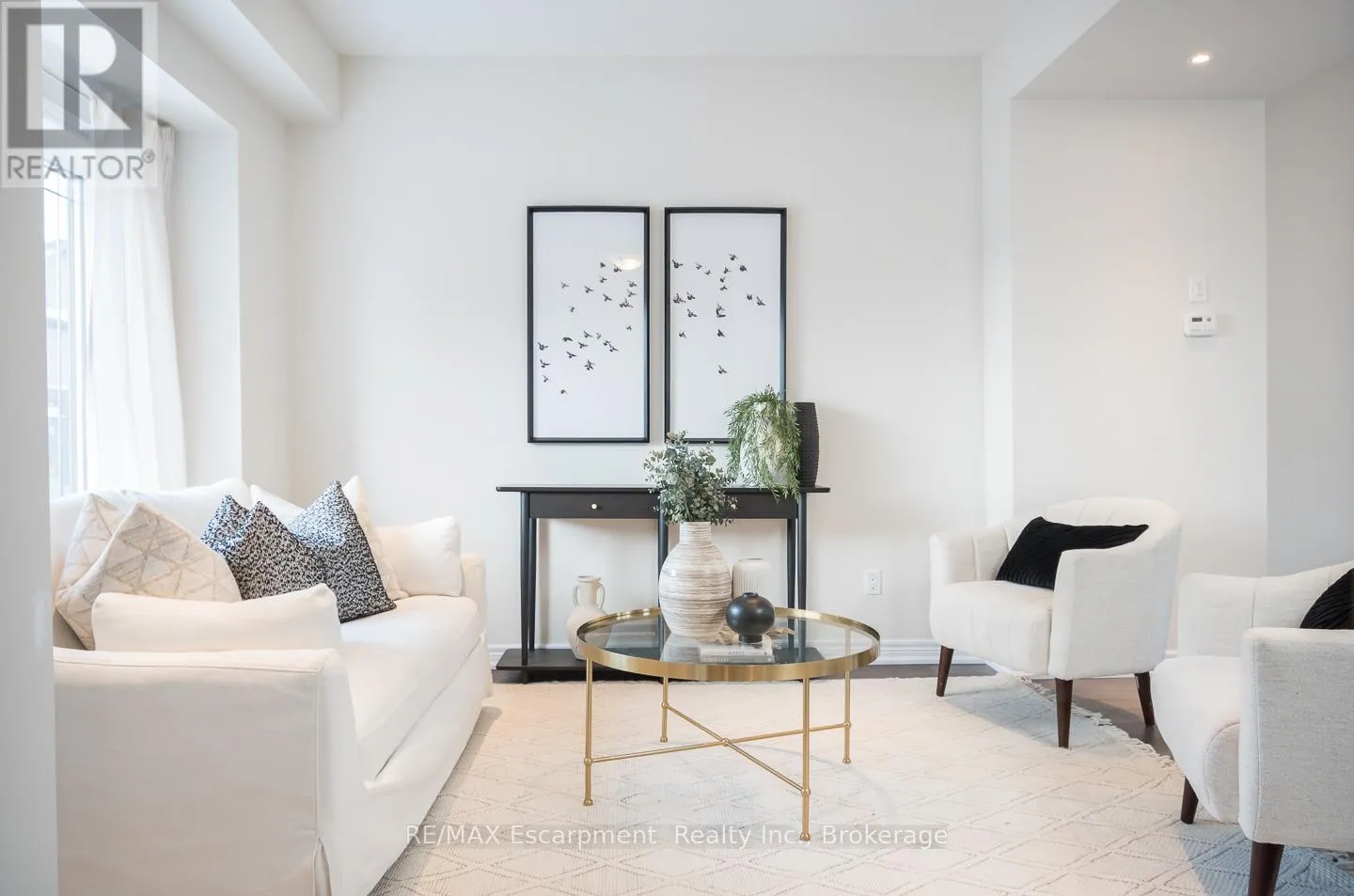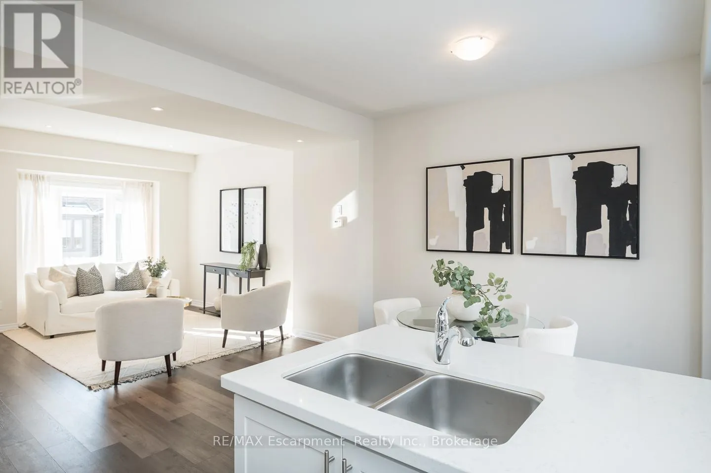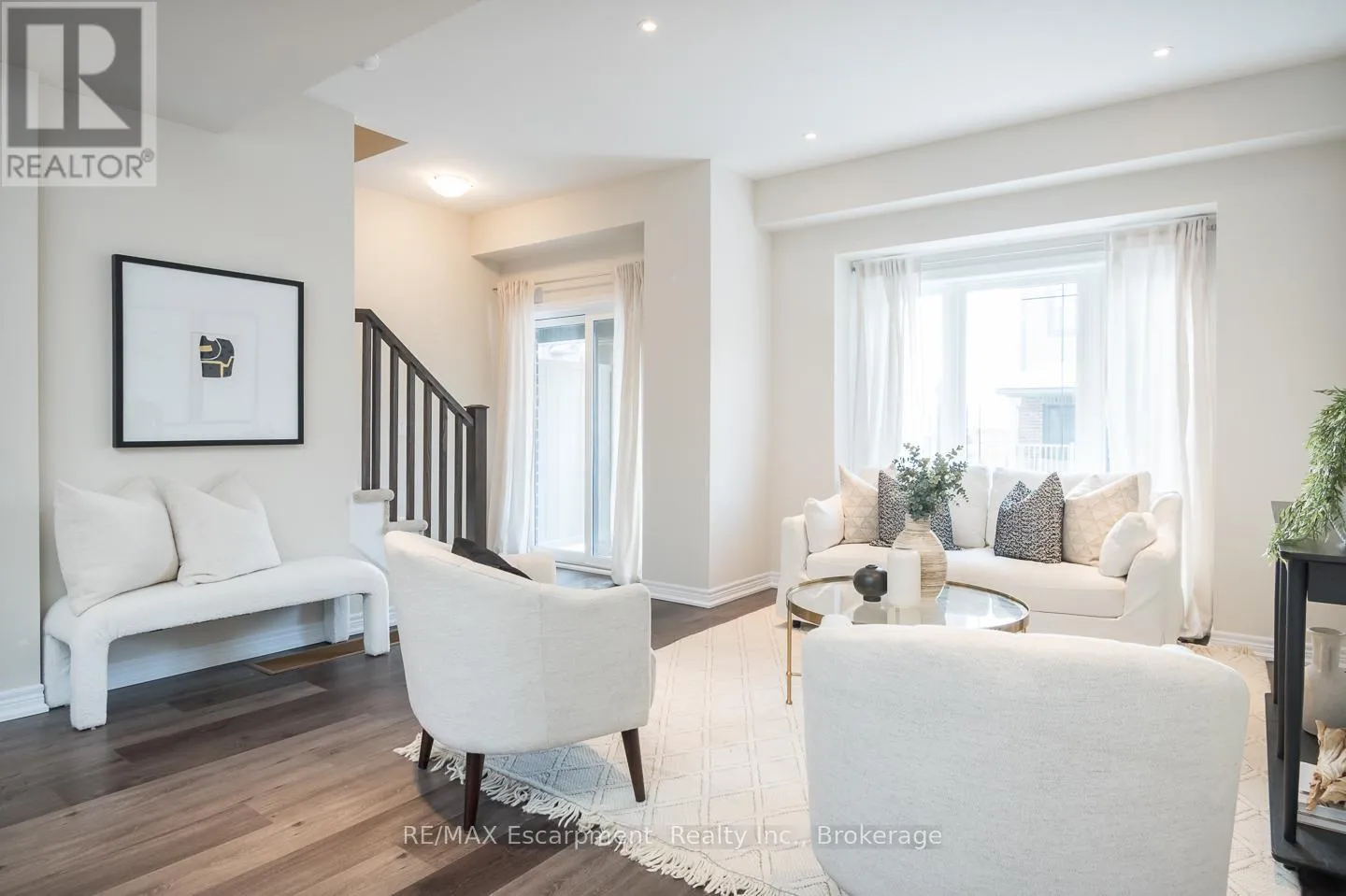 Cross Streets: Picardy and Talence. ** Directions: Upper Centennial Pkwy to Highland Rd W to Picardy. This newer built freehold townhome is thoughtfully finished throughout, offering a clean, modern layout designed for easy day-to-day living. Wide plank, wood-inspired flooring, pot lights, and large windows create a bright, cohesive main level anchored by a sleek kitchen with quartz countertops, stainless steel appliances, tiled backsplash, and a double undermount sink with breakfast bar seating. The upper level is well laid out with two bedrooms, including a primary suite complete with a walk-in closet and a three-piece ensuite featuring quartz finishes and a large window. A second bedroom with a double-door closet and convenient upper-level laundry add to the home's practical appeal, making the space equally suited to professionals or a young family. Outdoors you'll find a rear yard and parking conveniences that include an attached garage, and a driveway parking space, along with visitor parking for guests. Ideally located close to Saltfleet District High School, nearby parks, and everyday amenities enjoy all this move-in ready home has to offer. (id:27476)