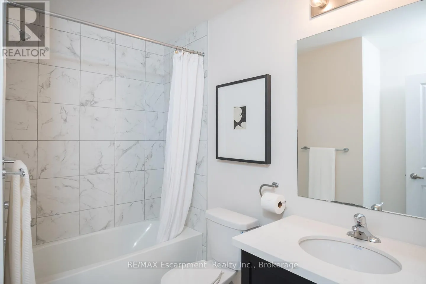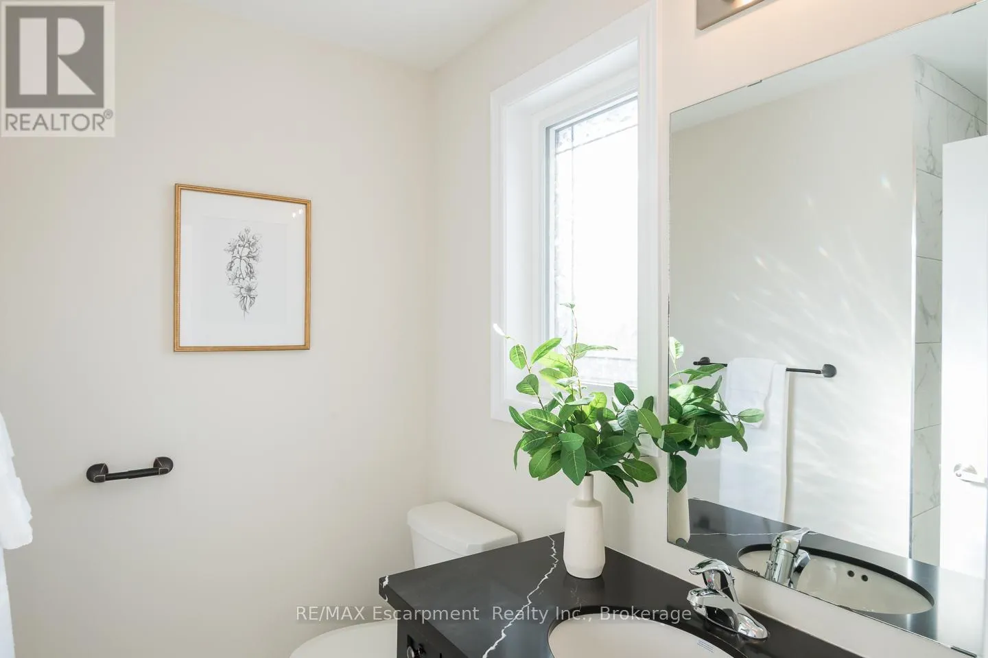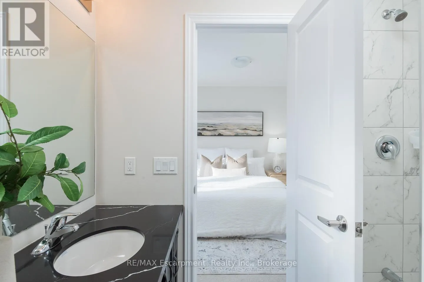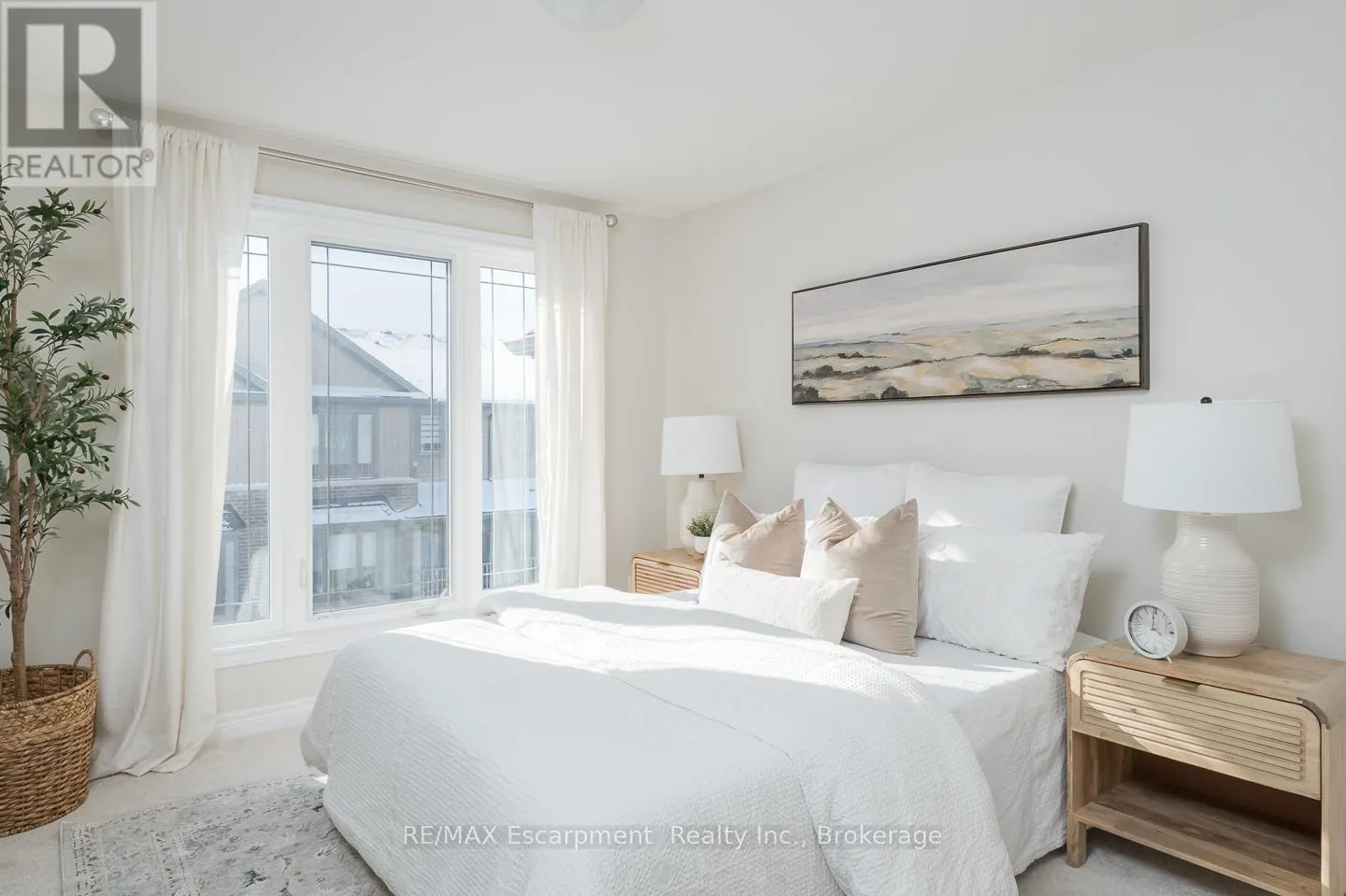 Cross Streets: Picardy and Talence. ** Directions: Upper Centennial Pkwy to Highland Rd W to Picardy. This newer built freehold townhome is thoughtfully finished throughout, offering a clean, modern layout designed for easy day-to-day living. Wide plank, wood-inspired flooring, pot lights, and large windows create a bright, cohesive main level anchored by a sleek kitchen with quartz countertops, stainless steel appliances, tiled backsplash, and a double undermount sink with breakfast bar seating. The upper level is well laid out with two bedrooms, including a primary suite complete with a walk-in closet and a three-piece ensuite featuring quartz finishes and a large window. A second bedroom with a double-door closet and convenient upper-level laundry add to the home's practical appeal, making the space equally suited to professionals or a young family. Outdoors you'll find a rear yard and parking conveniences that include an attached garage, and a driveway parking space, along with visitor parking for guests. Ideally located close to Saltfleet District High School, nearby parks, and everyday amenities enjoy all this move-in ready home has to offer. (id:27476)