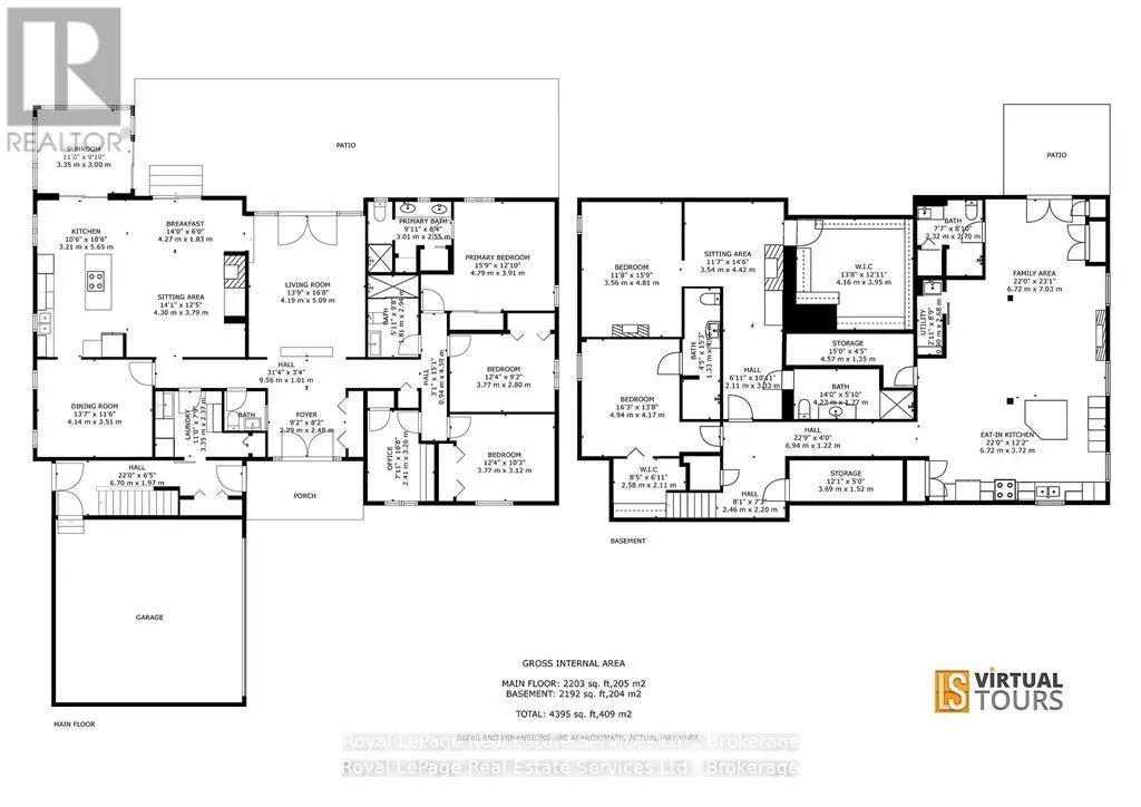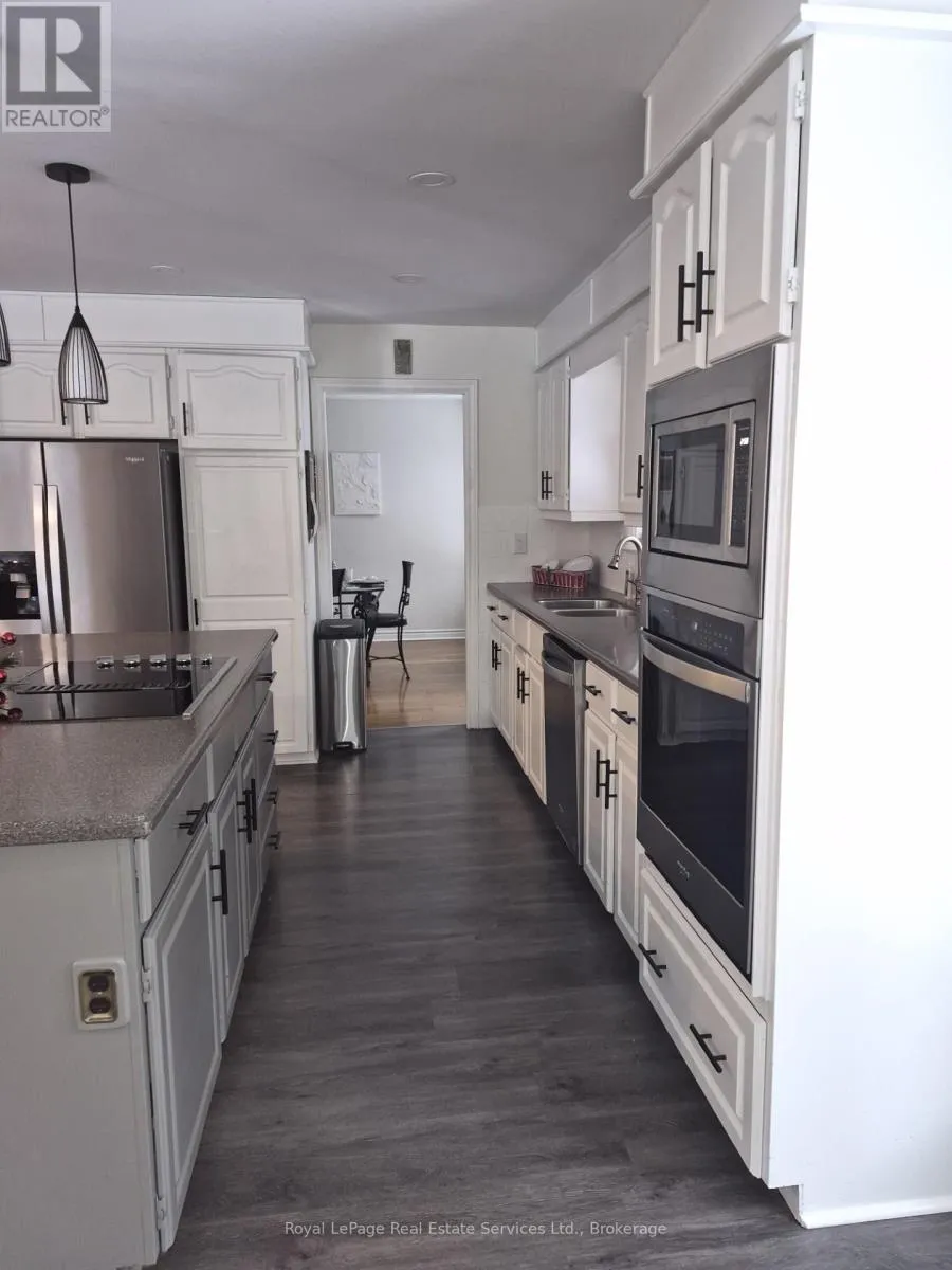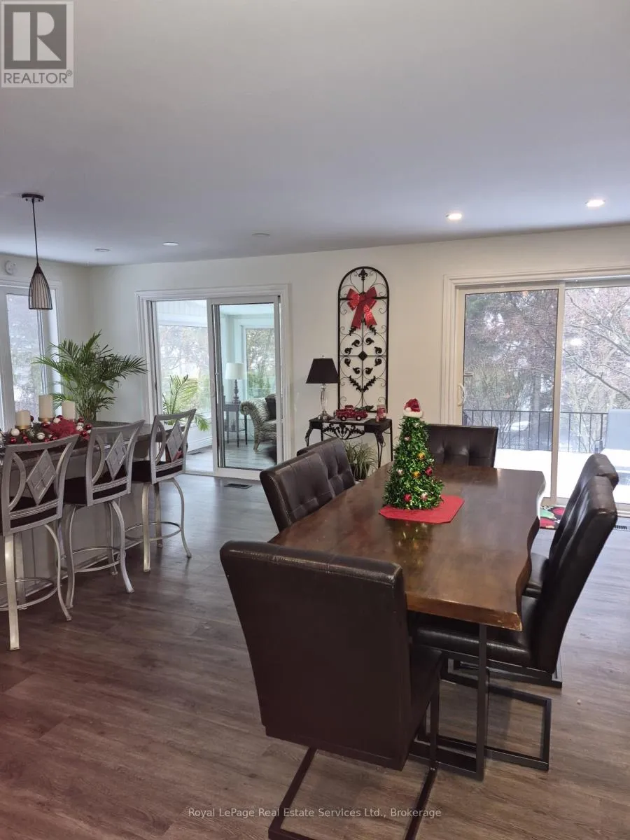 Dundas St. East & Riley Discover luxury and lifestyle in this beautifully crafted custom bungalow, situated on an impressive 0.45-acre lot just minutes from downtown Waterdown. This home offers nearly 5,000sq. ft. of living space, featuring 5 bedrooms (3 on the main floor / 2 on lower level) and 6 bathrooms (3 + 3). The spacious design provides a flexible floor plan, ideal for a multi generational family or in-law suite. As you approach the property, you'll be greeted by oversized trees and thoughtfully designed landscaping, complemented by ample parking. The main entrance features custom doors and a covered front entry. The main foyer overlooks the sunken great room, which has French doors opening to the flagstone patio with an awning. The main floor also includes a private office, perfect for remote work, and a separate formal dining room. The open-concept kitchen and family room create an entertainer's delight, equipped with large glass sliders that lead to a bright sunroom. The family room features a stunning granite wall and a gas fireplace. The modern lower level is finished to perfection, featuring 2 spacious bedrooms, each with walk-in closets and personal 3-piece en-suites. The open-concept kitchen and family room flow seamlessly to a walkout patio, providing an excellent setting for relaxation. With a separate entrance and privacy, this lower level also has lots of room for additional family or as an in-law suite. Step outside to your own backyard oasis, complete with a cozy fire pit area and multi-level patios made of flagstone and interlock, all enclosed by a fully fenced yard for your private enjoyment. The professionally landscaped exterior features natural rockery and mature gardens, enhancing the home's impressive curb appeal. Agent related to the owner. Additional highlights include: - 2 kitchens and 2 laundry rooms- 2.5 car garage- Irrigation system- Backyard shed- A full-house generator. (id:27476)