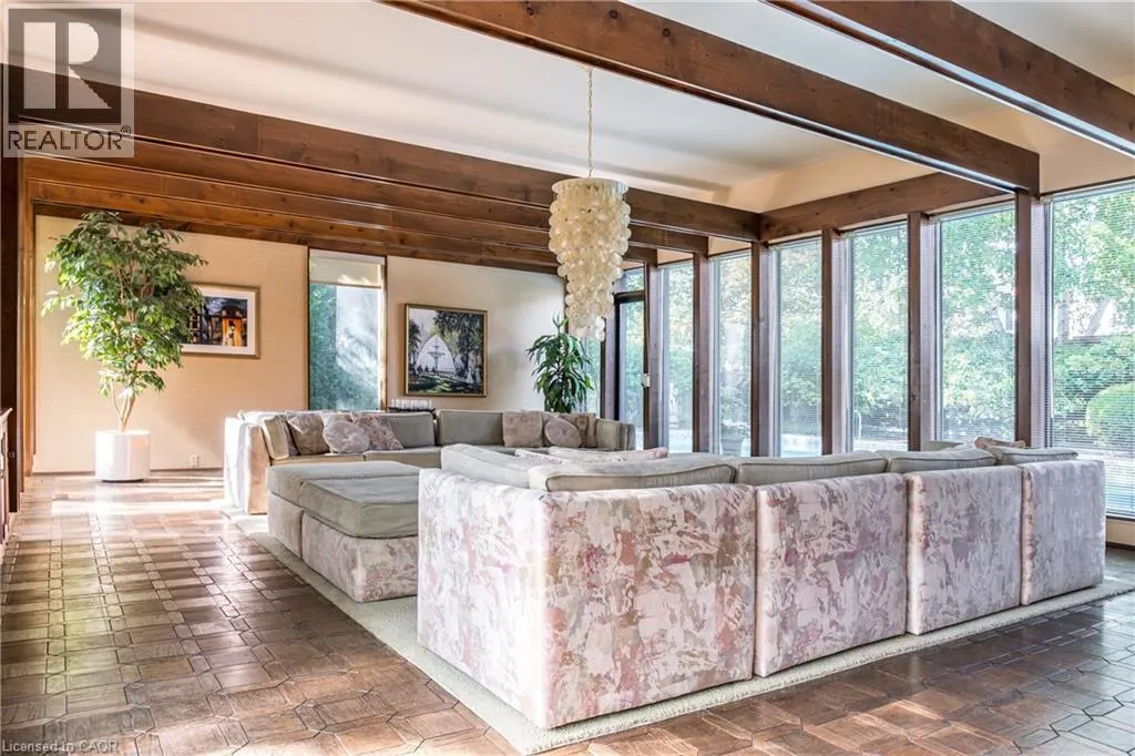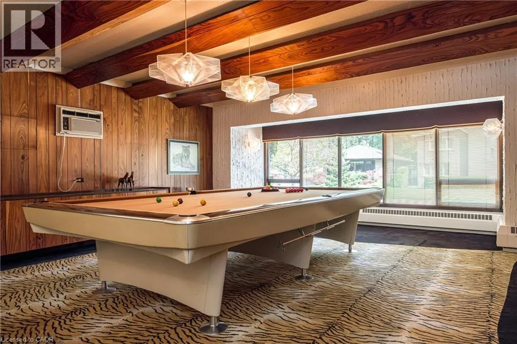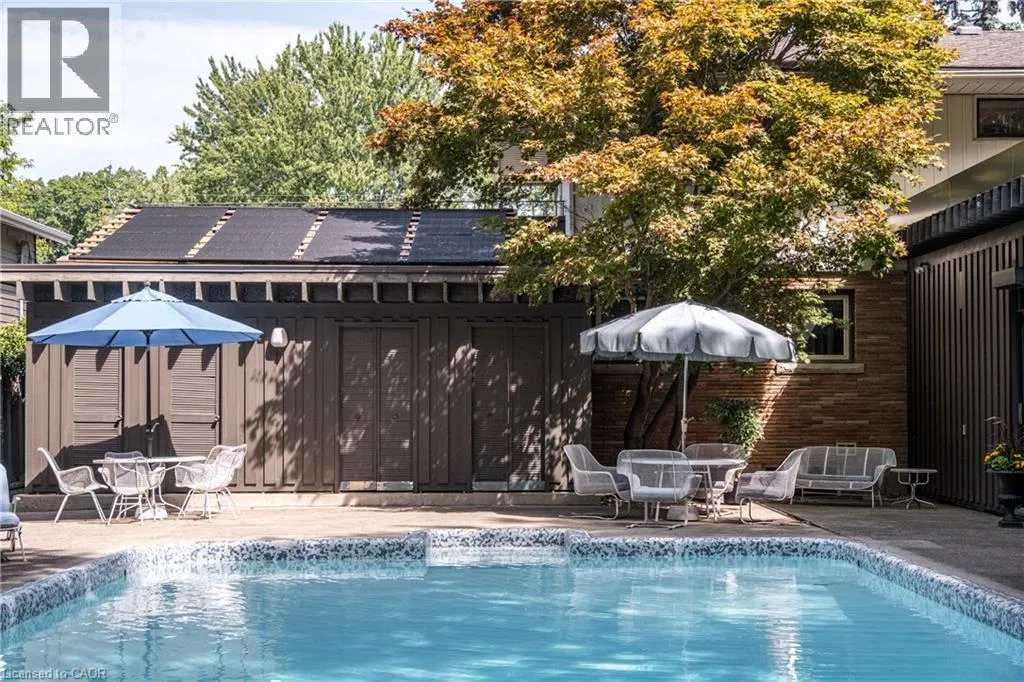 Paradise Rd N to Freeland Crt Magnificent Mid-Century Modern on quiet court near Cootes. Cherished by the original owners for 69 years, this one-of-a-kind two-storey home was thoughtfully designed for entertaining and family living. Offering over 3,657 sqft the home features an impressive 20x46 ft addition with a dining room that seats 14 guests and a spectacular family room with beamed ceilings surrounded by floor-to-ceiling windows overlooking the pool and private garden oasis, truly an entertainerâs dream. Built in 1956 the homeâs design reflects timeless quality with high-end finishes and distinctive décor. Enter the foyer with slate floors and into the sunken living room with stone fireplace, and up to a dinette with custom built-in cabinets and stunning marble countertop. The retro kitchen features quartz counters, double ovens, cooktop, and built-in banquette that leads to a massive games room, which was converted from a double car garage, with huge pool table for family fun of all ages. Step out to the pool cabana with convenient kitchenette, 2 change rooms, 3-pc bath, and out to the lush private garden oasis with huge 20X40 ft pool, heated through rooftop solar panels, multiple seating areas and custom designed fence with cool coloured inserts. The main floor also includes a private office and 2-pc bath with marble counters, and on the second floor you will find 4 spacious bedrooms, including the primary with 3-pc ensuite and walk out to a rooftop terrace, plus a 4-pc retro family bath, and walk-in linen closet. The finished basement offers even more living space with an office, recreation room with wet bar, 2-pc bath, laundry, and ample storage. Perfectly located just steps to Cootes Paradise, Princess Point, Waterfront Trail, Churchill Park, schools and Westdale Village, shops, restaurants, amenities, and theatre. Minutes to McMaster University & Hospital, Go-transit & highway access, make this a super convenient Westdale North location to call home. RSA (id:27476)
