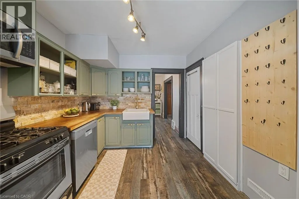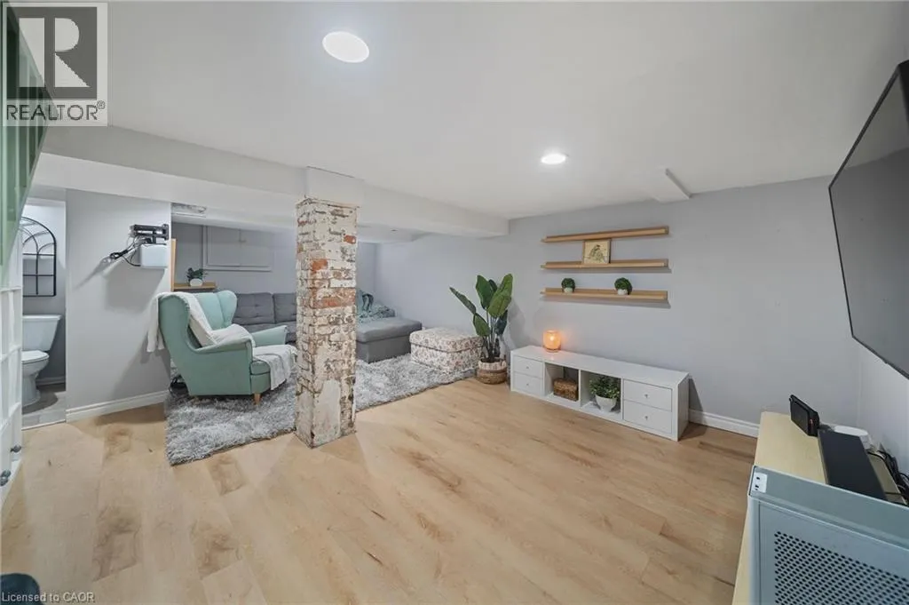 North onto Cope Street from Main Street E. Welcome to 22 Cope Street, a charming 1.5-storey brick home tucked into a quiet, central Hamilton neighbourhood with quick access to the Red Hill Valley Parkway for easy commuting across the city, the GTA, or Niagara. This warm and inviting home blends timeless character with thoughtful modern updates. The upper level features two spacious bedrooms with deep closets and a full newly updated bathroom. On the main floor, youâre welcomed from the covered front porch into bright living and dining spaces filled with original trim, a decorative brick fireplace, and an easy, functional layout. The kitchen offers stainless steel appliances, a stone backsplash, and butcher block counters, connecting seamlessly to a rear mudroom and a versatile additional main-floor room that works beautifully as a playroom, office, or third bedroom. Downstairs, the fully finished basement provides excellent bonus living space, laundry and storage, plus an added two-piece bath. Outside, the backyard is private and well cared for, featuring newer fencing, a concrete patio, and updated gates, perfect for relaxing, entertaining, or enjoying a bit of greenery in the city. Significant improvements have been completed throughout ownership, with over $25,000 in recent updates including sewer lining, back-flow protection, basement flooring and levelling, plumbing upgrades, a beautifully renovated bathroom, and more, offering peace of mind for the next homeowner. Located close to parks, trails, schools, and everyday amenities, 22 Cope Street is a wonderful opportunity to enjoy a move-in-ready home with character, comfort, and long-term value in the heart of Hamilton. (id:27476)