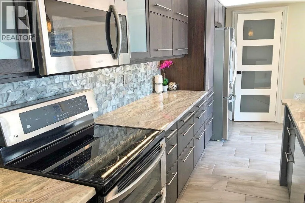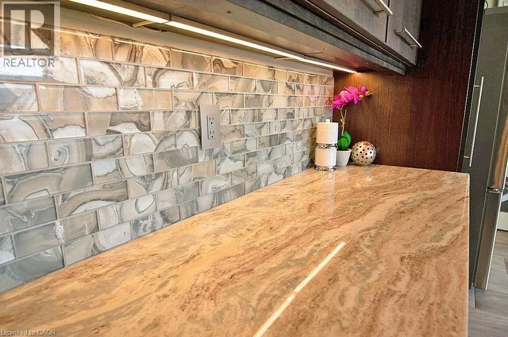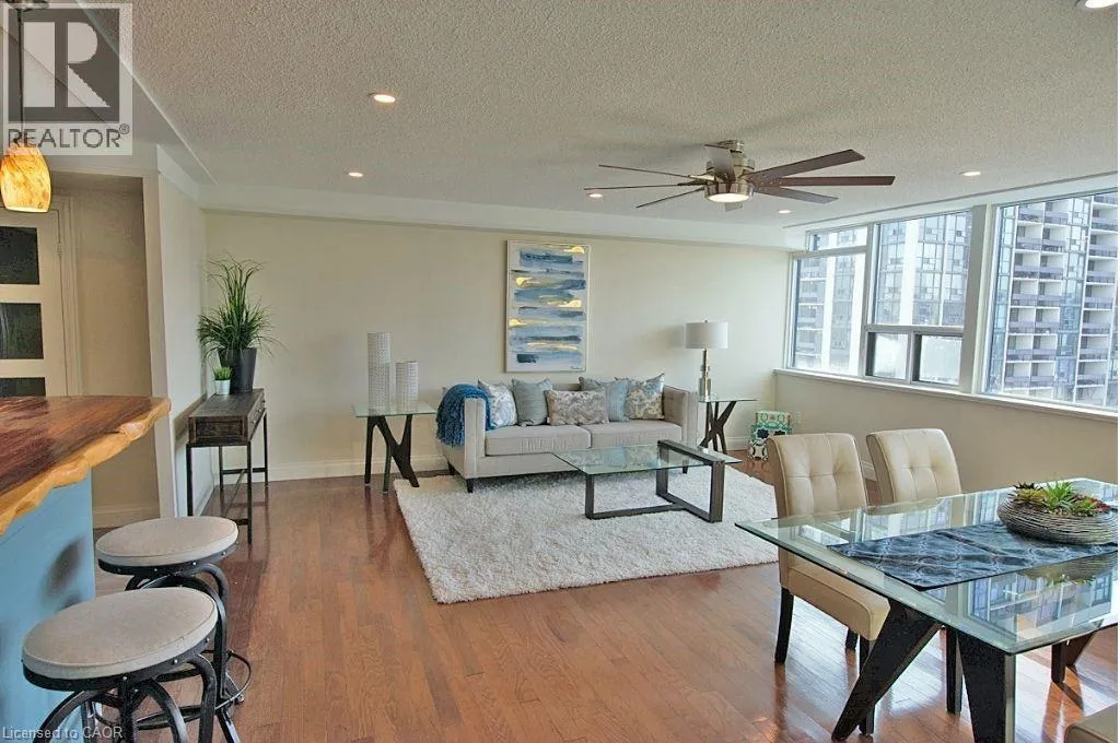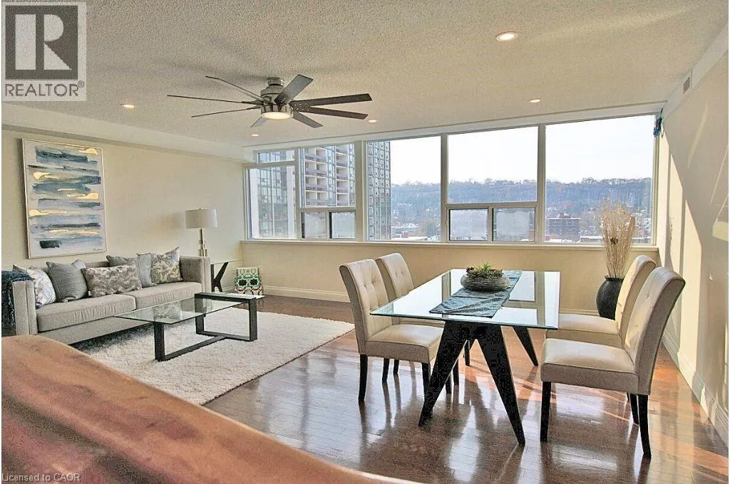DUKE BETWEEN BETWEEN BAY AND CAROLINE. Welcome to this beautifully updated penthouse suite offering over 1,000 sq ft of bright, well-designed living space. Located on the top floor of the well-managed The Durand, this 2-bedroom, 2-bathroom home combines comfort, style, and peace of mind with major building and mechanical upgrades already complete. The open-concept layout is ideal for everyday living and entertaining, featuring a renovated kitchen with stainless steel appliances, ample cabinetry with soft-close drawers, and a striking live-edge breakfast bar. Large windows throughout the unit flood the space with natural light and showcase beautiful Escarpment views. In-suite laundry adds everyday convenience. Recent updates include a custom furnace,, along with building-wide improvements such as a new roof (2025), windows & common areas (last 8-10 yrs), HVAC piping within the building (past 5 yrs) and updated exterior façade- offering long-term value and confidence for the next owner. Residents enjoy excellent amenities including a saltwater pool, fitness room, BBQ area, sauna and welcoming common spaces. One parking space included (very conveniently located). Ideally situated with easy access to public transit, major highways, hospital (within walking), and all that downtown Hamilton has to offer. A move-in-ready penthouse suite in a prime location, this is easy condo living at its best. *Most photos are prior to current tenants. (id:27476)