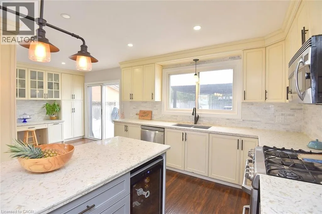 North on Garth from the LINC, right on Limeridge, left on Lynbrook, right on Rolston Beautifully finished 5 bedroom 2 storey home in prime West Mountain location. Open concept main floor with updated kitchen, quartz counters, tumbled marble backsplash and stainless appliances. Kitchen features large centre island / breakfast bar with seating for 4, separate wine fridge, desk area and tons of quality cabinetry. From the kitchen, walk out to your backyard oasis with inground pool, exposed aggregate concrete pool surround, lounging decks both covered and uncovered & natural gas bbq. Backyard storage shed could be used as a cabana with attached covered deck area. Your front livingroom looks out onto Rolston community forest, Captain Cornelius Park, Westmount Highschool / Westwood & Westview Elementary schools & Westmount Rec Centre. Originally a 4 bedroom home, the upper floor has an addition over the garage which adds a large primary suite, with oversized closet and 3piece ensuite bath. All 4 other bedrooms are large, perfect for the growing family, with another 4pc main bath. In the lower level you have an awesome recreation room with gas fireplace and full wetbar with keg fridge - great spot to watch the game and catch up with friends. This home is a year-round entertainer's dream! Inside access from single car garage, large double wide drive with parking for 4 cars. Quick highway access by way of the LINC @ Garth. Close to Upper James retail corridor. (id:27476)