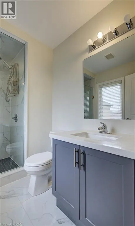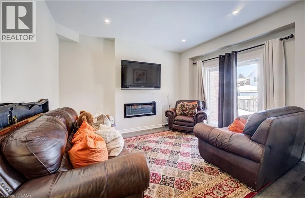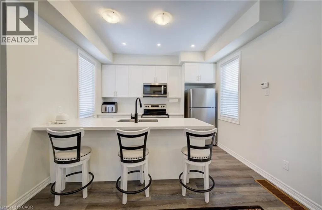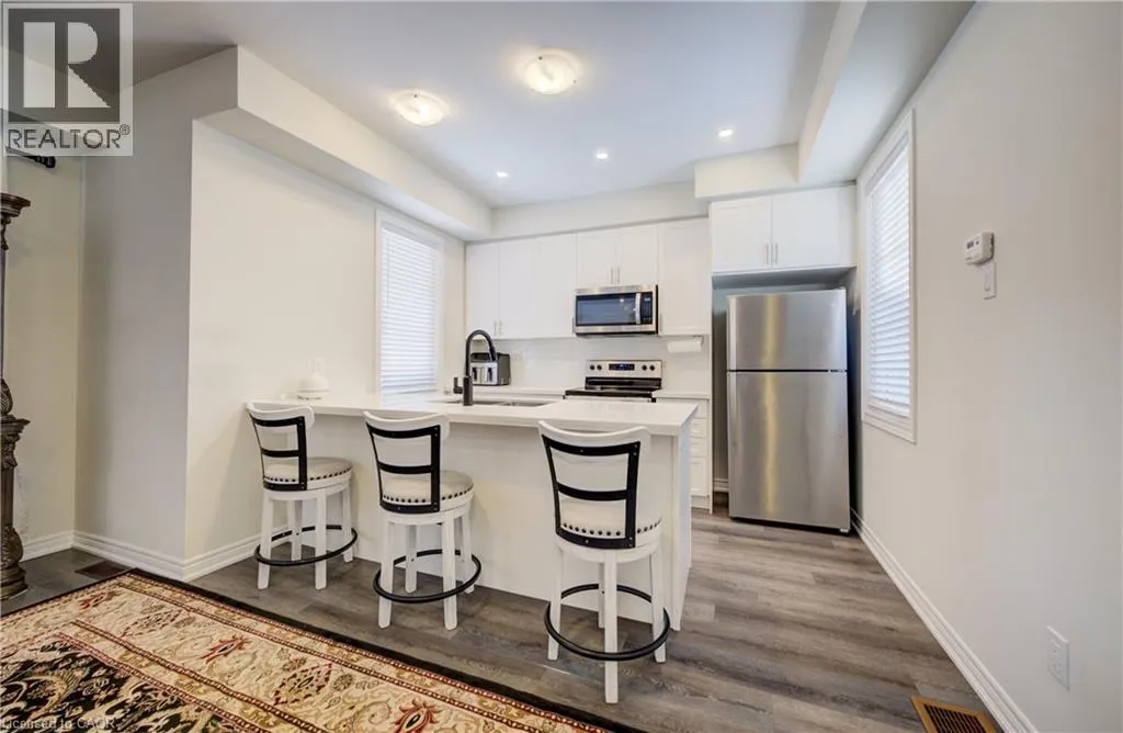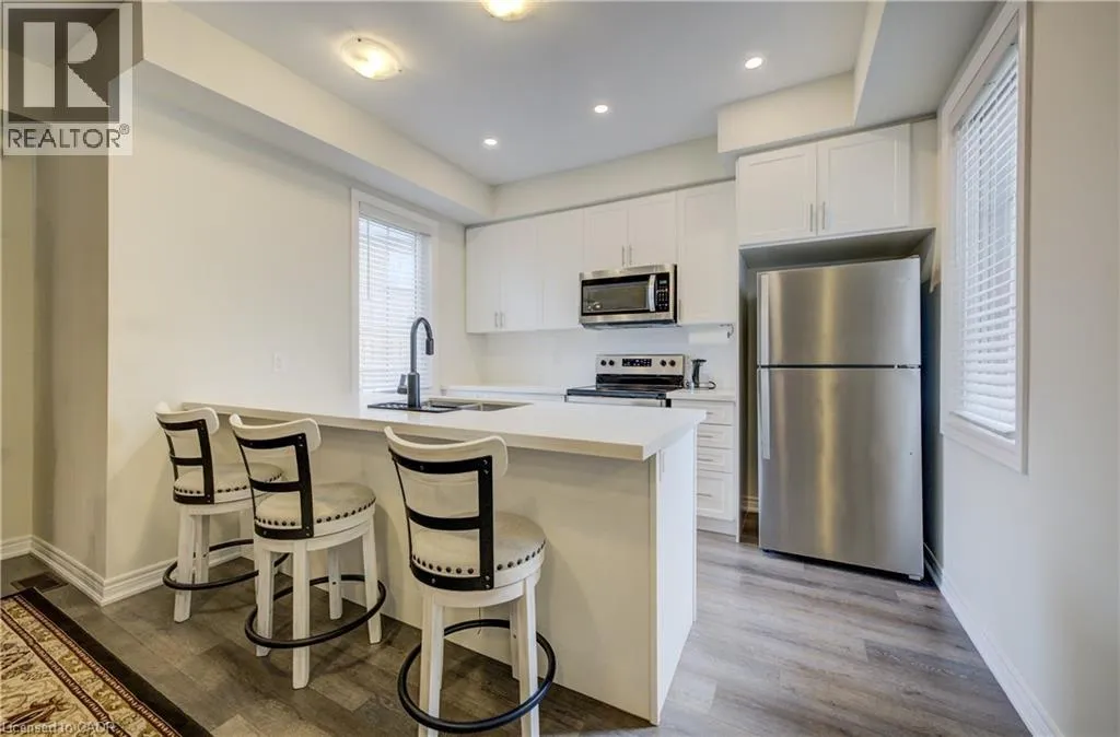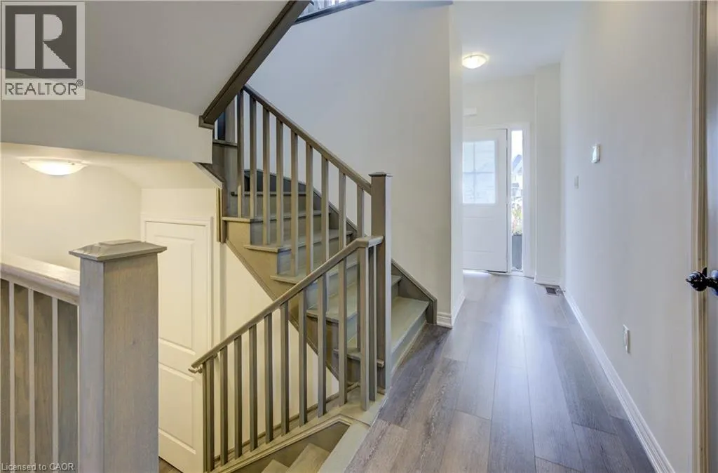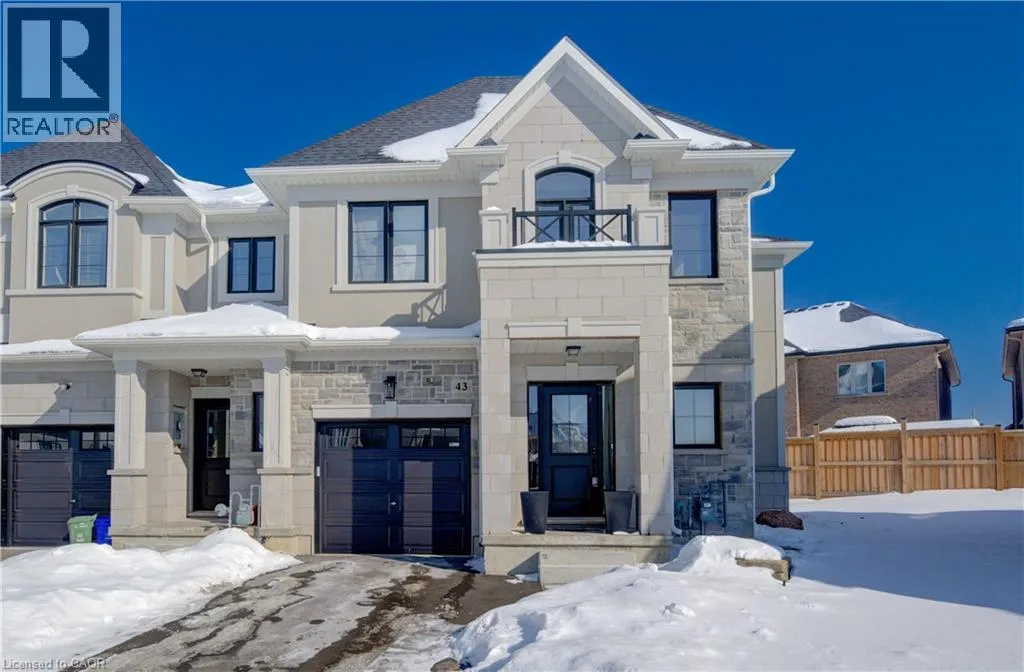 Upper James St to Regina Dr to DiCenzo Dr to 43 Genoa Dr OR from Stone Church Rd E, South on DiCenzo Dr., East on Genoa Dr to 43 Genoa Dr Beautiful end unit freehold townhome, new in 2024, NO condo fees. Custom townhome on extra large pie shape lot in Stonegate Community. Features magnificent stone and stucco architecture with beautiful front elevation with covered porch and faux balcony. Interior features soaring 9 foot ceilings on main level. Custom end unit floor plan with extra windows and bump out on all 3 levels for extra square footage made possible by wide and private pie shape lot. Open concept kitchen, large living room, chef's kitchen with cabints made wider and deeper for larger fridge, taller uppers cabinets, lower pots & pans drawers, peninsula with breakfast bar, Quorastone quartz countertops. This home is carpet free with beauiful and durable,modern vinyl plank floors. Bright upper level features 3 spacious bedrooms with larger windows, including primary bedroom with ensuite bath, walk-in closet plus bonus loft/office area. New owners get balance of Ontario New Home Warranty. Large basement with endless possibilites including rough-in extra bathroom plumbing and energy efficient features. Don't miss this fantastic home. (id:27476)