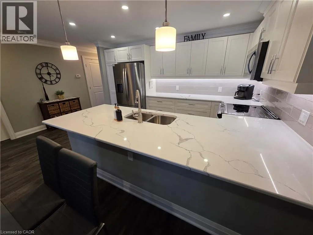 South East Corner of Garth Street & Rymal Road West Welcome to your new home in the peaceful and friendly 55+ gated community of St. Elizabeth Village. This beautifully renovated former model home offers 1,007 square feet of comfortable living space thoughtfully designed for easy living and entertaining. Step inside to an open concept layout where the bright kitchen overlooks the living and dining areas, creating a warm and inviting atmosphere perfect for gatherings or quiet evenings at home. Large windows fill the space with natural light and provide a lovely view of the open green area just beyond your back door. The home features two spacious bedrooms and a stylish bathroom complete with a walk in tiled shower. Renovated in 2024, it showcases modern finishes, fresh flooring, and updated fixtures throughout, giving it a crisp and contemporary feel. Enjoy the sense of community and care that St. Elizabeth Village is known for, with access to wonderful amenities, well maintained grounds, and a welcoming neighborhood spirit. This is the perfect place to relax, connect, and enjoy the best of retirement living. CONDO Fees Incl: Property taxes, water, and all exterior maintenance (id:27476)
