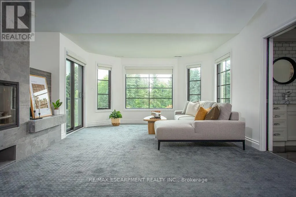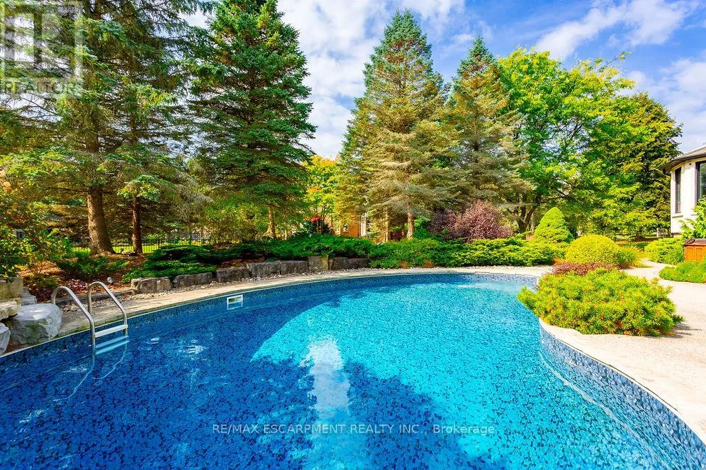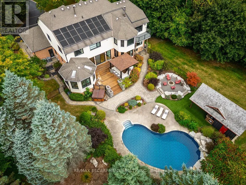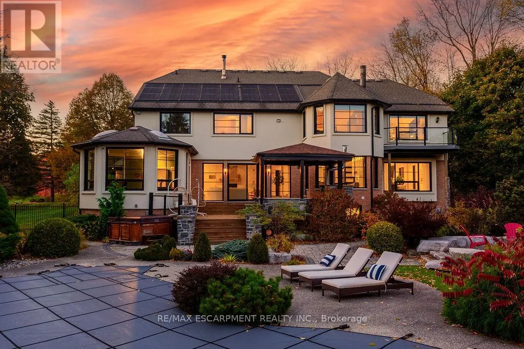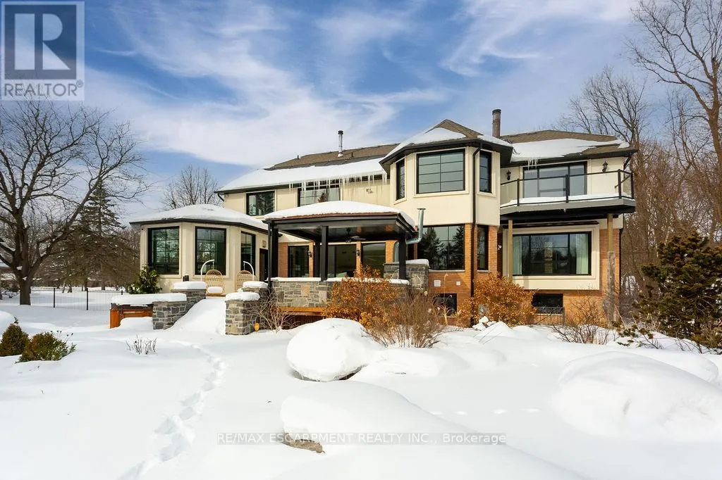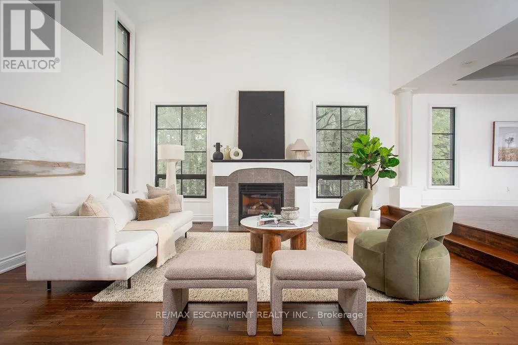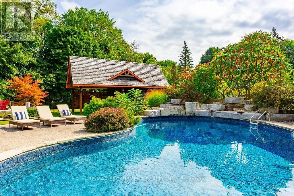 Cross Streets: Carlisle Road/Centre Road. ** Directions: Carlisle Road - Flamborough Hills - Acredale - Blackberry. Set on a prestigious estate street, this exceptional residence offers comfort, connection, and quiet luxury in one of Carlisle's most welcoming and safe neighbourhoods-where evening walks, community spirit, and everyday ease define the lifestyle. A soaring 22-foot foyer opens to over 5,400 sq ft above grade, plus an expansive walkout lower level designed for living and gathering. The main floor balances architectural presence with warmth, featuring a sunken oak-panelled office, a grand living room with 19-foot vaulted ceilings, and a formal dining room overlooking the private backyard. The chef's kitchen boasts solid wood dovetailed cabinetry, marble countertops, professional appliances, walk-in pantry, and breakfast room, flowing into the family room with wood-burning fireplace, wet bar, and oversized sliders to the deck. A sun-filled sunroom, main-floor bedroom or office with ensuite, and full laundry add flexibility and ease. Upstairs, the primary retreat offers vaulted ceilings, seating area, two-sided fireplace, private balcony, and a spa-inspired ensuite with heated floors, marble counters, dual rain shower, water closet, and indoor sauna. Three additional bedrooms share a four-piece bath, while a second staircase leads to a private bonus room with ensuite-ideal for work or creativity. The walkout lower level features epoxy flooring, home theatre, fitness area, full bath, and ample storage. Outdoors, the south-facing backyard is a private retreat with heated saltwater pool, outdoor sauna, fire-pit, IPE deck, and stone kitchen with wood-fired pizza oven. With extensive updates, a heated four-car garage, and outstanding curb appeal, this is Carlisle living at its finest-more than a home, it's the setting for the life you've been waiting to live. (id:27476)