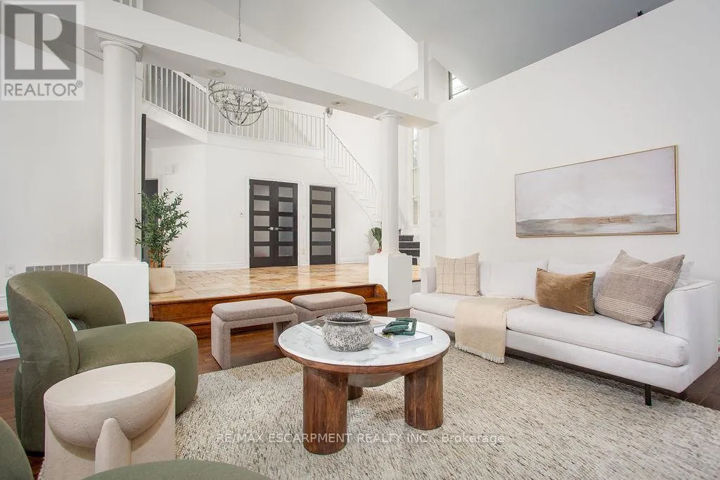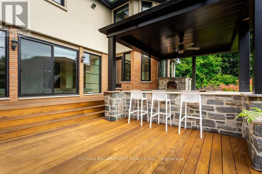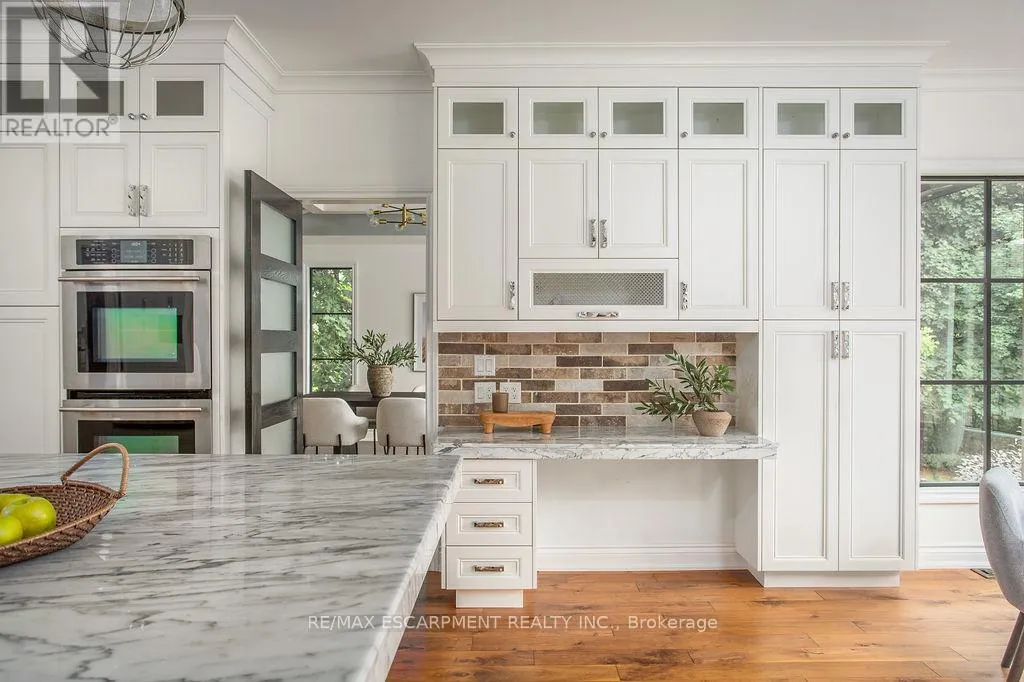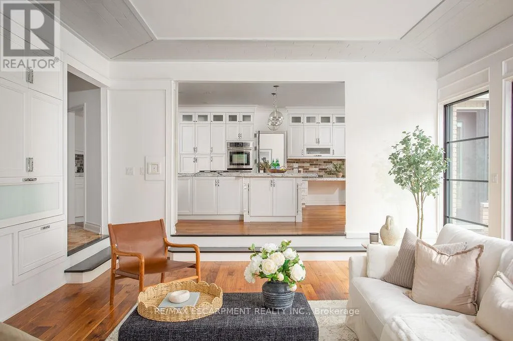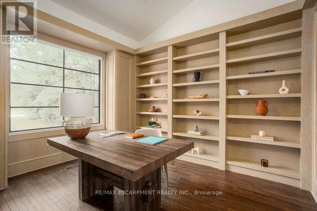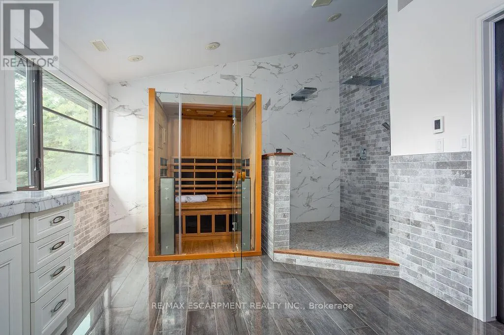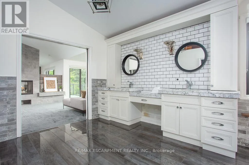Cross Streets: Carlisle Road/Centre Road. ** Directions: Carlisle Road - Flamborough Hills - Acredale - Blackberry. Set on a prestigious estate street, this exceptional residence offers comfort, connection, and quiet luxury in one of Carlisle's most welcoming and safe neighbourhoods-where evening walks, community spirit, and everyday ease define the lifestyle. A soaring 22-foot foyer opens to over 5,400 sq ft above grade, plus an expansive walkout lower level designed for living and gathering. The main floor balances architectural presence with warmth, featuring a sunken oak-panelled office, a grand living room with 19-foot vaulted ceilings, and a formal dining room overlooking the private backyard. The chef's kitchen boasts solid wood dovetailed cabinetry, marble countertops, professional appliances, walk-in pantry, and breakfast room, flowing into the family room with wood-burning fireplace, wet bar, and oversized sliders to the deck. A sun-filled sunroom, main-floor bedroom or office with ensuite, and full laundry add flexibility and ease. Upstairs, the primary retreat offers vaulted ceilings, seating area, two-sided fireplace, private balcony, and a spa-inspired ensuite with heated floors, marble counters, dual rain shower, water closet, and indoor sauna. Three additional bedrooms share a four-piece bath, while a second staircase leads to a private bonus room with ensuite-ideal for work or creativity. The walkout lower level features epoxy flooring, home theatre, fitness area, full bath, and ample storage. Outdoors, the south-facing backyard is a private retreat with heated saltwater pool, outdoor sauna, fire-pit, IPE deck, and stone kitchen with wood-fired pizza oven. With extensive updates, a heated four-car garage, and outstanding curb appeal, this is Carlisle living at its finest-more than a home, it's the setting for the life you've been waiting to live. (id:27476)