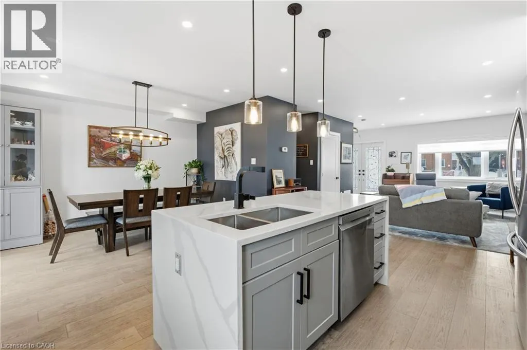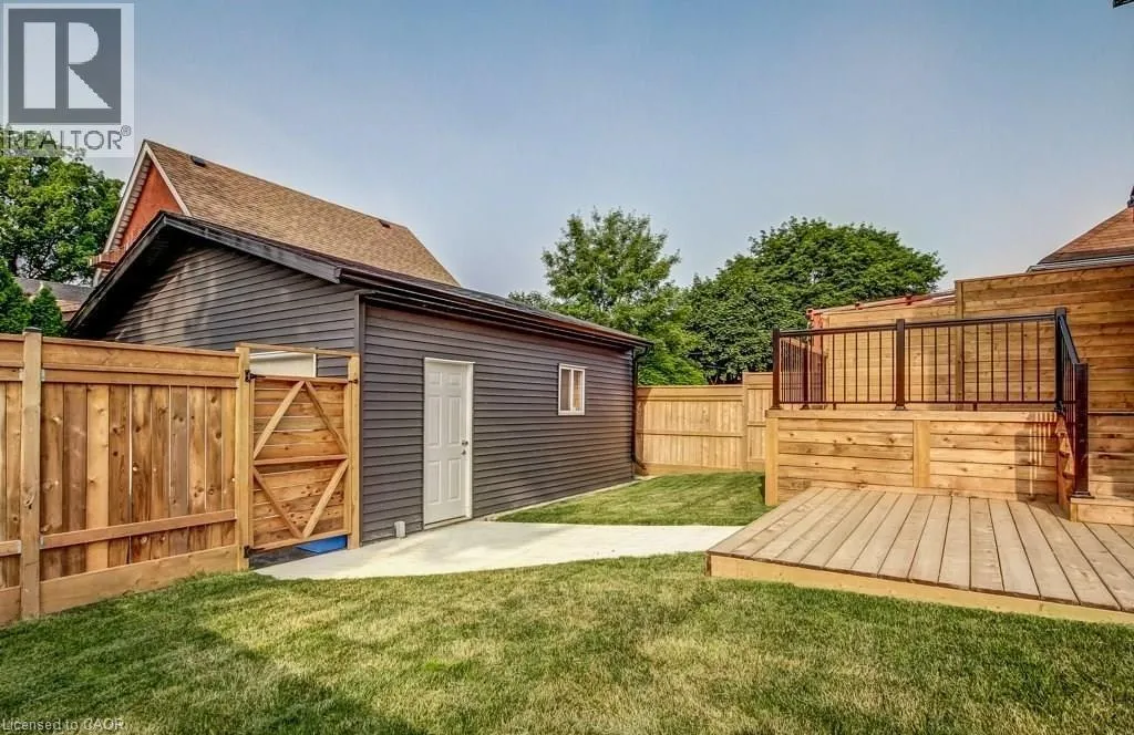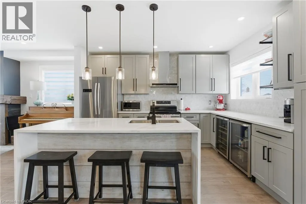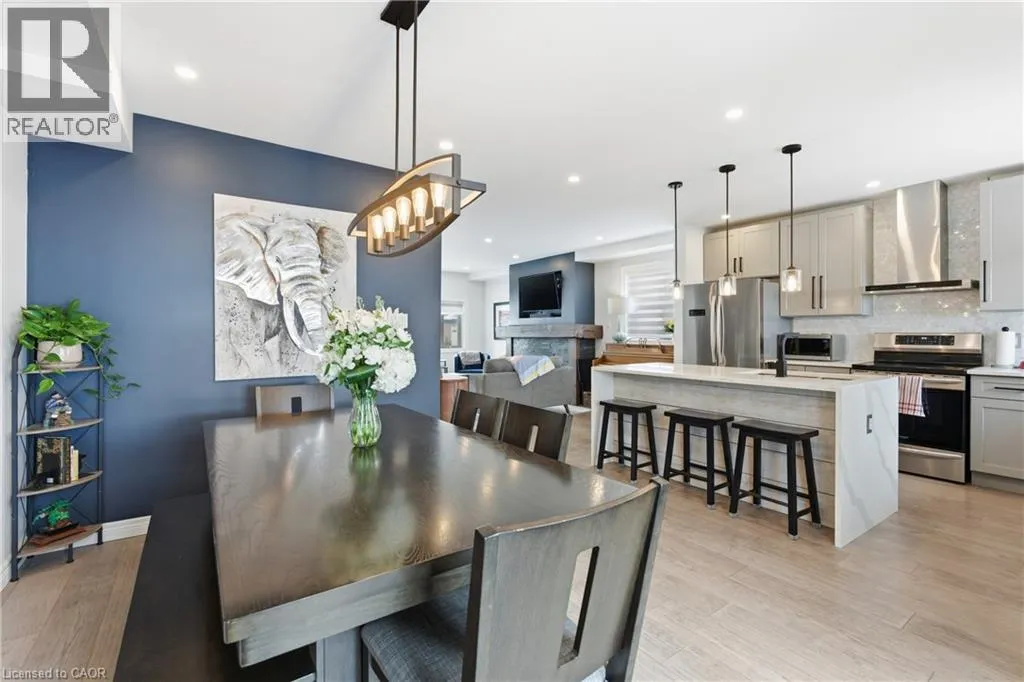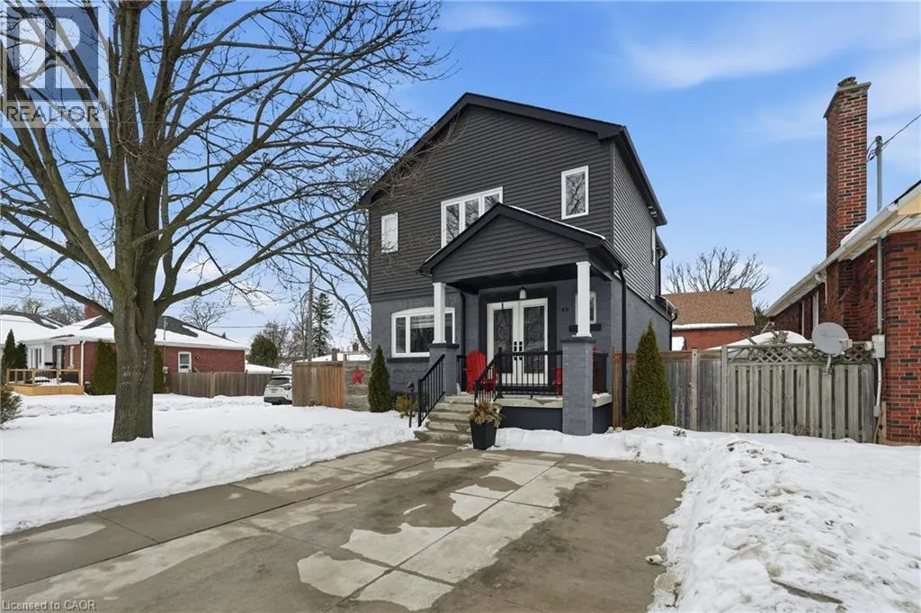 Upper James St to Brucedale Ave E Welcome to 49 Brucedale Avenue E.! Move-in ready and eye-catching, this two-story Hamilton Mountain home is unlike any other. Fully updated with modern finishes in a sought-after neighbourhood, it's designed for today's lifestyle. Featuring three spacious bedrooms, including a primary suite with walk-in closet, en-suite, and cozy gas fireplace, plus second-floor laundry and four baths. The bright, open-concept main floor showcases hardwood floors, pot lights, and a striking brick fireplace with barn wood accents in the living room. The chef-inspired kitchen boasts a quartz waterfall island, ample counter space, stainless steel appliances, and wine and beverage refrigerators. French doors from the dining area open to a two-tier deck-perfect for entertaining and relaxing outdoors. The fully finished lower level includes a spacious bedroom, 2-piece bath, pantry/storage area, and a utility room with 200-amp service. Outside, enjoy two driveways, a detached double-car garage with hydro, a fenced yard, and a Bocce court with turf (2022). Perfectly located near downtown, shopping, top-rated schools, Mohawk College, highways, Brucedale Park, and just steps from the Bruce Trail. A home that seamlessly combines style, space, and convenience-truly a must-see! (id:27476)