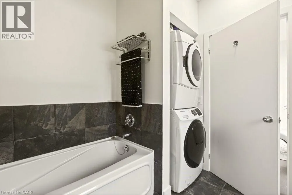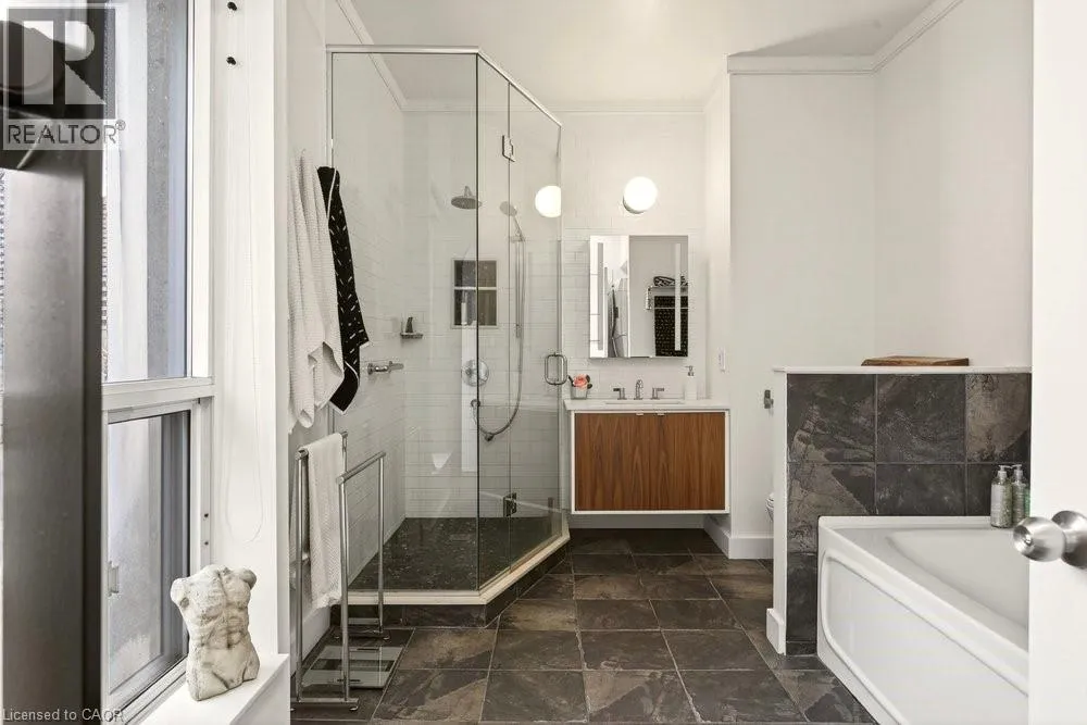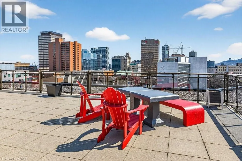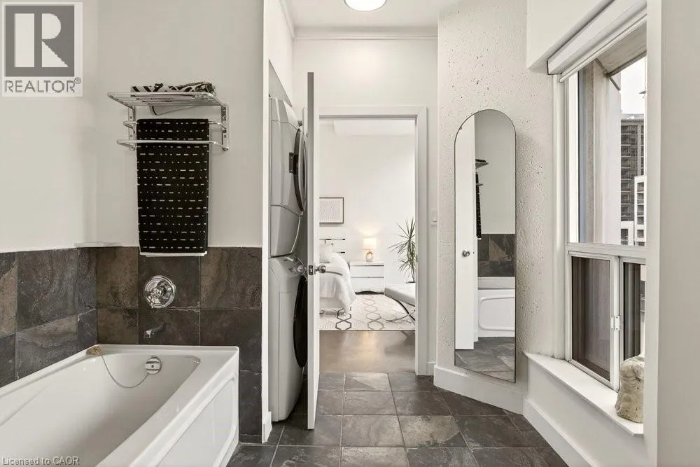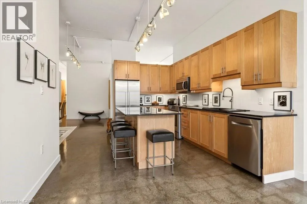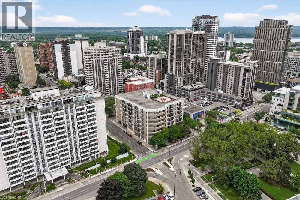 Jackson Street to Bay Street Welcome to Unit 401 at Core Lofts â a stunning corner suite in the heart of downtown Hamilton. Offering just over 1,500 sq ft of open-concept living space, this 2 bedroom, 2 bathroom loft combines industrial character with modern comfort. Featuring 10+ foot ceilings, polished concrete floors, and expansive floor-to-ceiling windows with desirable east and north exposures, this bright and airy unit is flooded with natural light. The spacious kitchen is equipped with granite countertops, stainless steel appliances, and a large island with granite surface, ideal for entertaining. The primary bedroom features floor-to-ceiling windows with custom window coverings and a beautifully appointed ensuite complete with a stand-up shower and soaker tub. The second bedroom offers flexibility for guests, office space, or additional living needs. The unit is tastefully decorated and can be purchased fully furnished. One parking space and a storage locker are included. Building amenities including a gym, meeting/party room, and a rooftop terrace with BBQs and seating areas. Located steps to Hess Street, Locke Street, King William dining district, Jackson Square, and the new TD Coliseum. Enjoy easy access to restaurants, cafés, shopping, entertainment, Bayfront Park, GO Transit, and major highway access. Experience convenient downtown living in one of Hamiltonâs most desirable loft buildings. (id:27476)