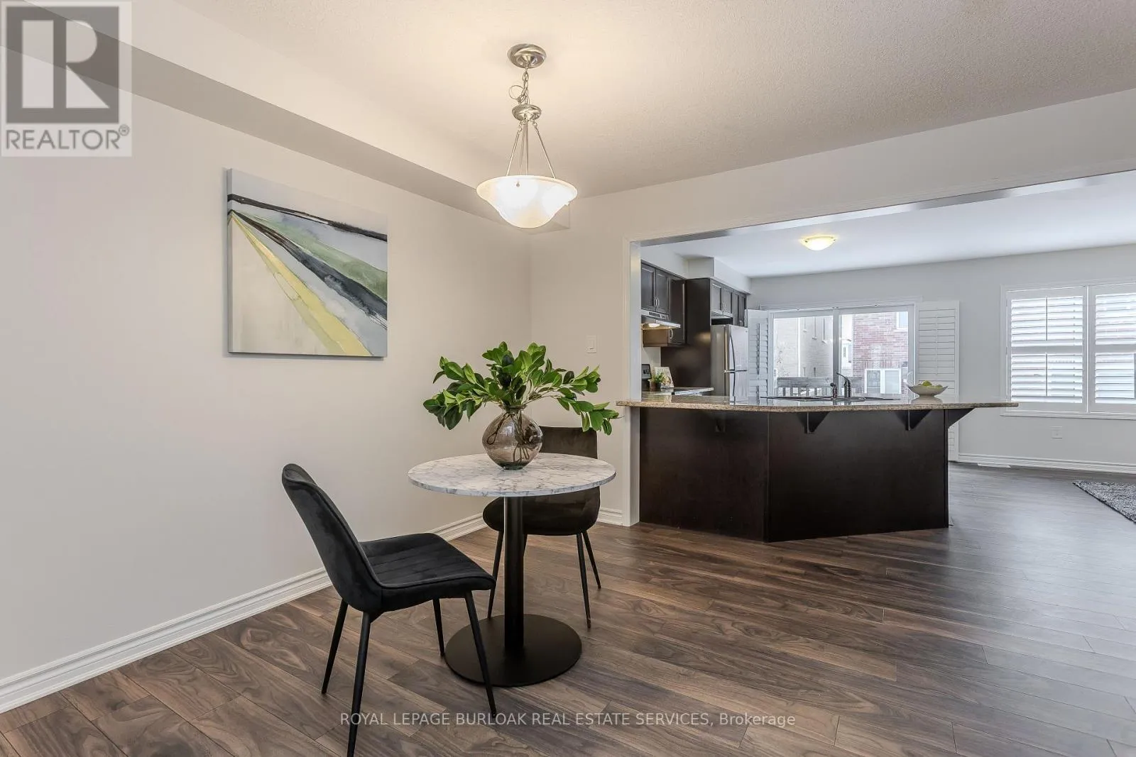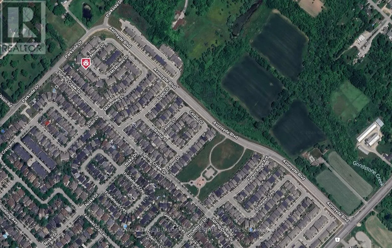 Parkside Dr to Spring Creek Dr to McMonies Dr Welcome to this beautifully maintained freehold townhome nestled in one of Waterdown's most sought-after family communities. Offering1,459 sq ft of total living space, this home combines comfort, style, and everyday convenience in a fantastic location close to schools, parks, shopping, dining, and all essential amenities - perfect for growing families. From the moment you arrive, the home impresses with its striking façade, charming covered porch, and inviting curb appeal. Step inside to a warm and welcoming entryway featuring hardwood flooring that flows throughout the main level, along with a convenient 2-piece powder room. The open-concept main floor is designed for modern family living and effortless entertaining. The bright dining area connects seamlessly to a stylish kitchen complete with granite countertops, stainless steel appliances, ample cabinetry, and a peninsula with breakfast bar - ideal for busy mornings or casual meals. A walkout leads directly to the backyard deck, extending your living space outdoors. The spacious living room is filled with natural light from a large window, creating a cozy place for family time. A classic wooden staircase leads to the upper level. Upstairs, hardwood flooring continues throughout. The spacious primary retreat features a walk-in closet and a private 4-piece ensuite with an oversized granite vanity and tiled shower/tub. Two additional well-sized bedrooms provide flexibility for children, guests, or a home office, and are served by a bright 4-piece main bathroom. The fully fenced backyard offers a safe and private outdoor space with green lawn for kids and pets to play, plus an elevated wooden deck - perfect for summer barbecues and relaxing evenings. A wonderful opportunity to own a stylish, move-in ready home in a vibrant, family-friendly neighbourhood (id:27476)