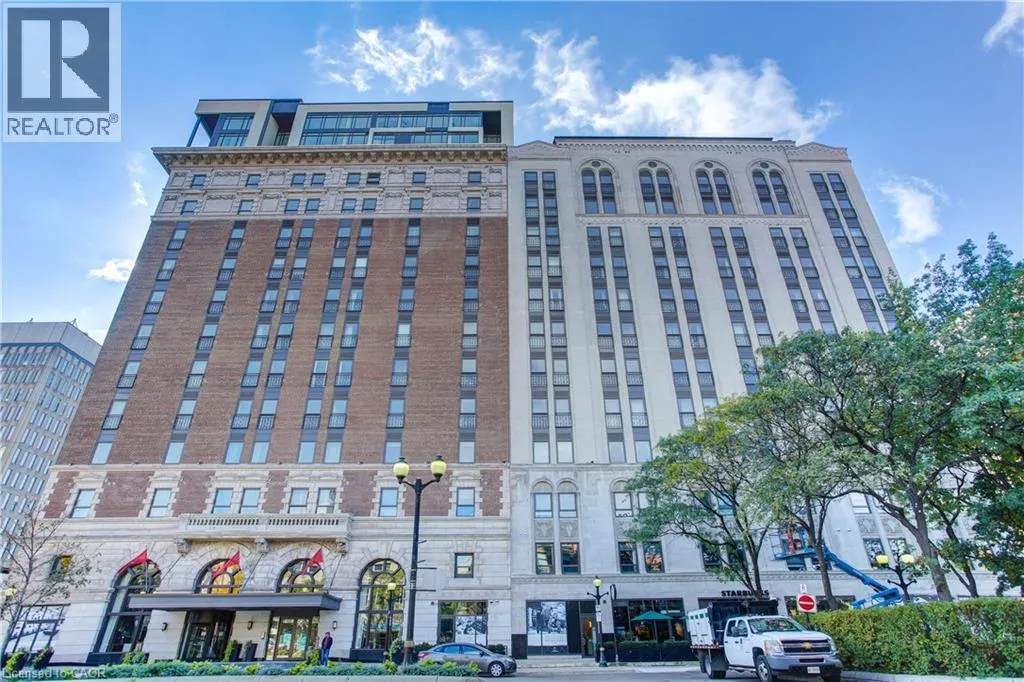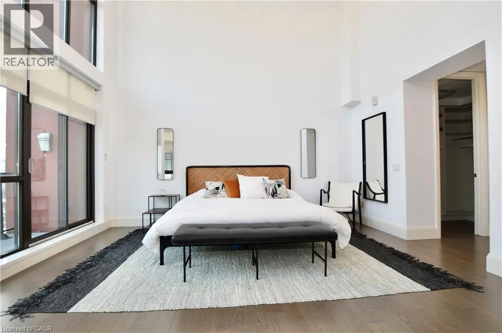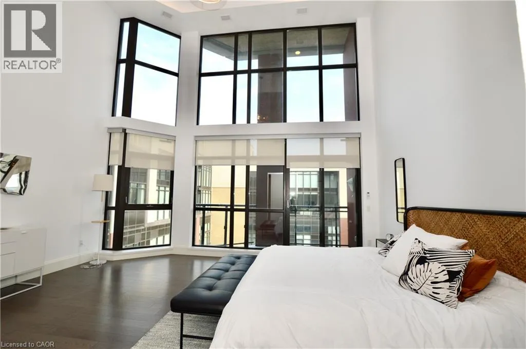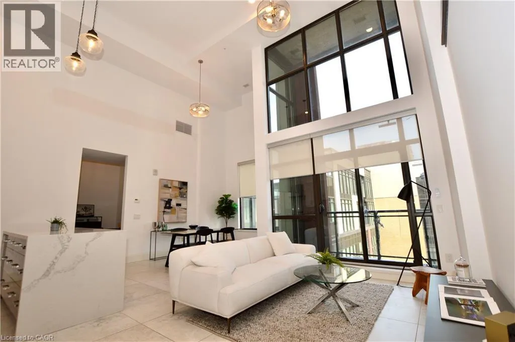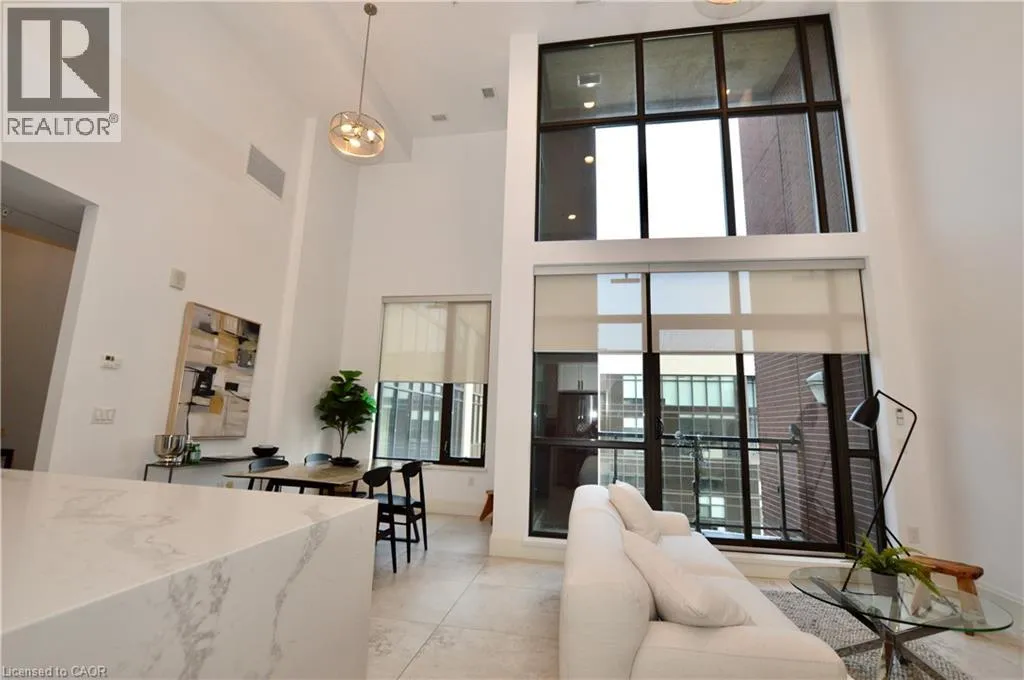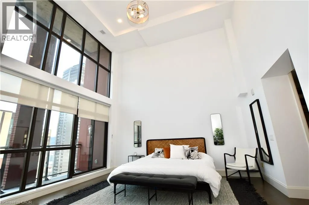 Corner of King st E. and John St. S. An incredible opportunity to call this iconic landmark building your home - introducing the unrivaled penthouse level. This exceptional loft-style suite showcases luxury living with thoughtfully curated, high-end finishes throughout.Featuring dramatic 18-foot ceilings, dual balconies, and an open-concept kitchen, living, and dining area framed by soaring windows, the space feels both expansive and inviting. Large-format tile flooring complements the sleek quartz countertops, complete with a waterfall-edge island and matching backsplash. The kitchen is fully equipped with stainless steel refrigerator, stove, dishwasher, and hood fan.Spectacular two-storey windows create a striking architectural focal point. A den just off the kitchen offers the perfect work-from-home space. In-suite laundry includes a convenient stacked washer and dryer.Retreat to the stunning primary bedroom, bathed in natural light from beautiful oversized windows. Step onto your private balcony to enjoy peaceful morning moments. The spa-inspired ensuite features a separate glass shower and soaker tub, along with a generous walk-in closet.Upstairs, the loft level offers a second bedroom overlooking the main living area, complete with its own large walk-in closet and full ensuite bath.Designed for those who value both form and function, this residence is equally suited for elegant entertaining or relaxed personal living. The thoughtfully designed floorplan is truly impressive.Included are one underground parking space and two storage lockers.Situated in the heart of downtown, you're steps from top restaurants, vibrant bars, unique boutiques, McMaster University, hospitals, and the beloved Art Crawl. This location delivers a complete live-work lifestyle experience. (id:27476)