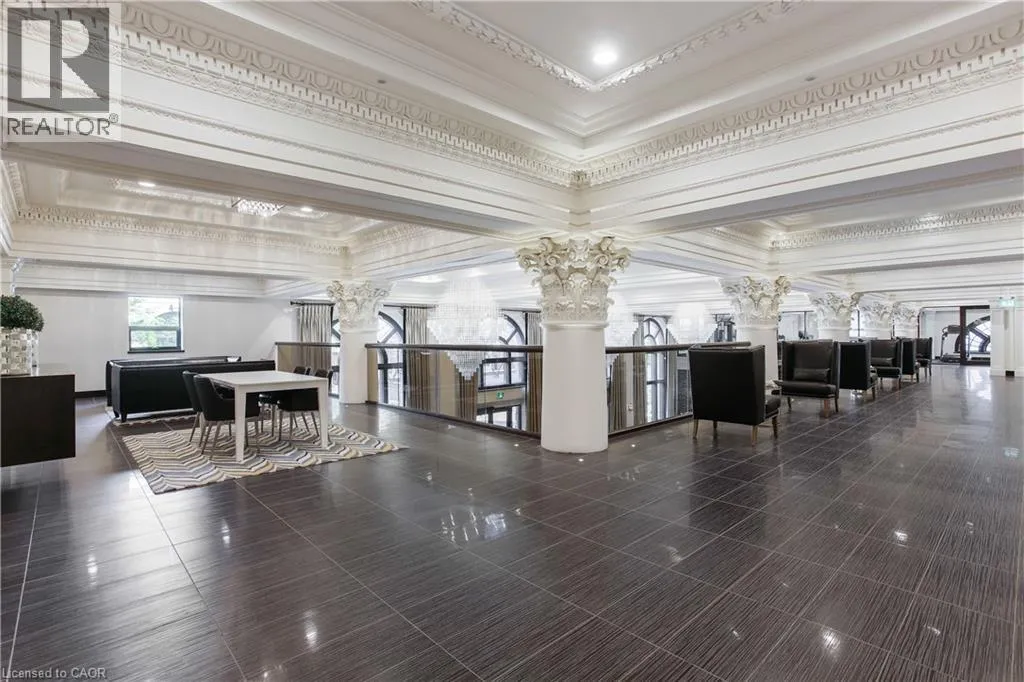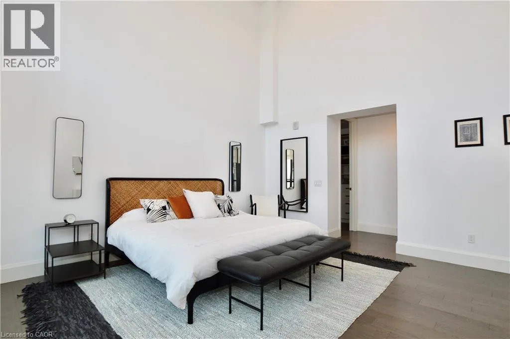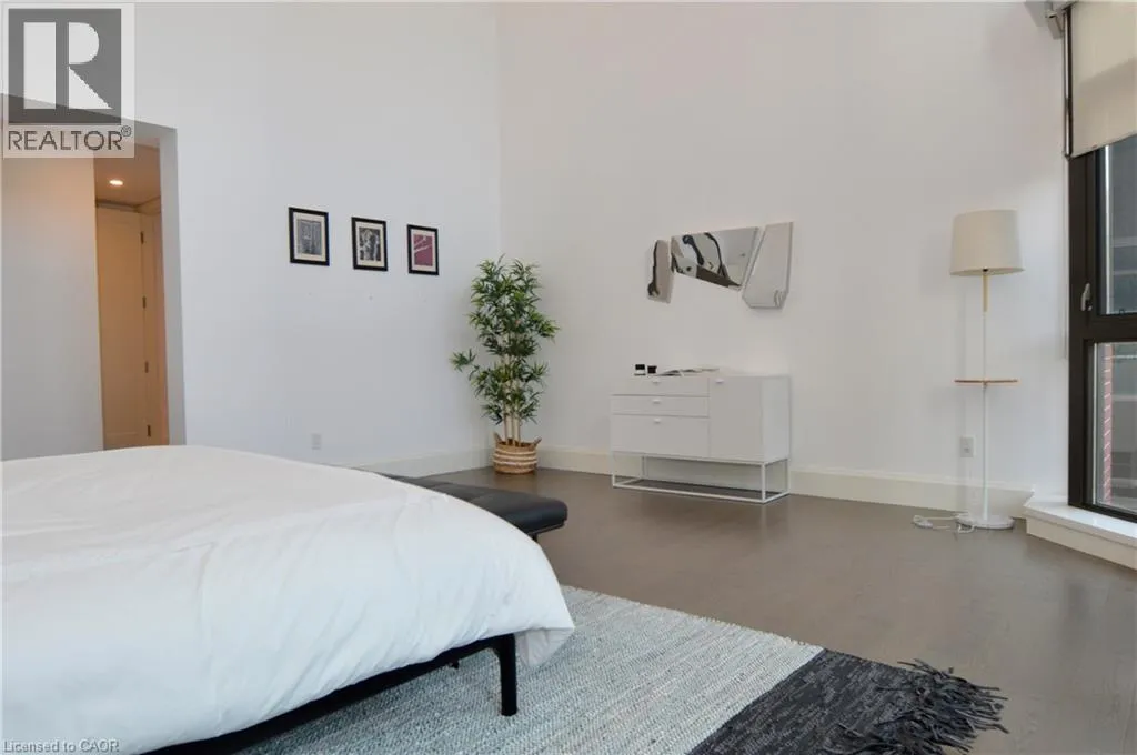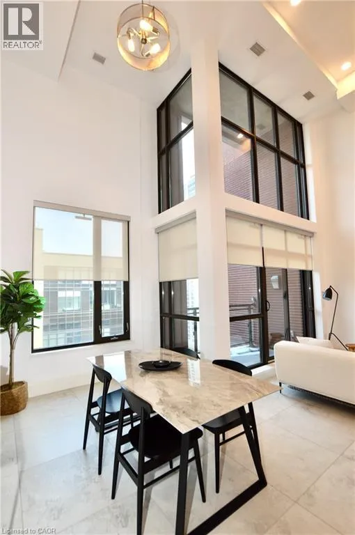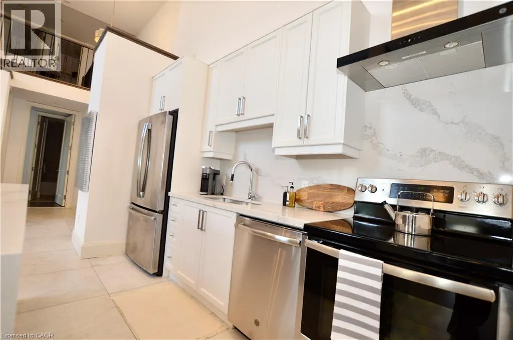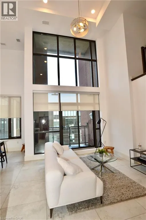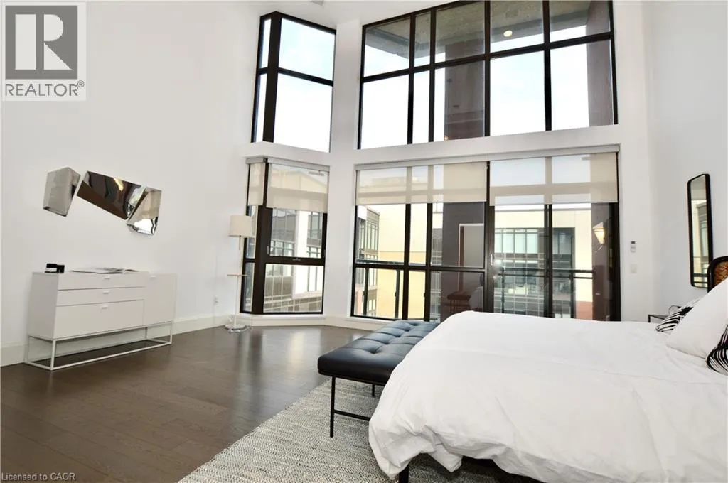Corner of King st E. and John St. S. An incredible opportunity to call this iconic landmark building your home - introducing the unrivaled penthouse level. This exceptional loft-style suite showcases luxury living with thoughtfully curated, high-end finishes throughout.Featuring dramatic 18-foot ceilings, dual balconies, and an open-concept kitchen, living, and dining area framed by soaring windows, the space feels both expansive and inviting. Large-format tile flooring complements the sleek quartz countertops, complete with a waterfall-edge island and matching backsplash. The kitchen is fully equipped with stainless steel refrigerator, stove, dishwasher, and hood fan.Spectacular two-storey windows create a striking architectural focal point. A den just off the kitchen offers the perfect work-from-home space. In-suite laundry includes a convenient stacked washer and dryer.Retreat to the stunning primary bedroom, bathed in natural light from beautiful oversized windows. Step onto your private balcony to enjoy peaceful morning moments. The spa-inspired ensuite features a separate glass shower and soaker tub, along with a generous walk-in closet.Upstairs, the loft level offers a second bedroom overlooking the main living area, complete with its own large walk-in closet and full ensuite bath.Designed for those who value both form and function, this residence is equally suited for elegant entertaining or relaxed personal living. The thoughtfully designed floorplan is truly impressive.Included are one underground parking space and two storage lockers.Situated in the heart of downtown, you're steps from top restaurants, vibrant bars, unique boutiques, McMaster University, hospitals, and the beloved Art Crawl. This location delivers a complete live-work lifestyle experience. (id:27476)