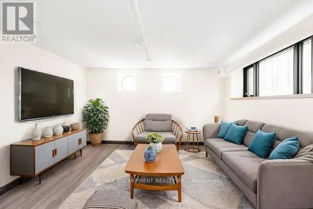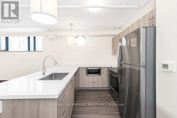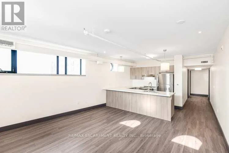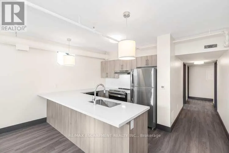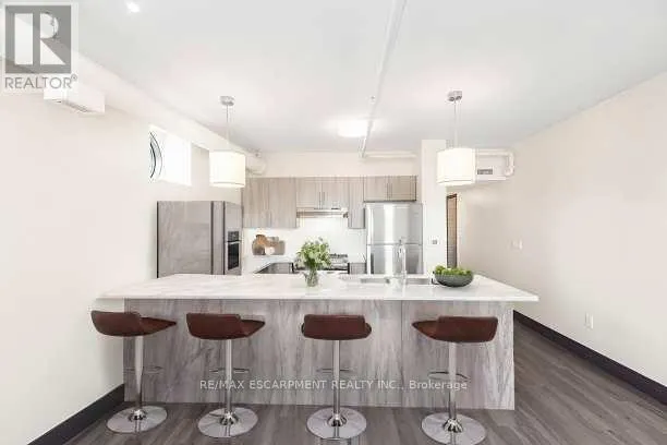 King St E & Catharine St N Downtown style at Gore Park lofts. Smack dab in the heart of Downtown Hamilton, this building brings together old-world charm and modern living. Great outdoor spaces surround you, with nearby parks, scenic bike trails and the lakeshore just a short jog away. Inside, the unit blends character with modern style. This spacious two-bedroom unit is carpet-free throughout! Enjoy the convenience of a gourmet kitchen with loads of counter space and a breakfast bar that flows into a large living space with tons of potential. A generous primary bedroom is complemented by a nicely sized second bedroom, room for all! There is a gleaming white four-piece bathroom with subway tiles, in-suite laundry and a storage locker perfect for all the things we tend to collect to round out this great apartment. Located in a vibrant neighborhood with shops, restaurants and entertainment, all within walking distance. Close to the GO station, HWY 403, McMaster University and Mohawk College. This home puts you in the middle of everything. Welcome home! RSA. (id:27476)