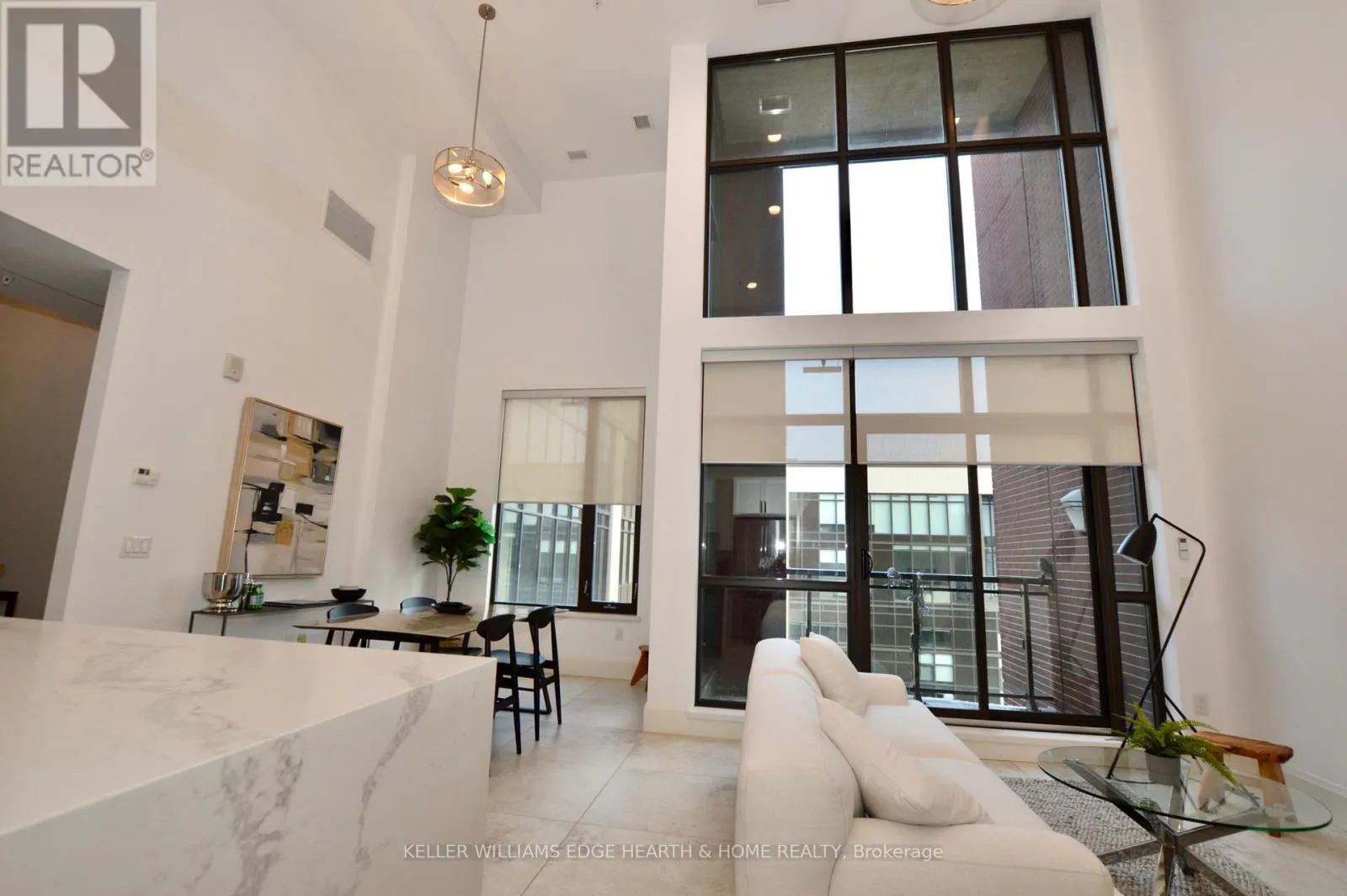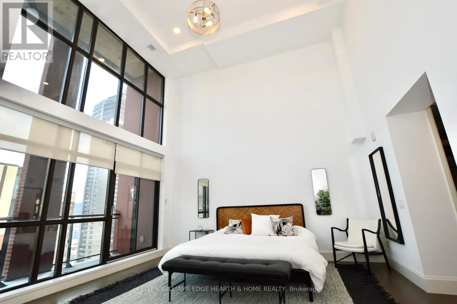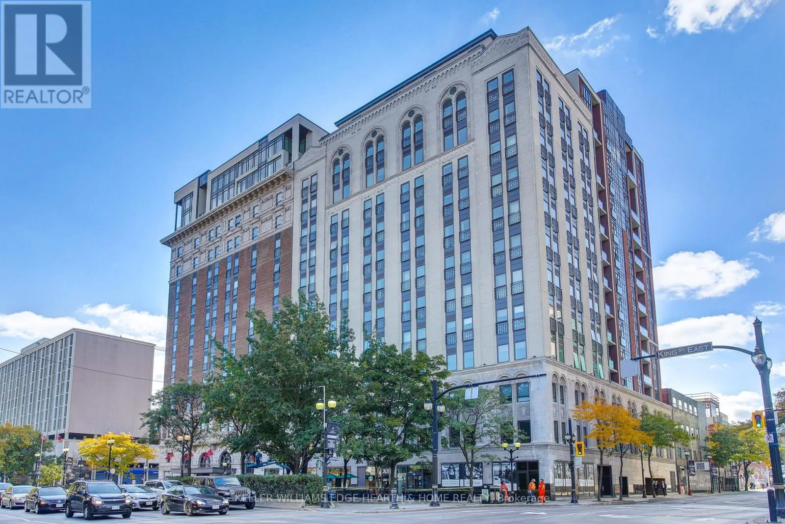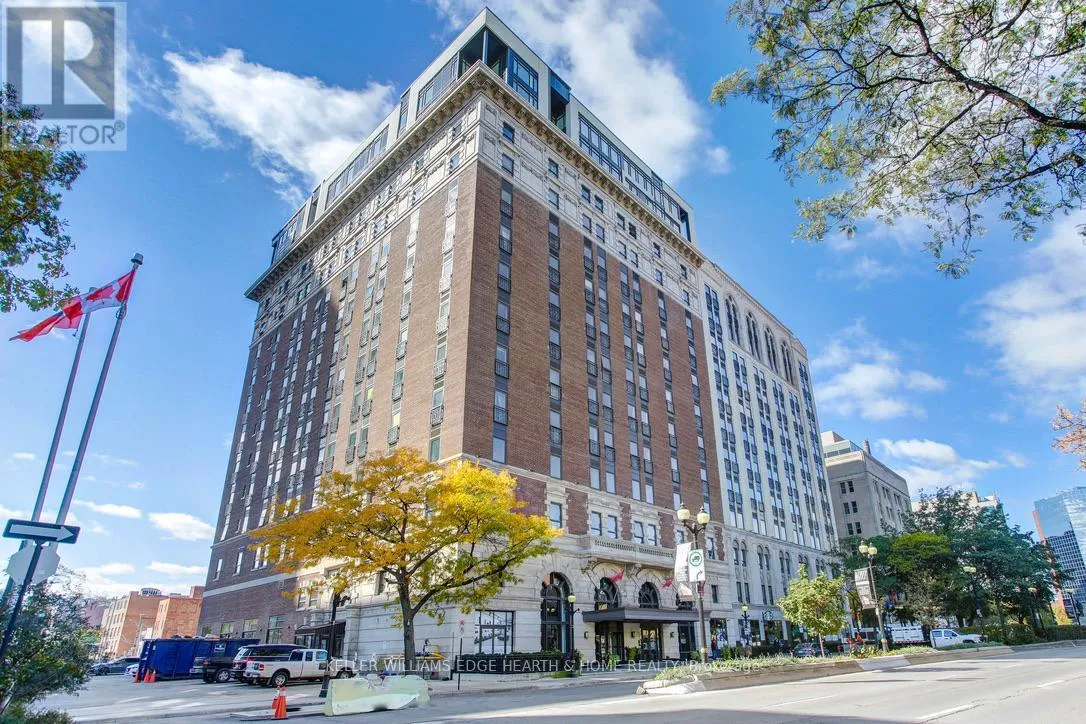 Cross Streets: Catharine. ** Directions: E. An incredible opportunity to call this iconic landmark building your home - introducing the unrivaled penthouse level. This exceptional loft-style suite showcases luxury living with thoughtfully curated, high-end finishes throughout.Featuring dramatic 18-foot ceilings, dual balconies, and an open-concept kitchen, living, and dining area framed by soaring windows, the space feels both expansive and inviting. Large-format tile flooring complements the sleek quartz countertops, complete with a waterfall-edge island and matching backsplash. The kitchen is fully equipped with stainless steel refrigerator, stove, dishwasher, and hood fan.Spectacular two-storey windows create a striking architectural focal point. A den just off the kitchen offers the perfect work-from-home space. In-suite laundry includes a convenient stacked washer and dryer.Retreat to the stunning primary bedroom, bathed in natural light from beautiful oversized windows. Step onto your private balcony to enjoy peaceful morning moments. The spa-inspired ensuite features a separate glass shower and soaker tub, along with a generous walk-in closet.Upstairs, the loft level offers a second bedroom overlooking the main living area, complete with its own large walk-in closet and full ensuite bath.Designed for those who value both form and function, this residence is equally suited for elegant entertaining or relaxed personal living. The thoughtfully designed floorplan is truly impressive.Included are one underground parking space and two storage lockers.Situated in the heart of downtown, you're steps from top restaurants, vibrant bars, unique boutiques, McMaster University, hospitals, and the beloved Art Crawl. This location delivers a complete live-work lifestyle experience. (id:27476)