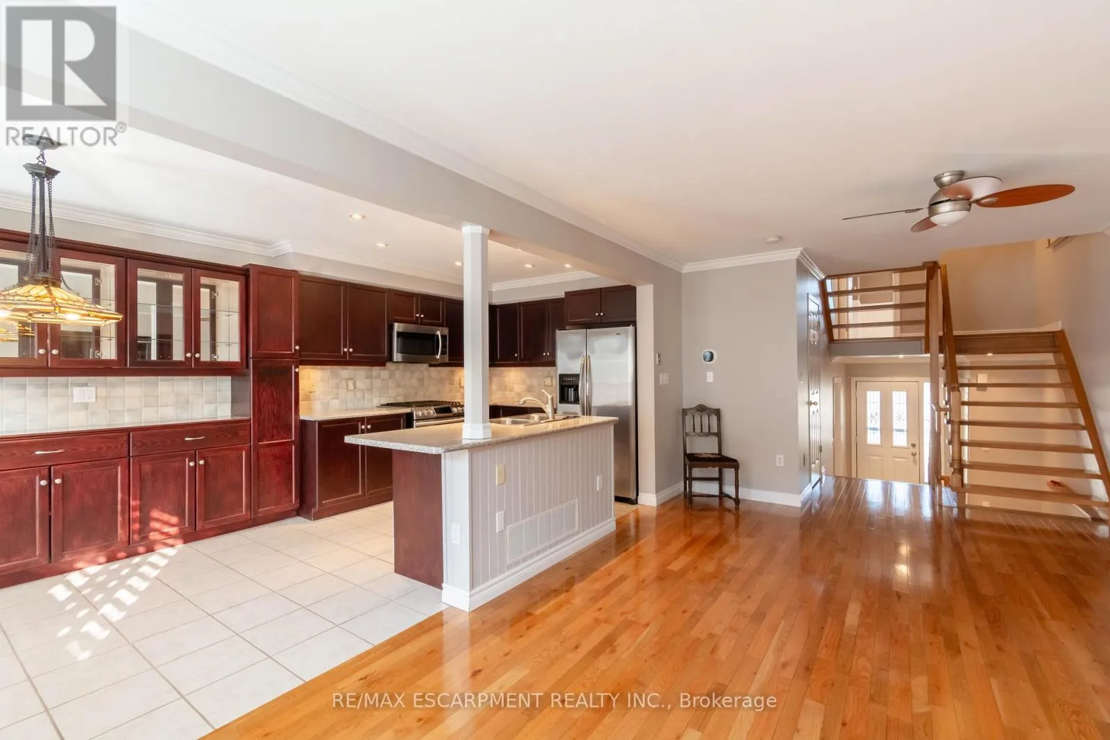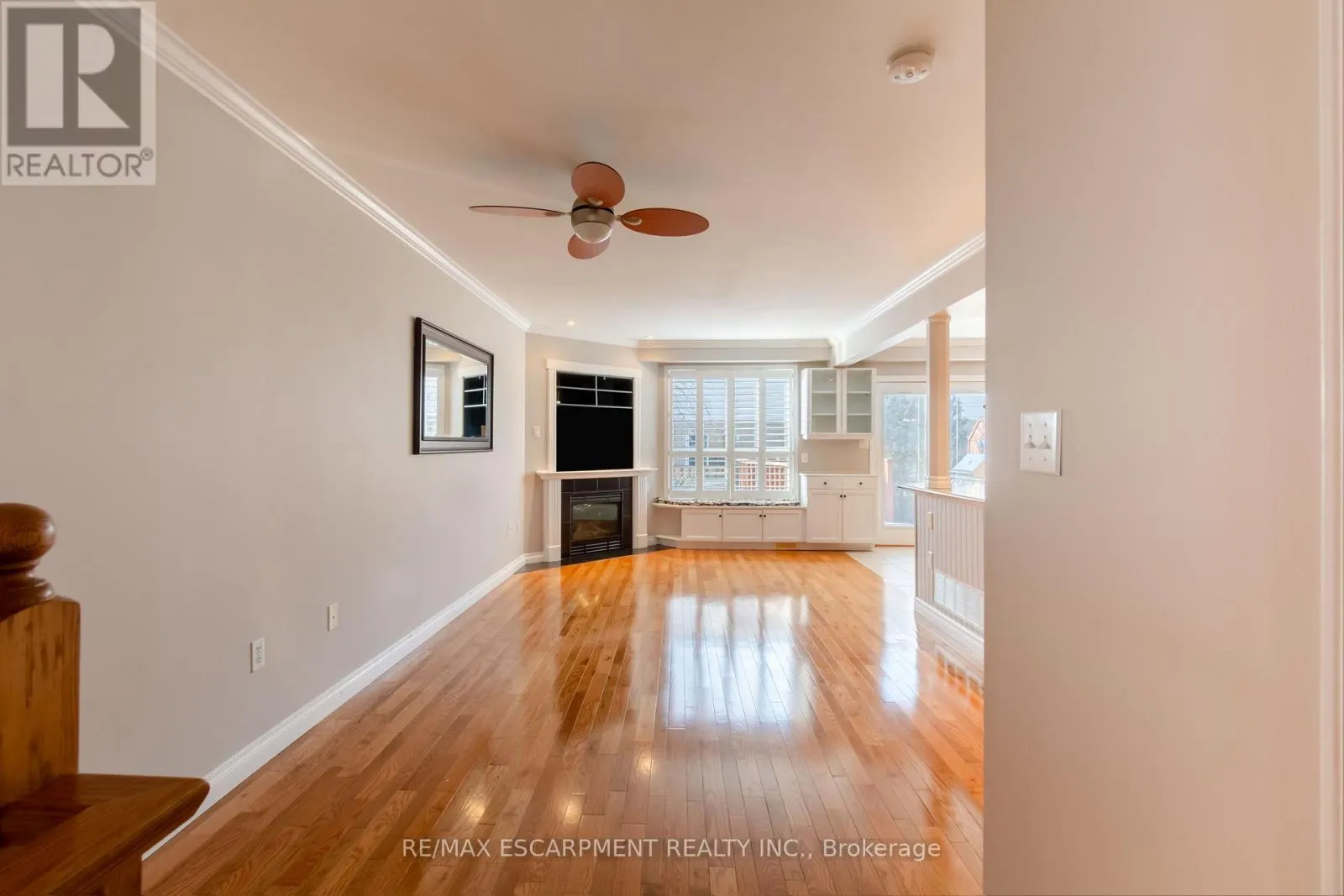 North Service Rd Welcome to the Stoney Creek Waterfront. This unique freehold townhome is only attached at the garage walls. Step inside to the open concept layout with gleaming hardwood floors, custom built-ins with ample kitchen cabinets, fireplace and California shutters. Upstairs has 3 great size bedrooms with the primary having a large walk-in closet and ensuite. Bedroom level laundry as an added bonus. The lower level offers a large, cozy and bright fully finished family room. Relax on the deck outback with the natural gas line for BBQ and fully fenced yard. Just steps to Lake Ontario, walking trails, the QEW, shopping and dining. (id:27476)