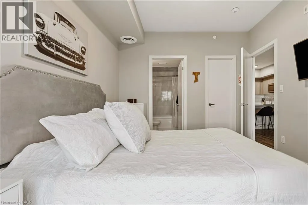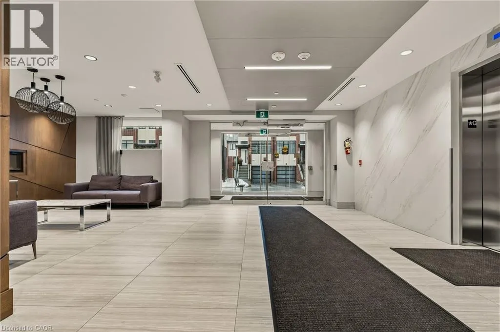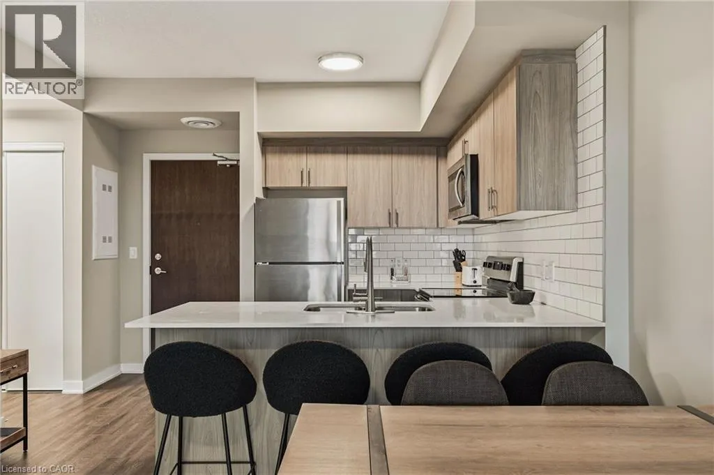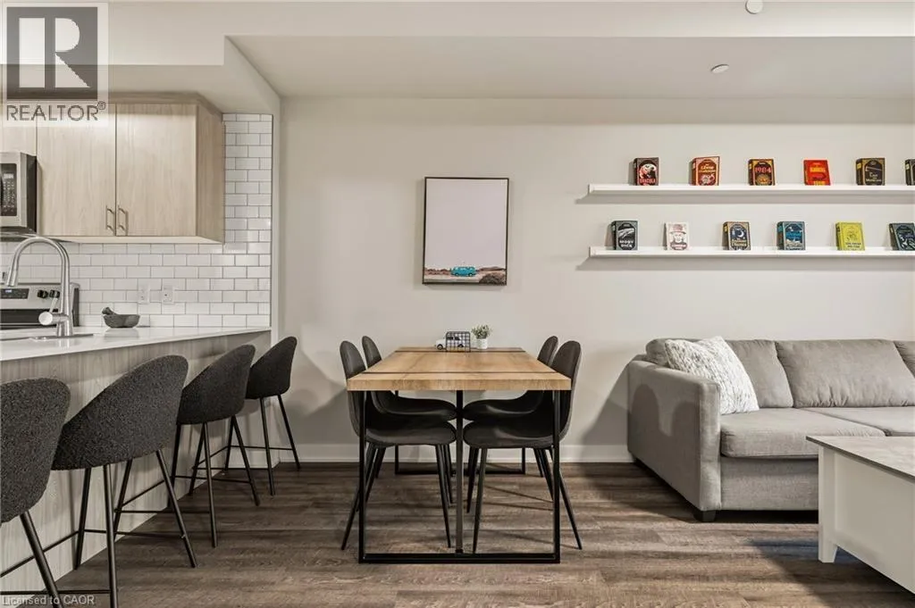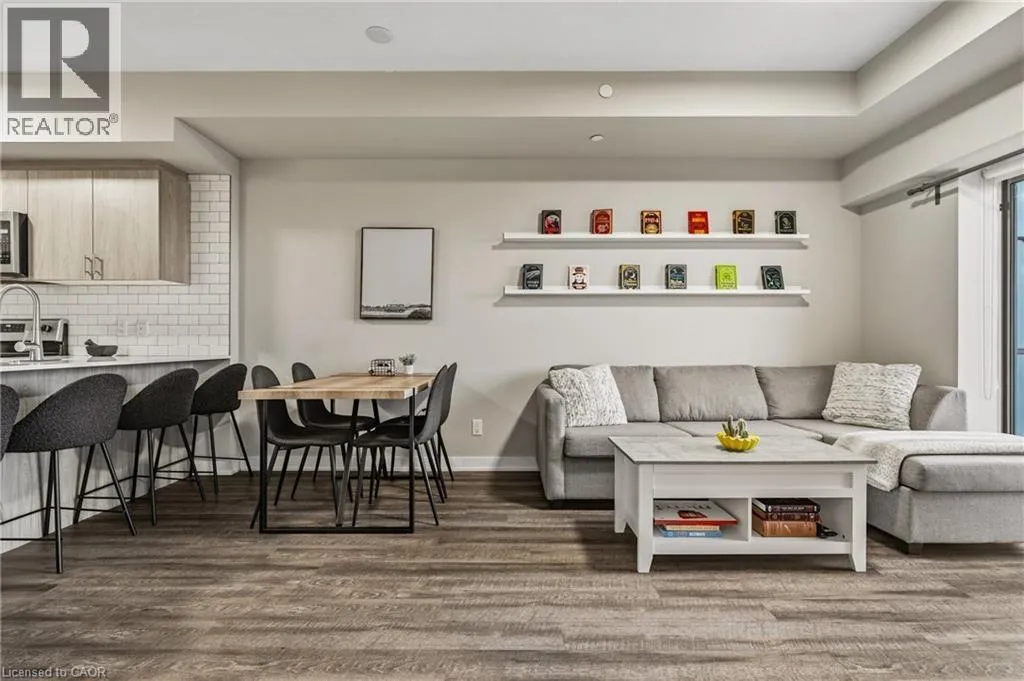 Garner Rd W (near Shaver Rd) to Munay Ln to Markle Cres Step into elevated living in this recently built, beautifully appointed and fully furnished condo in a fantastic Ancaster community. Designed with style and comfort in mind, this 1-bedroom, 1.5-bath suite delivers the perfect blend of modern luxury and everyday ease. The open-concept layout feels airy and inviting, anchored by a stunning chef-inspired kitchen featuring sleek stainless steel appliances, quartz countertops, subway tile backsplash, contemporary cabinetry, and a generous breakfast bar made for casual mornings or hosting friends. Soaring 9-foot ceilings and expansive windows flood the living space with natural light, creating a bright, sophisticated atmosphere throughout. The primary retreat is a true standout, complete with a large picture window, a spa-like ensuite, and a walk-in closet outfitted with a custom organization system. In-suite laundry adds everyday convenience, while your private balcony offers the perfect spot to unwind and catch sunset views. Enjoy a carefree lifestyle with exceptional building amenities, including a fully equipped fitness centre, dedicated yoga studio, and an impressive party room with full kitchen that opens onto a landscaped terrace featuring BBQs and cozy gas fire tables. Underground parking, a private locker, and access to two EV charging stations add even more value. Ideally located just minutes from shopping, dining, trails, community centres, and only a short drive to McMaster and Redeemer University, this upgraded, move-in-ready condo is your opportunity to enjoy refined, maintenance-free living from day one. (id:27476)