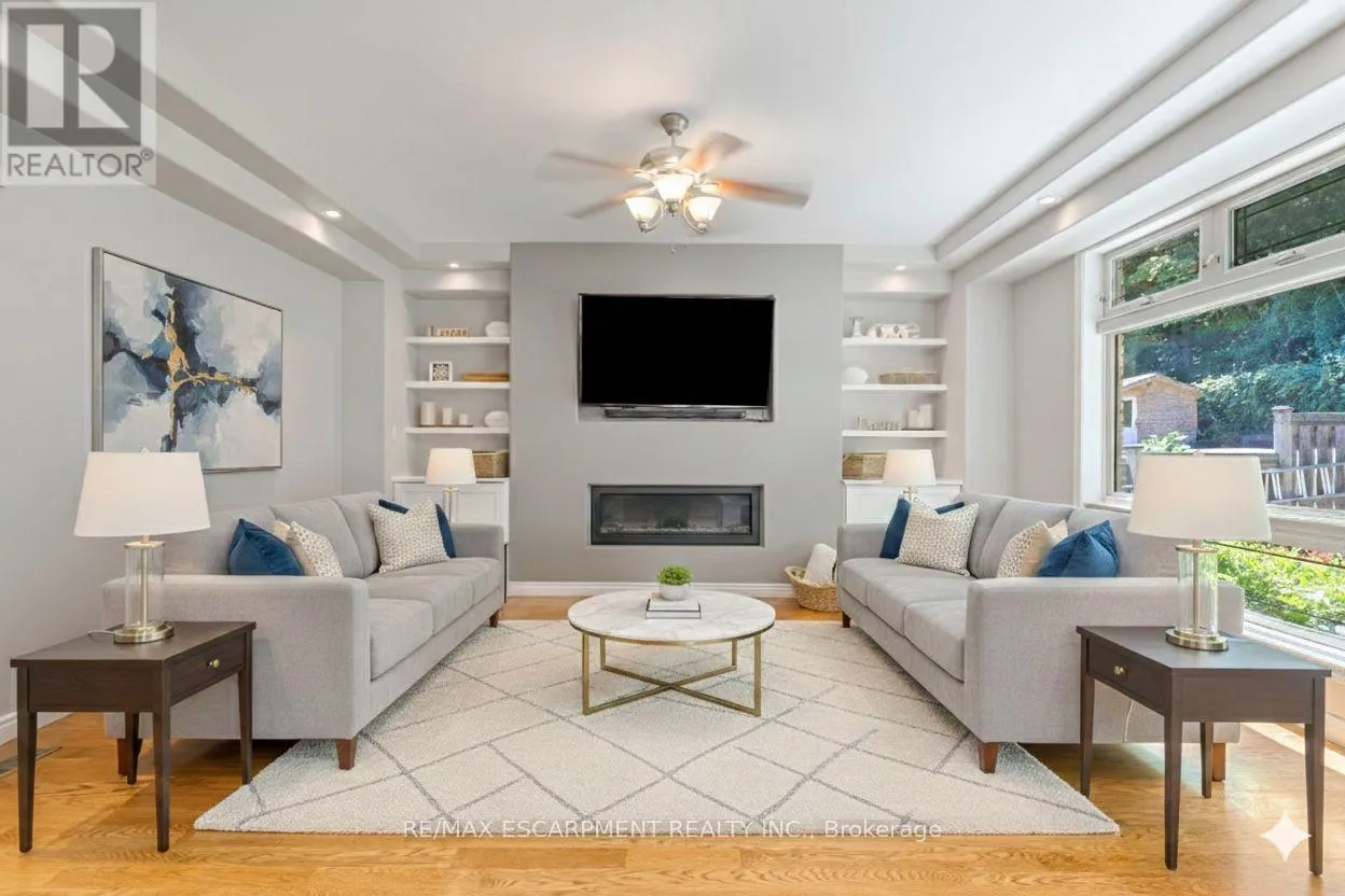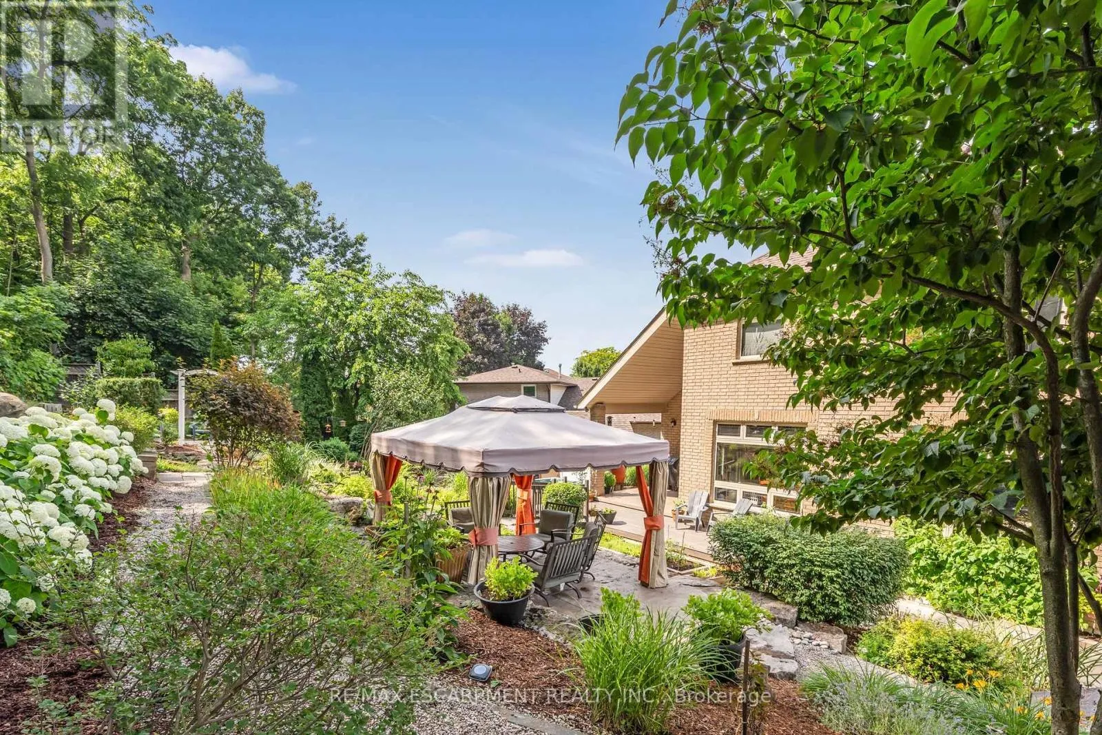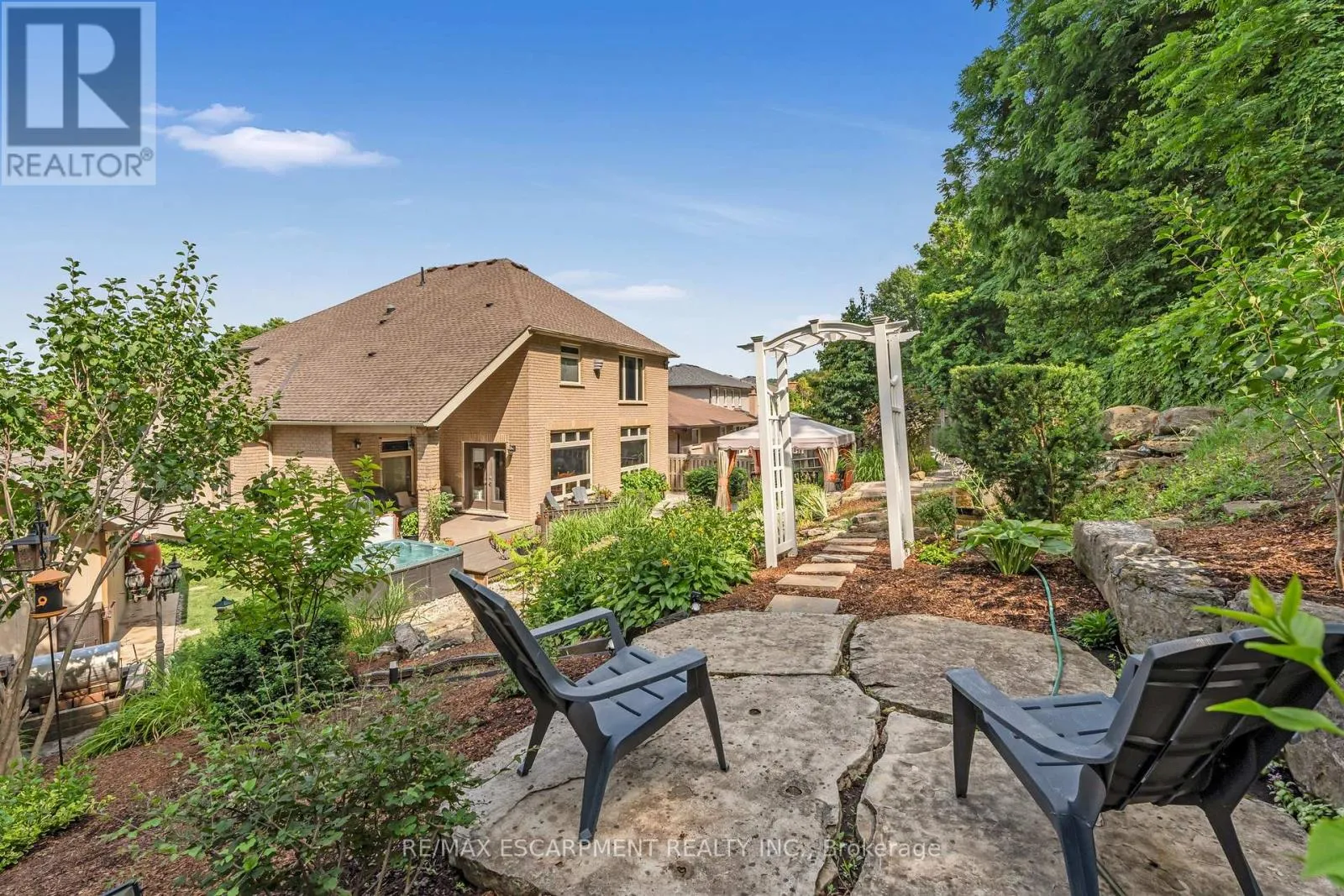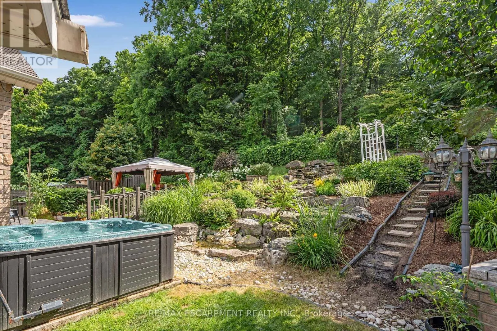 Cross Streets: Regalview Dr. ** Directions: Hwy 8 to Regal view to Shadeland. Escape the hectic pace of the modern world and step into your own private cottage retreat. Nestled gracefully beneath the Niagara Escarpment on a quiet crescent, this custom-built (2003) home sits on a premium pie-shaped lot backing onto lush, protected green space. This isn't just a backyard; it's a lifestyle. Imagine trading screen time for real-world adventures-watching your kids catch frogs by your private, multi-tiered waterfall or chase fireflies as the sun goes down. Spend your evenings soaking in the hot tub, letting the stresses of the day melt away to the tranquil sounds of trickling water and a gentle symphony of cicadas and grasshoppers. It is a true piece of calm in a busy world. Inside, that connection to nature continues. Oversized windows flood the meticulously maintained 4+1 bedroom home with natural light, complementing the soaring ceilings and elegant rounded corners. The freshly painted interior features a kitchen equipped with brand-new appliances (including a gas cooktop option) protected by a 4-year warranty, plus reverse osmosis water at every sink. When it's time to unwind, the spacious primary suite serves as the ultimate sanctuary, featuring a two-sided gas fireplace shared with a luxurious, spa-like ensuite. Family living is made easy with walk-in closets in every single bedroom, central vac, and two fruit cellars. The fully finished basement offers fantastic in-law or income potential, boasting rare 9-foot ceilings, a separate entrance, and a roughed-in kitchen. Complete with an oversized exposed aggregate driveway parking six cars, this move-in-ready home perfectly balances the tranquility of nature with modern luxury. (id:27476)