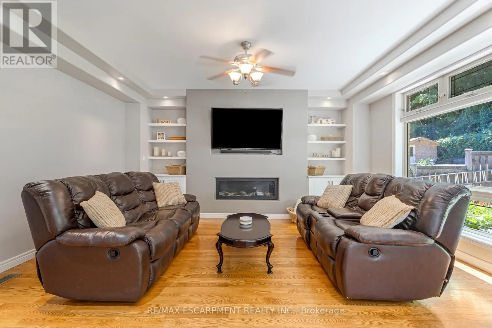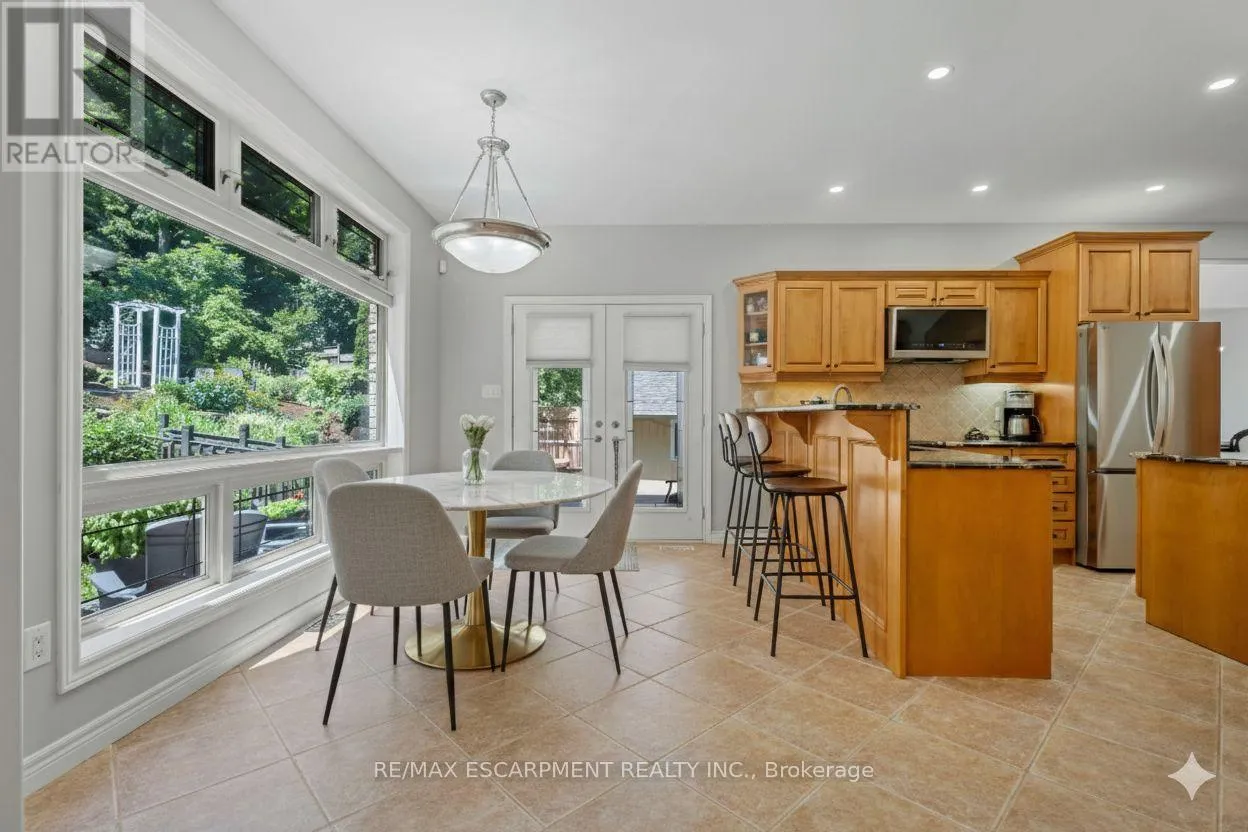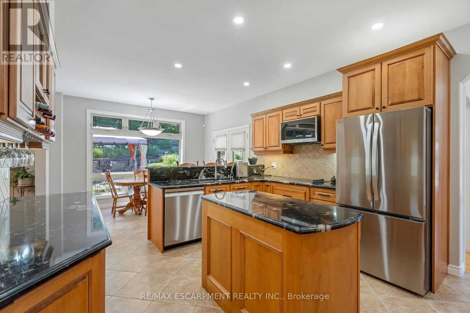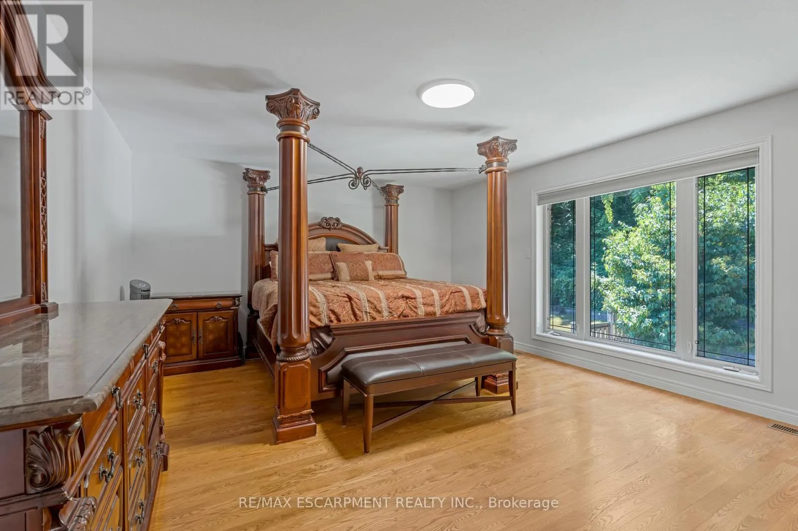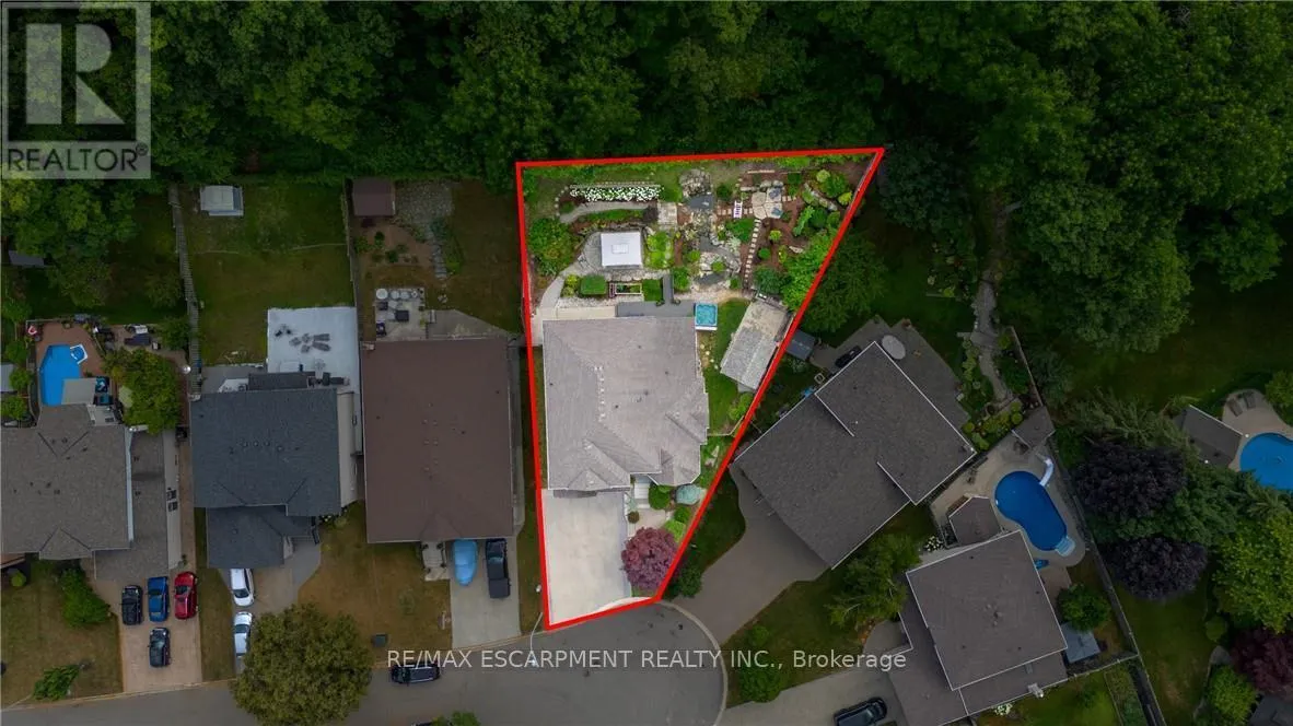 Cross Streets: Regalview Dr. ** Directions: Hwy 8 to Regal view to Shadeland. Escape the hectic pace of the modern world and step into your own private cottage retreat. Nestled gracefully beneath the Niagara Escarpment on a quiet crescent, this custom-built (2003) home sits on a premium pie-shaped lot backing onto lush, protected green space. This isn't just a backyard; it's a lifestyle. Imagine trading screen time for real-world adventures-watching your kids catch frogs by your private, multi-tiered waterfall or chase fireflies as the sun goes down. Spend your evenings soaking in the hot tub, letting the stresses of the day melt away to the tranquil sounds of trickling water and a gentle symphony of cicadas and grasshoppers. It is a true piece of calm in a busy world. Inside, that connection to nature continues. Oversized windows flood the meticulously maintained 4+1 bedroom home with natural light, complementing the soaring ceilings and elegant rounded corners. The freshly painted interior features a kitchen equipped with brand-new appliances (including a gas cooktop option) protected by a 4-year warranty, plus reverse osmosis water at every sink. When it's time to unwind, the spacious primary suite serves as the ultimate sanctuary, featuring a two-sided gas fireplace shared with a luxurious, spa-like ensuite. Family living is made easy with walk-in closets in every single bedroom, central vac, and two fruit cellars. The fully finished basement offers fantastic in-law or income potential, boasting rare 9-foot ceilings, a separate entrance, and a roughed-in kitchen. Complete with an oversized exposed aggregate driveway parking six cars, this move-in-ready home perfectly balances the tranquility of nature with modern luxury. (id:27476)