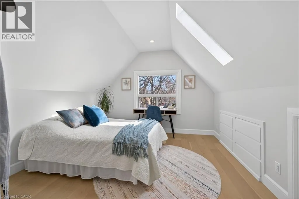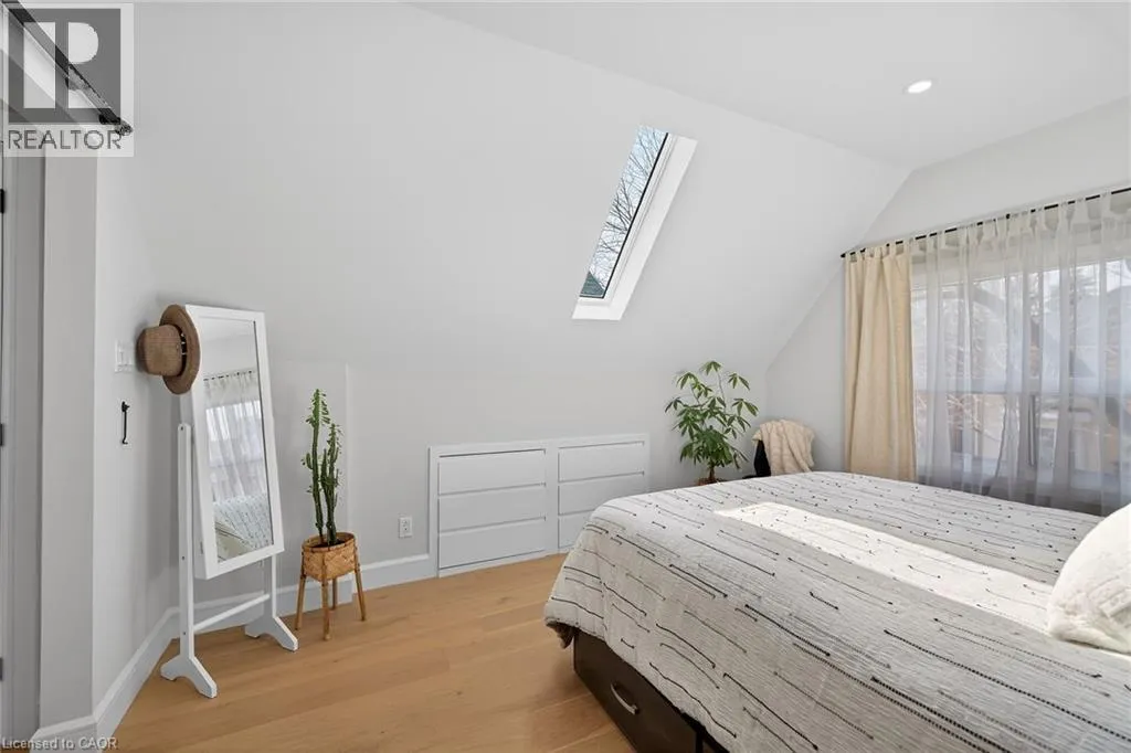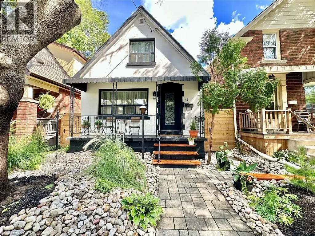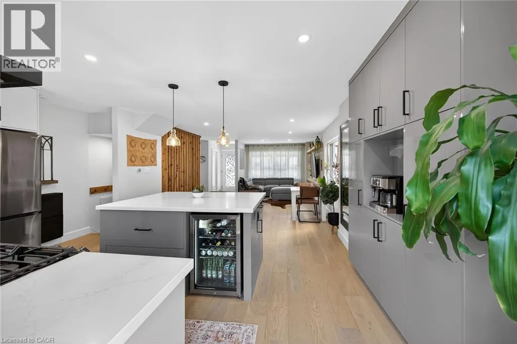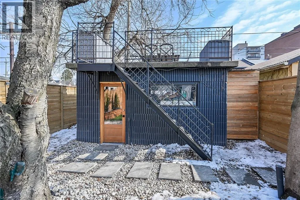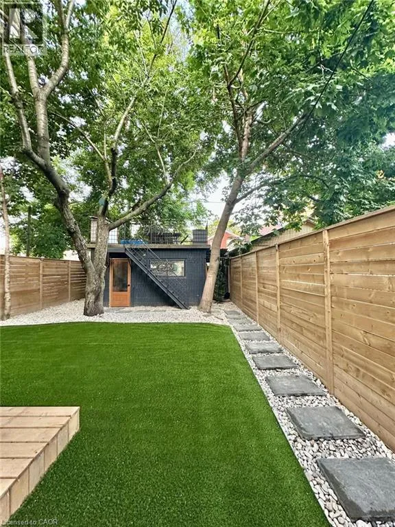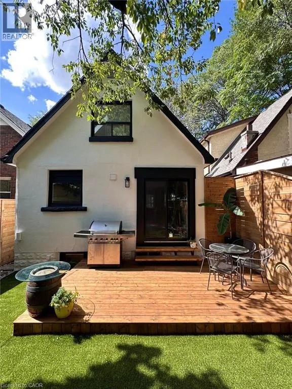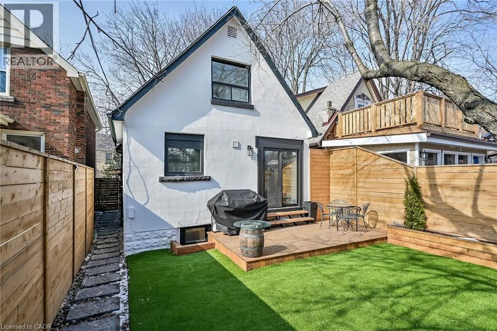 A must see in the heart of Corktown, one of Hamiltonâs most vibrant & walkable neighbourhoods. This thoughtfully designed turn-key 1.5-storey detached home blends modern comfort with low maintenance living, offering 2+1 bedrooms, 3 baths, detached garage & parking for 2 cars. Step inside to an airy open-concept main floor featuring engineered hardwood throughout, recessed lighting & seamless flow between living, dining & kitchen spaces. The stunning functional kitchen, showcases a large island with deep drawers, a pantry with coffee nook, sleek black SS appliances & beverage cooler, perfect for hosting. The second level features 2 sun-filled bedrooms with skylights, built-in cabinetry & his/hers double closets in the primary bedroom. Full bathroom with walk-in shower, tile flooring, double vanity & medicine cabinet, complete the space. The finished basement with over 500 sqft bonus living space offers a large recreation room, built-in closet storage, bright bedroom, 4-piece bathroom with soaker tub, dedicated laundry room & ample storage. Walk out to your private fully fenced backyard that feels like a hidden urban oasis. Surrounded by a natural canopy of mature trees, it features turf that's always green, a deck for lounging & a rare rooftop patio offering the perfect setting for summer backyard entertaining. The detached garage with automatic garage door opener plus additional parking provides two convenient parking spaces. Location is everything & this one delivers! Minutes to St. Joseph's & Juravinski Hospitals, the GO Station, steps to Corktown Park, Rail Trail, dog park, historical Corktown Pub. Within walking distance to the energy of the Augusta Street district, James Street North bars/restaurants, King William Street dining & performances at Theatre Aquarius. Catch a game or concert at the nearby TD Coliseum & enjoy quick mountain access via Claremont, Jolley Cut or Sherman Access. Stylish, smart & exceptionally located. This is Corktown living at its best. (id:27476)