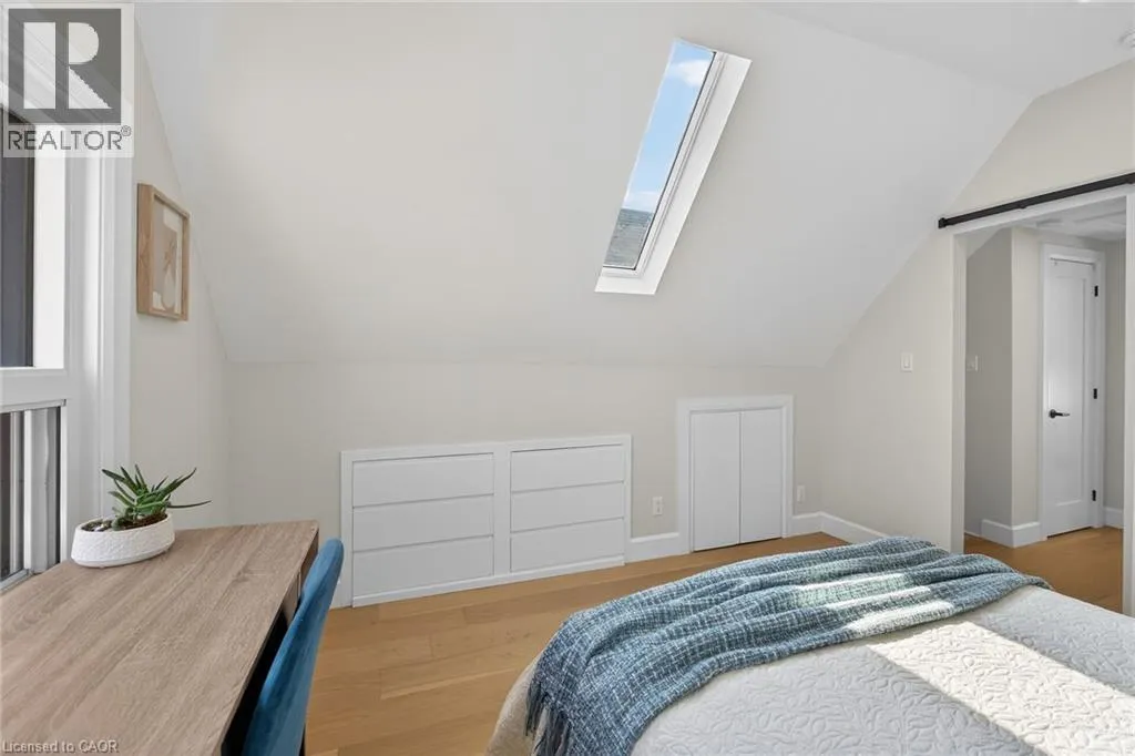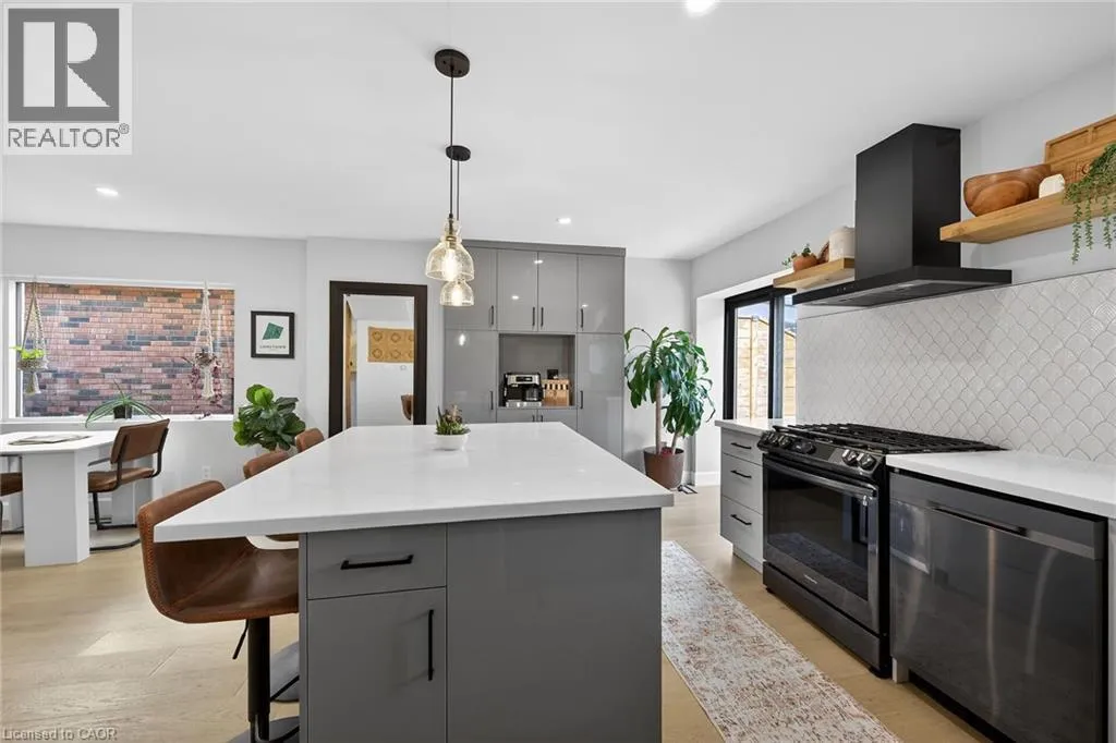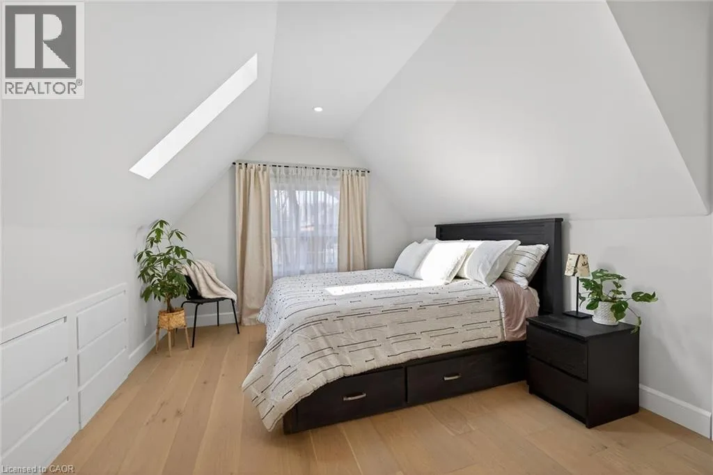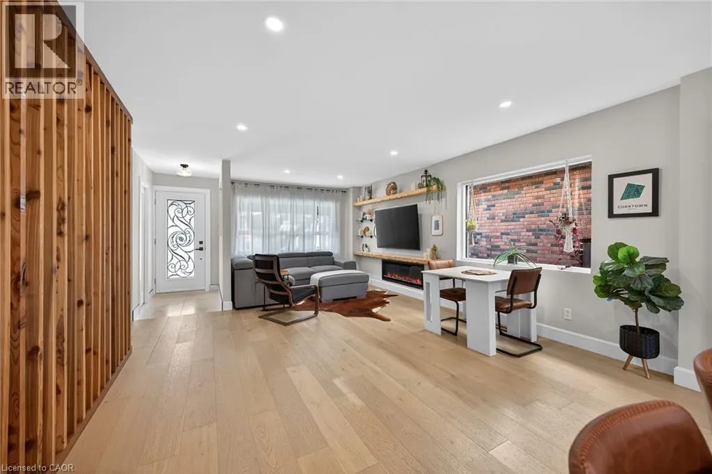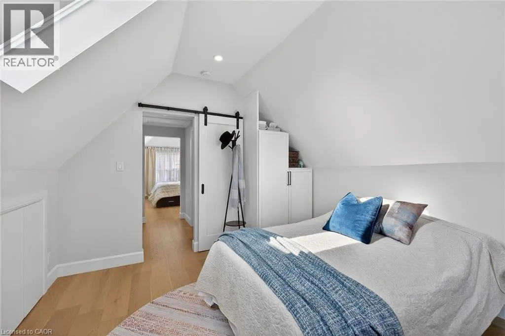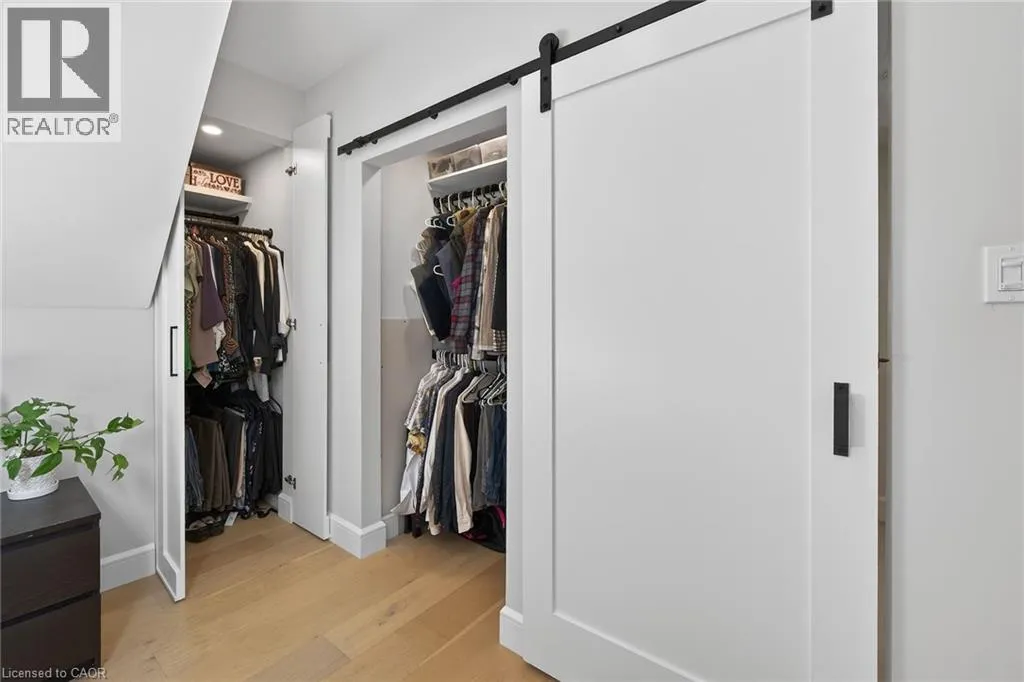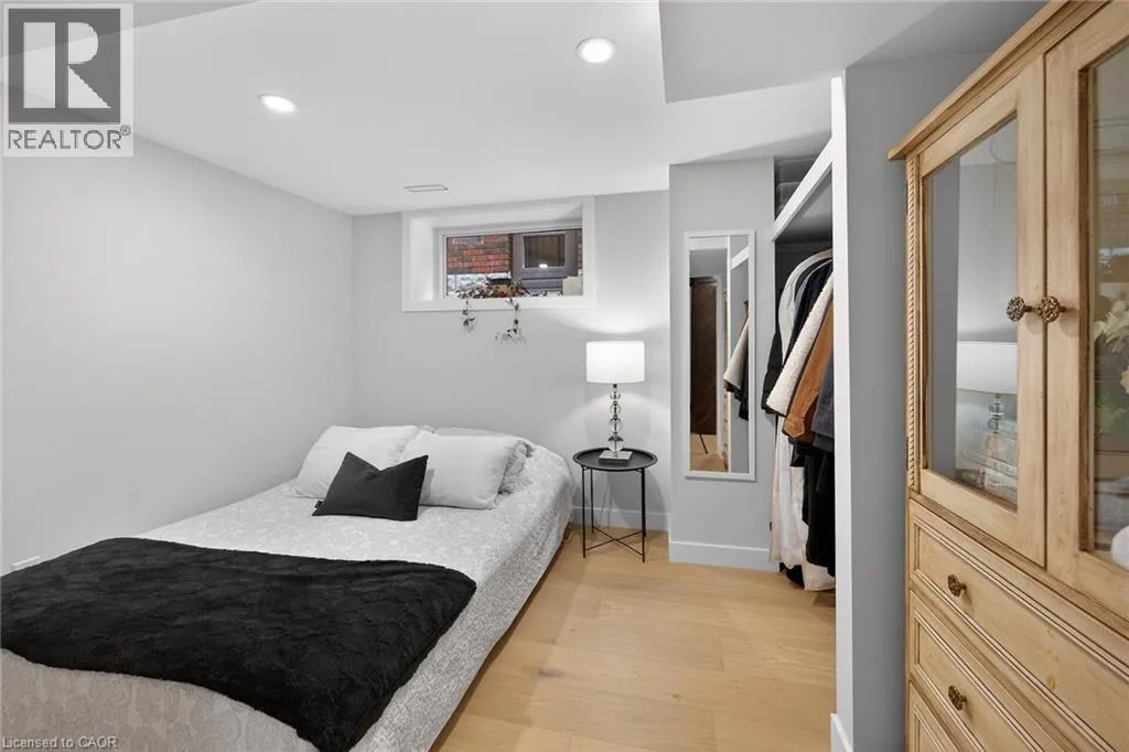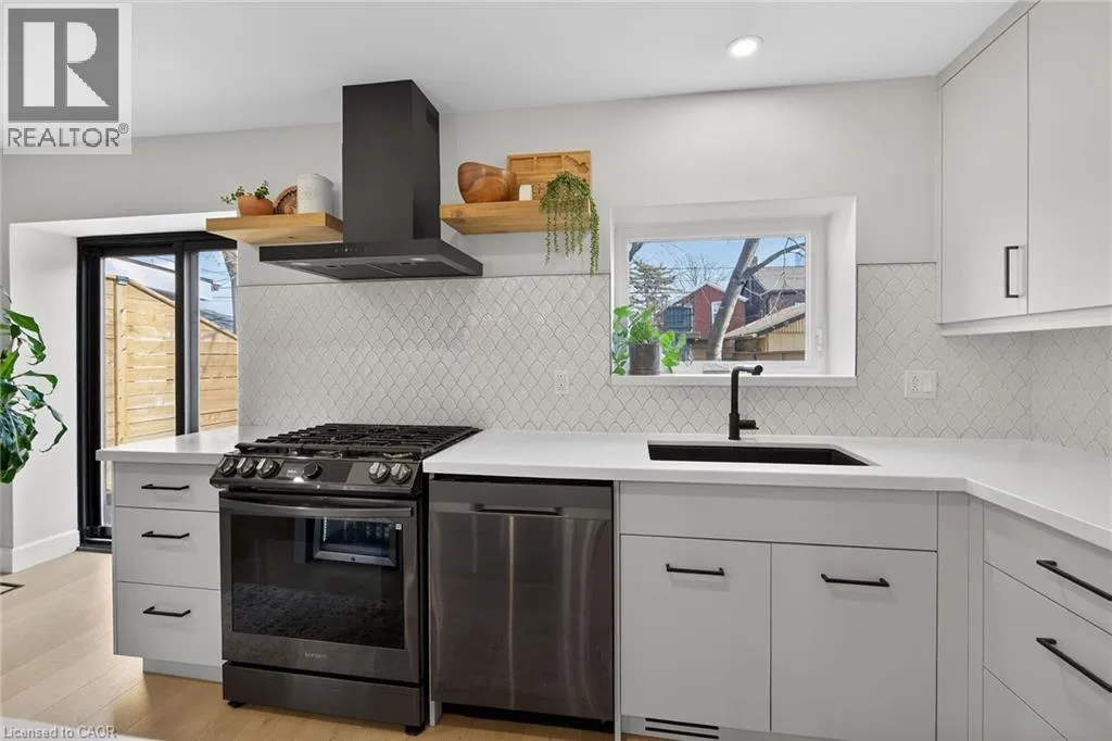 A must see in the heart of Corktown, one of Hamiltonâs most vibrant & walkable neighbourhoods. This thoughtfully designed turn-key 1.5-storey detached home blends modern comfort with low maintenance living, offering 2+1 bedrooms, 3 baths, detached garage & parking for 2 cars. Step inside to an airy open-concept main floor featuring engineered hardwood throughout, recessed lighting & seamless flow between living, dining & kitchen spaces. The stunning functional kitchen, showcases a large island with deep drawers, a pantry with coffee nook, sleek black SS appliances & beverage cooler, perfect for hosting. The second level features 2 sun-filled bedrooms with skylights, built-in cabinetry & his/hers double closets in the primary bedroom. Full bathroom with walk-in shower, tile flooring, double vanity & medicine cabinet, complete the space. The finished basement with over 500 sqft bonus living space offers a large recreation room, built-in closet storage, bright bedroom, 4-piece bathroom with soaker tub, dedicated laundry room & ample storage. Walk out to your private fully fenced backyard that feels like a hidden urban oasis. Surrounded by a natural canopy of mature trees, it features turf that's always green, a deck for lounging & a rare rooftop patio offering the perfect setting for summer backyard entertaining. The detached garage with automatic garage door opener plus additional parking provides two convenient parking spaces. Location is everything & this one delivers! Minutes to St. Joseph's & Juravinski Hospitals, the GO Station, steps to Corktown Park, Rail Trail, dog park, historical Corktown Pub. Within walking distance to the energy of the Augusta Street district, James Street North bars/restaurants, King William Street dining & performances at Theatre Aquarius. Catch a game or concert at the nearby TD Coliseum & enjoy quick mountain access via Claremont, Jolley Cut or Sherman Access. Stylish, smart & exceptionally located. This is Corktown living at its best. (id:27476)