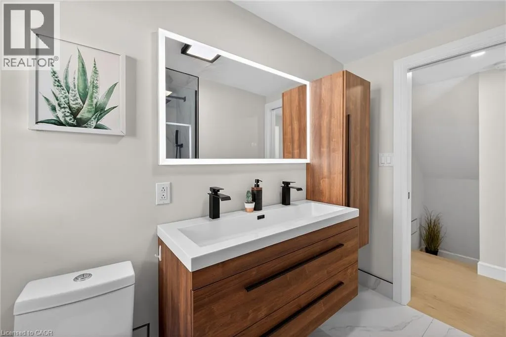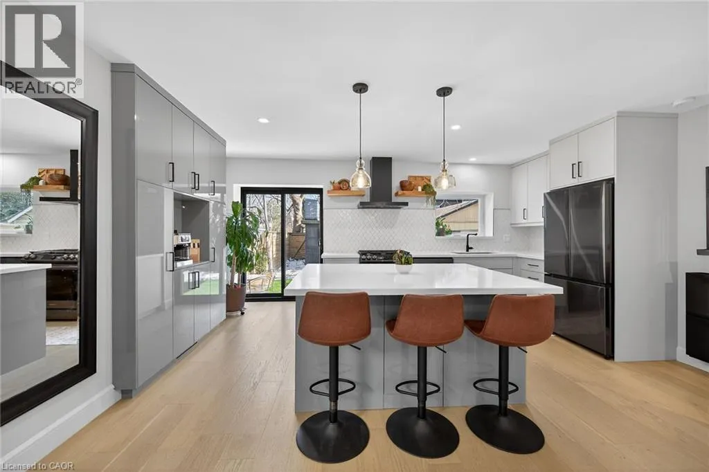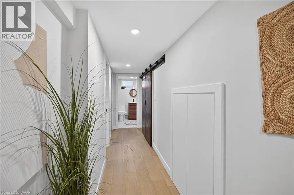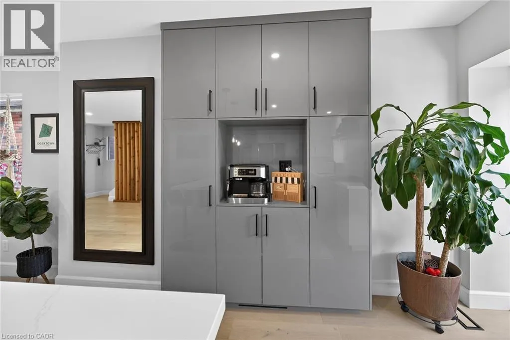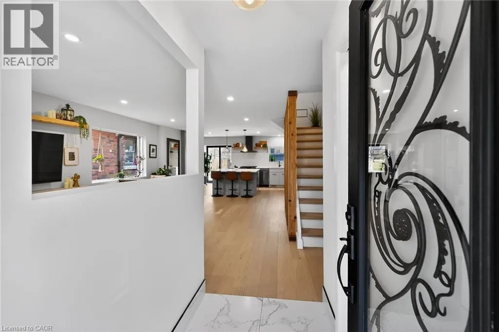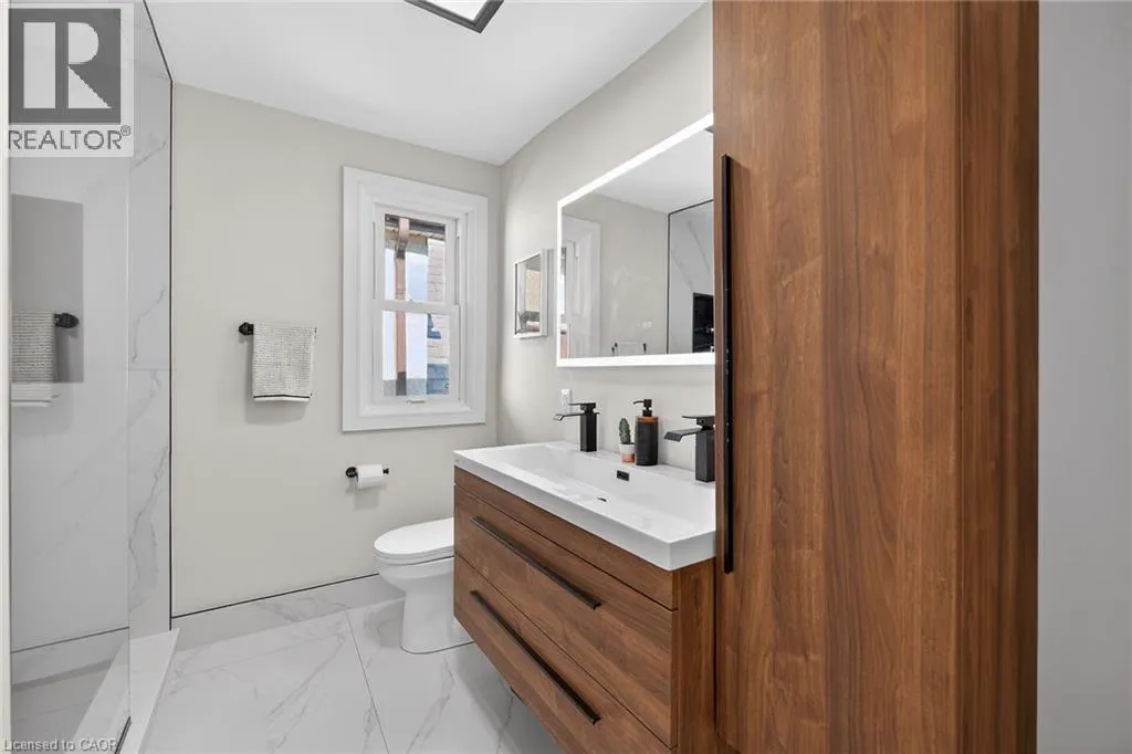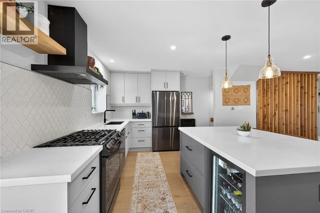 A must see in the heart of Corktown, one of Hamiltonâs most vibrant & walkable neighbourhoods. This thoughtfully designed turn-key 1.5-storey detached home blends modern comfort with low maintenance living, offering 2+1 bedrooms, 3 baths, detached garage & parking for 2 cars. Step inside to an airy open-concept main floor featuring engineered hardwood throughout, recessed lighting & seamless flow between living, dining & kitchen spaces. The stunning functional kitchen, showcases a large island with deep drawers, a pantry with coffee nook, sleek black SS appliances & beverage cooler, perfect for hosting. The second level features 2 sun-filled bedrooms with skylights, built-in cabinetry & his/hers double closets in the primary bedroom. Full bathroom with walk-in shower, tile flooring, double vanity & medicine cabinet, complete the space. The finished basement with over 500 sqft bonus living space offers a large recreation room, built-in closet storage, bright bedroom, 4-piece bathroom with soaker tub, dedicated laundry room & ample storage. Walk out to your private fully fenced backyard that feels like a hidden urban oasis. Surrounded by a natural canopy of mature trees, it features turf that's always green, a deck for lounging & a rare rooftop patio offering the perfect setting for summer backyard entertaining. The detached garage with automatic garage door opener plus additional parking provides two convenient parking spaces. Location is everything & this one delivers! Minutes to St. Joseph's & Juravinski Hospitals, the GO Station, steps to Corktown Park, Rail Trail, dog park, historical Corktown Pub. Within walking distance to the energy of the Augusta Street district, James Street North bars/restaurants, King William Street dining & performances at Theatre Aquarius. Catch a game or concert at the nearby TD Coliseum & enjoy quick mountain access via Claremont, Jolley Cut or Sherman Access. Stylish, smart & exceptionally located. This is Corktown living at its best. (id:27476)