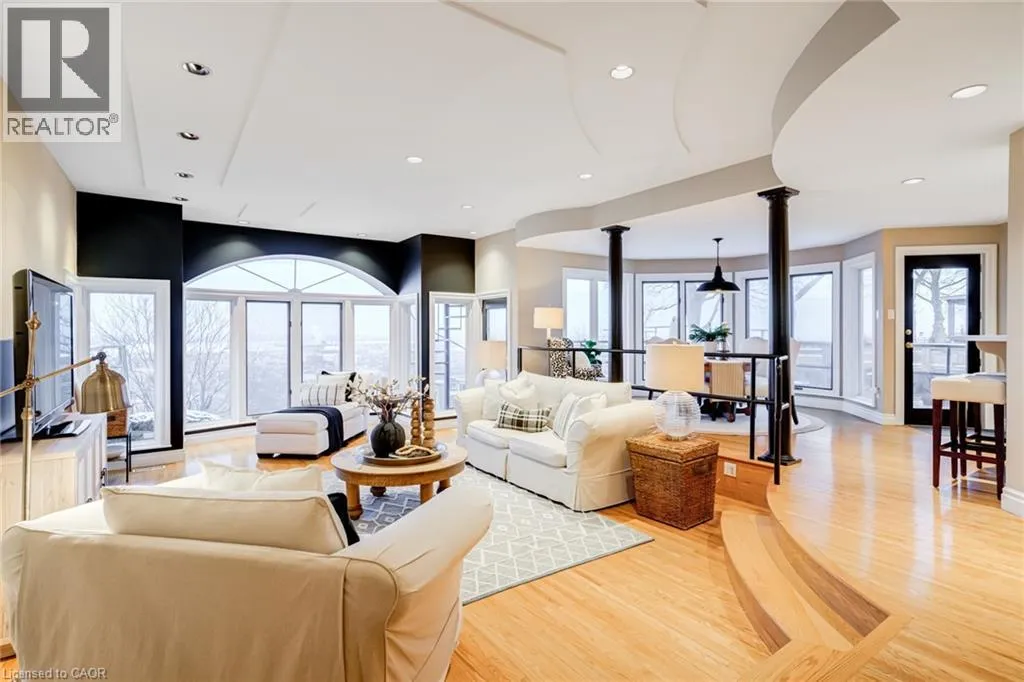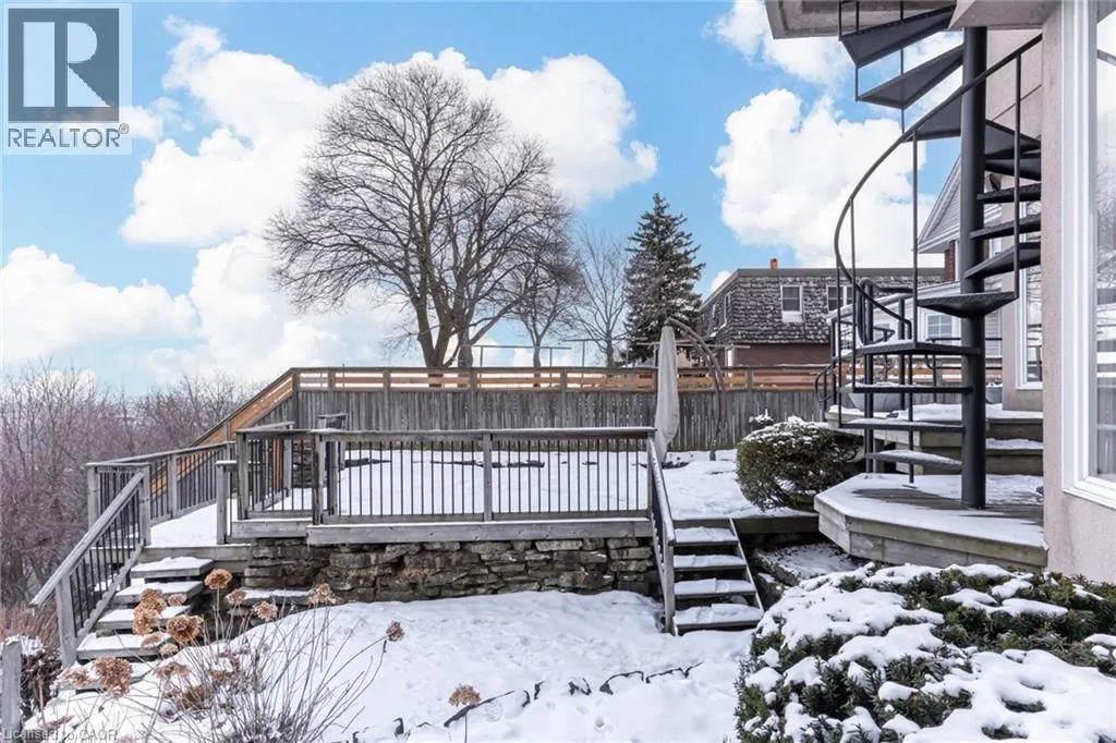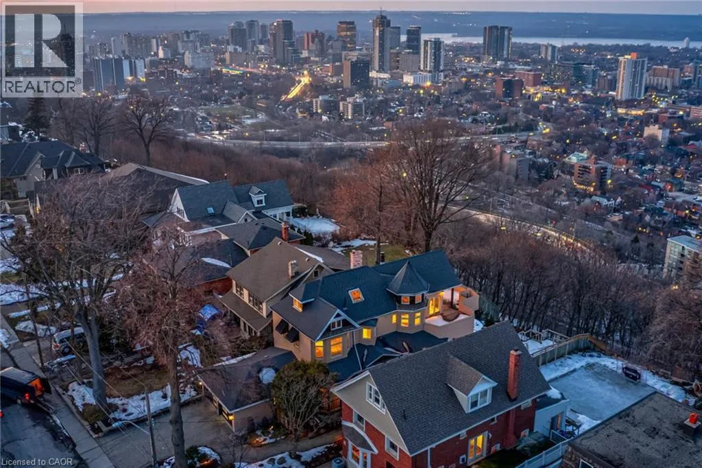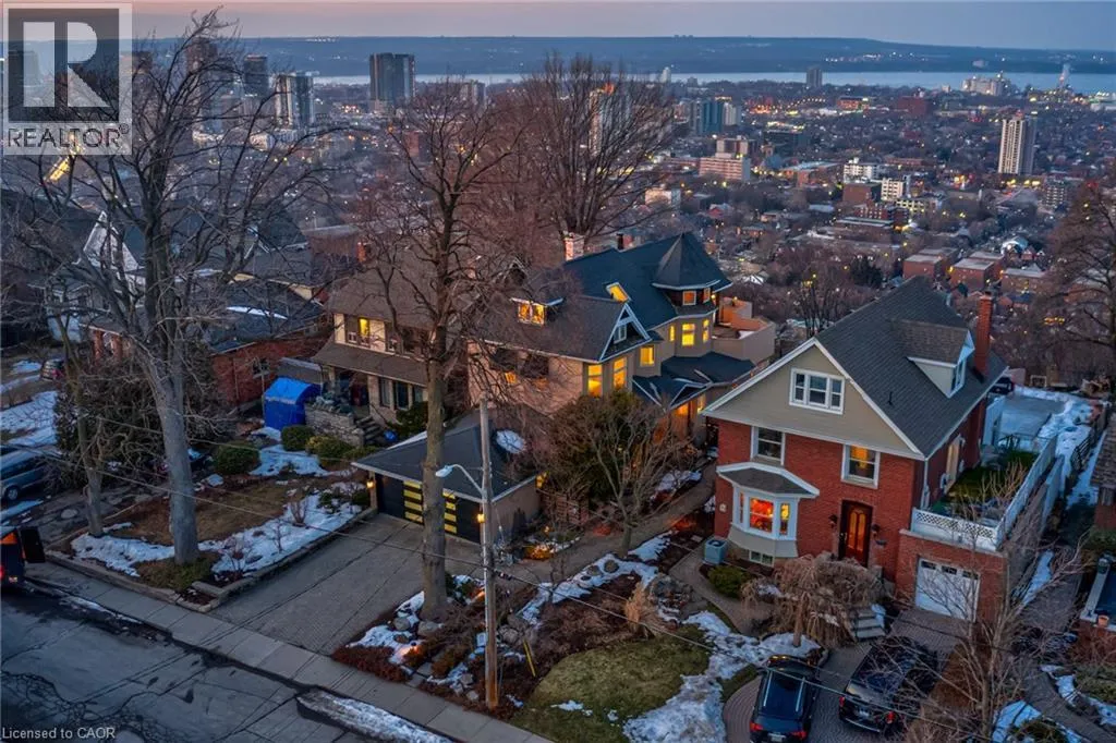 Concession St to Belwood Ave, right on Mountain Park Ave Timeless character meets one of Hamiltonâs most breathtaking views. Perched along the Niagara Escarpment, this iconic residence captures panoramic vistas of the Hamilton skyline, Lake Ontario, and even Toronto in the distanceâtransforming every sunrise, sunset, and city light into a daily masterpiece. Originally built in 1907 by Canadian playwright and actor Horatio George Summers, this generational family home seamlessly blends historic charm with thoughtful modern updates across approx. 3,300 square feet of living space. Designed for unforgettable entertaining, the open-concept main level features floor-to-ceiling windows that flood the home with natural light, highlighting rich hardwood floors and framing spectacular views. A spacious kitchen with breakfast bar anchors the space, effortlessly connecting multiple dining areas and a sunken living room that invites you to gather and unwind. A private front office overlooking the porch, stylish powder room, and updated laundry room with inside access to the double garage complete the main floor. The second and third levels offer five bedrooms and three full bathrooms, providing ideal flexibility for families, guests, or work-from-home living. The primary suite is a true retreat, featuring a barrel ceiling, wood-burning fireplace, walk-in closet, and beautifully renovated 5-piece ensuite. Step onto your private 500 sq. ft. balcony and take in 180 degrees of uninterrupted city views with your morning coffee. The third level adds more character with skylights, a full bath, additional bedroom, office space, and a distinctive turret-style sitting area perfect for reading or a creative play space. Outside, a multi-tiered backyard carved into the Escarpment showcases layered gardens, a four-tier entertaining deck, extended outdoor living space, and a spiral staircase to the upper balcony. Just steps to Juravinski Hospital, Concession Street, the Escarpment stairs, and Rail Trail. A piece of Hamiltonâs history, elevated. (id:27476)