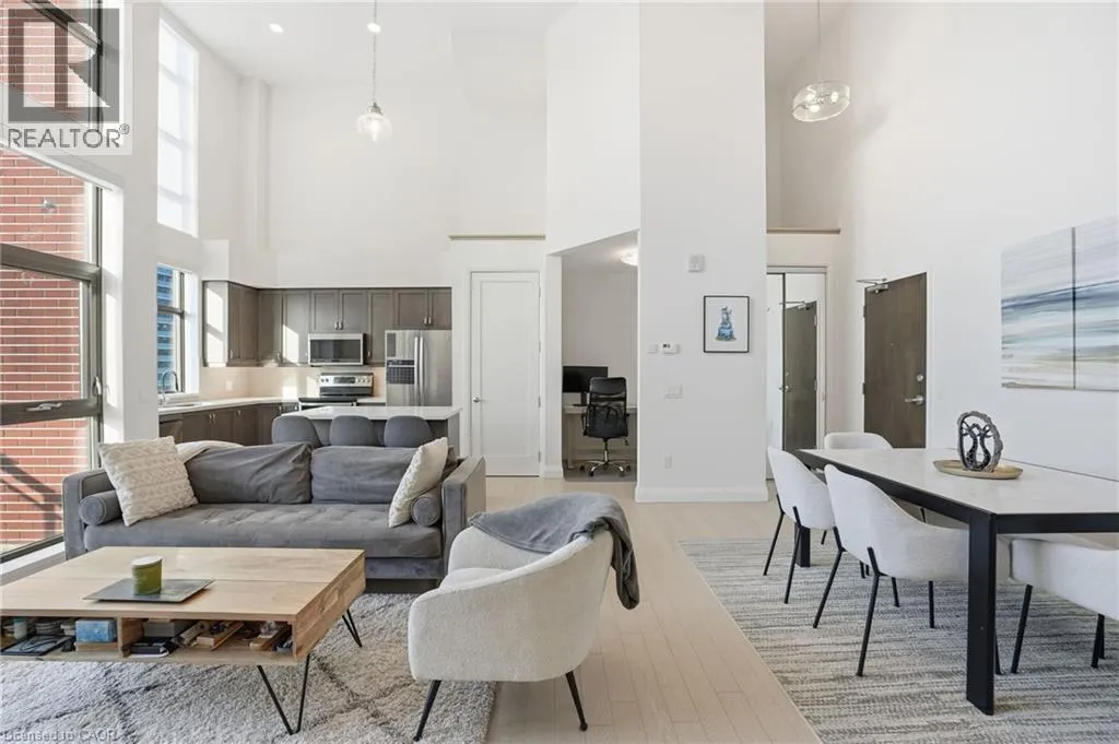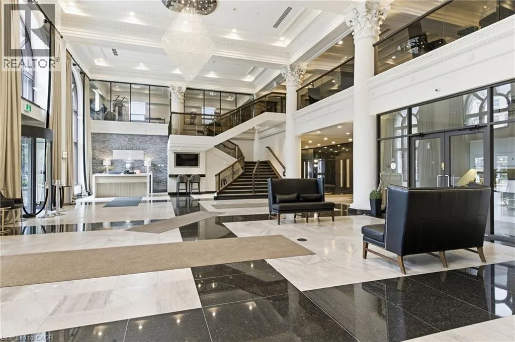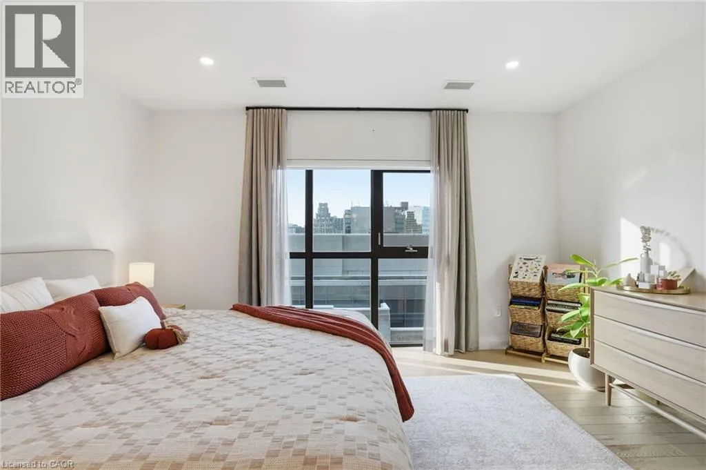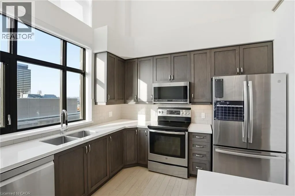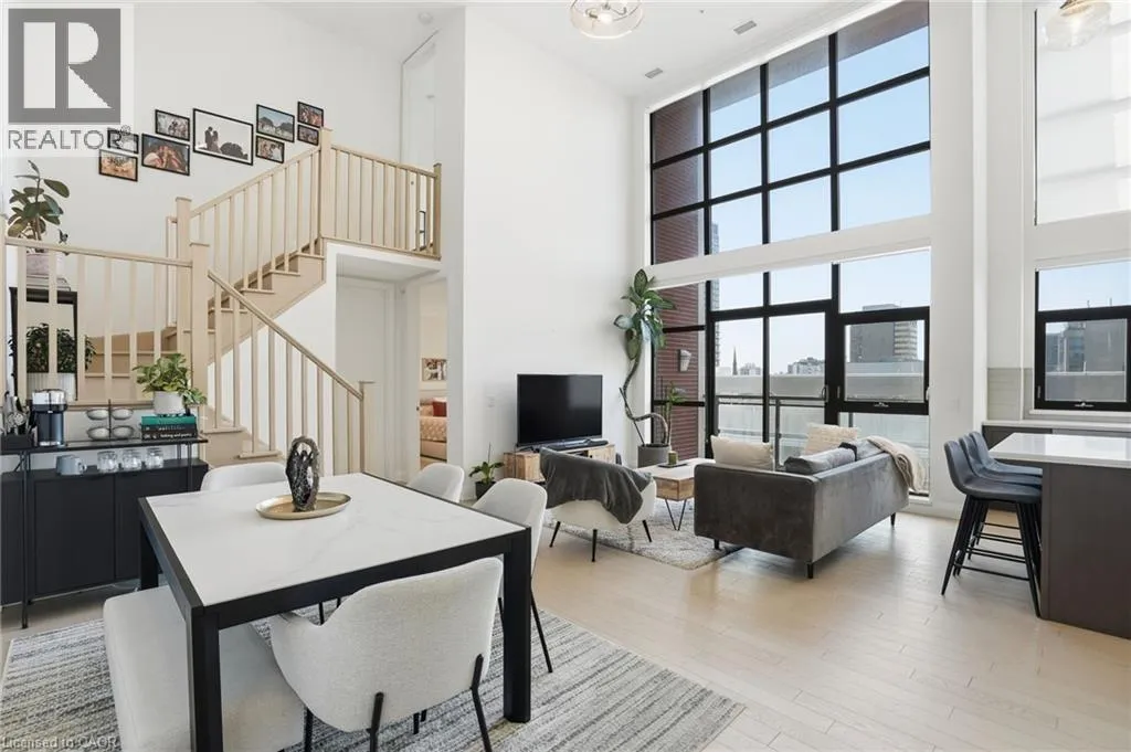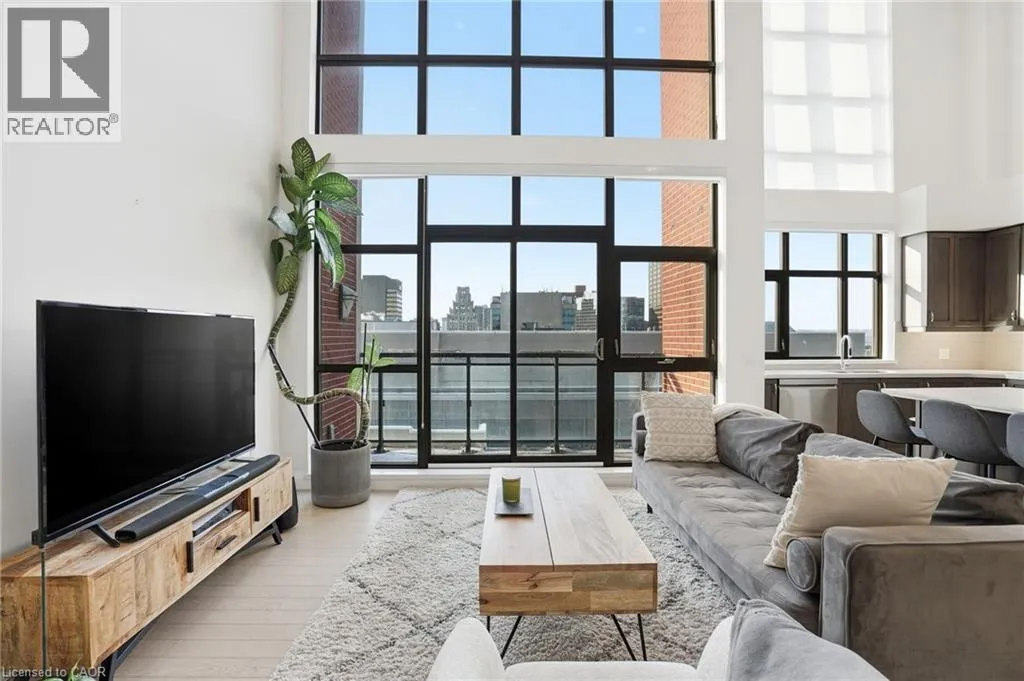 Catharine St & John St next to Gore Park Step into elevated city living in this rare two-storey 2-bedroom, 2-bathroom, plus den lower penthouse at the iconic Residences of Royal Connaught. This 1,267 sq ft west-facing suite features dramatic 18-foot ceilings, expansive floor-to-ceiling windows, and breathtaking, unobstructed views of the Escarpment, Gore Park, and Hamilton Harbour. The main level offers a bright open-concept living space with a den, laundry, and a spacious primary bedroom complete with walk-in closet and ensuite privileges, delivering true one-floor convenience. Upstairs, the second bedroom boasts its own 4-piece ensuite, ideal for guests or family. Thoughtful upgrades include quartz countertops, under-cabinet lighting, engineered hardwood floors, and custom motorized blinds. Enjoy your private balcony, ample storage throughout, and access to premium amenities including a rooftop terrace with fireplace and BBQs, party and media rooms, and a fully equipped gym. Starbucks is conveniently located between the two lobbies, just an elevator ride away. Unbeatable location steps to the GO Station, James Street North, King William Street, the Art Gallery of Hamilton, the Farmersâ Market, and more. Includes 1 underground parking and a storage locker located right next to the unit, with rental of a second parking spot available. Luxe, location, and lifestyle all in one. (id:27476)