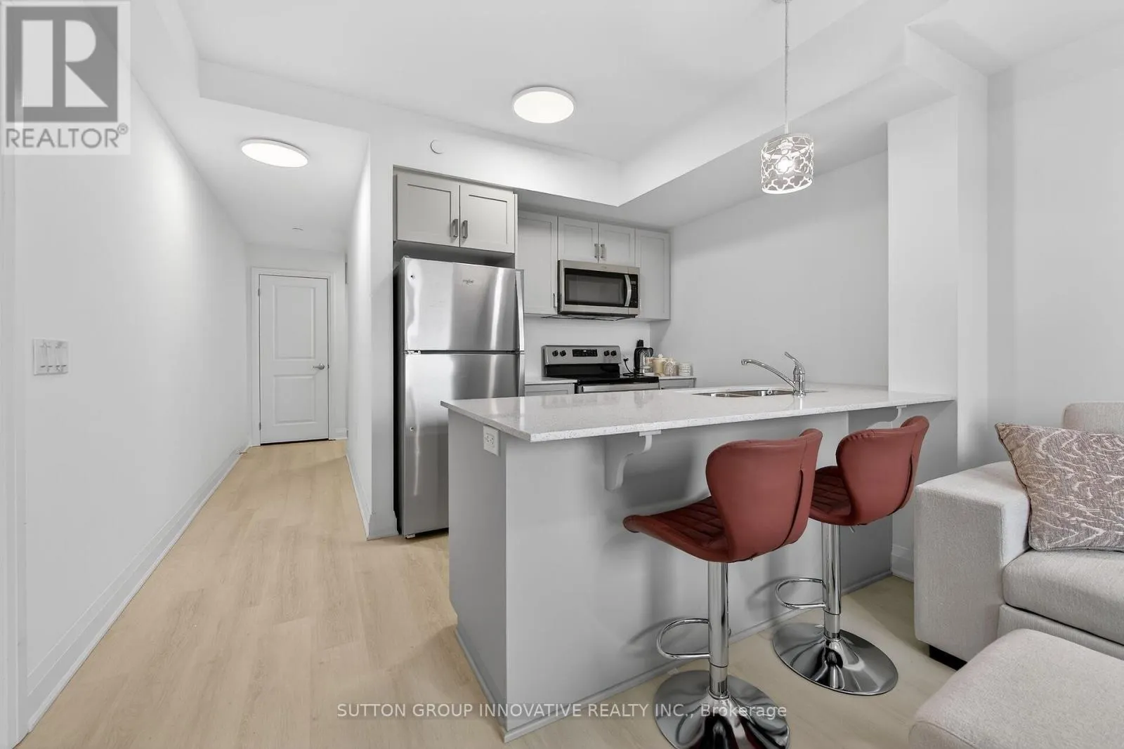 Cross Streets: FLETCHER ROAD. ** Directions: FROM UPPER RED HILL PKWY, EAST ON RYMAL RD E, PROPERTY IS ON SOUTH SIDE OF RYMAL. PRIME LOCATION! Welcome to PEAK CONDOS within the upper Stoney Creek across from Eramosa Karst Conservation Area, a stunning 5 Storey building that has an attractive exterior which combines stone with timeless glass & wood. Bright, sun-filled, thoughtfully designed 1 Bedroom features 9-foot ceilings and stylish upgrades throughout. Enjoy quartz countertops, an undermount sink, sleek vinyl plank flooring, pot lights with upgraded all light fixtures, and the convenience of in-suite laundry. All S.S appliances included. Comes with 1 parking spot and locker! Tasteful landscaping surrounds the development adding the appeal of greenery on multiple sides. Ample onsite vehicle parking, bicycle storage, fitness center, lockers, party room (birthdays, showers, and graduations can be celebrated in style), rooftop amenities with group seating & dining areas, modern lobby greets visitors, presenting a welcome entranceway. With easy access to shopping, parks, schools, restaurants, transit, and major highways, this move-in-ready condo is an excellent opportunity for first-time buyers, professionals, or downsizers seeking stylish, low-maintenance living. (id:27476)