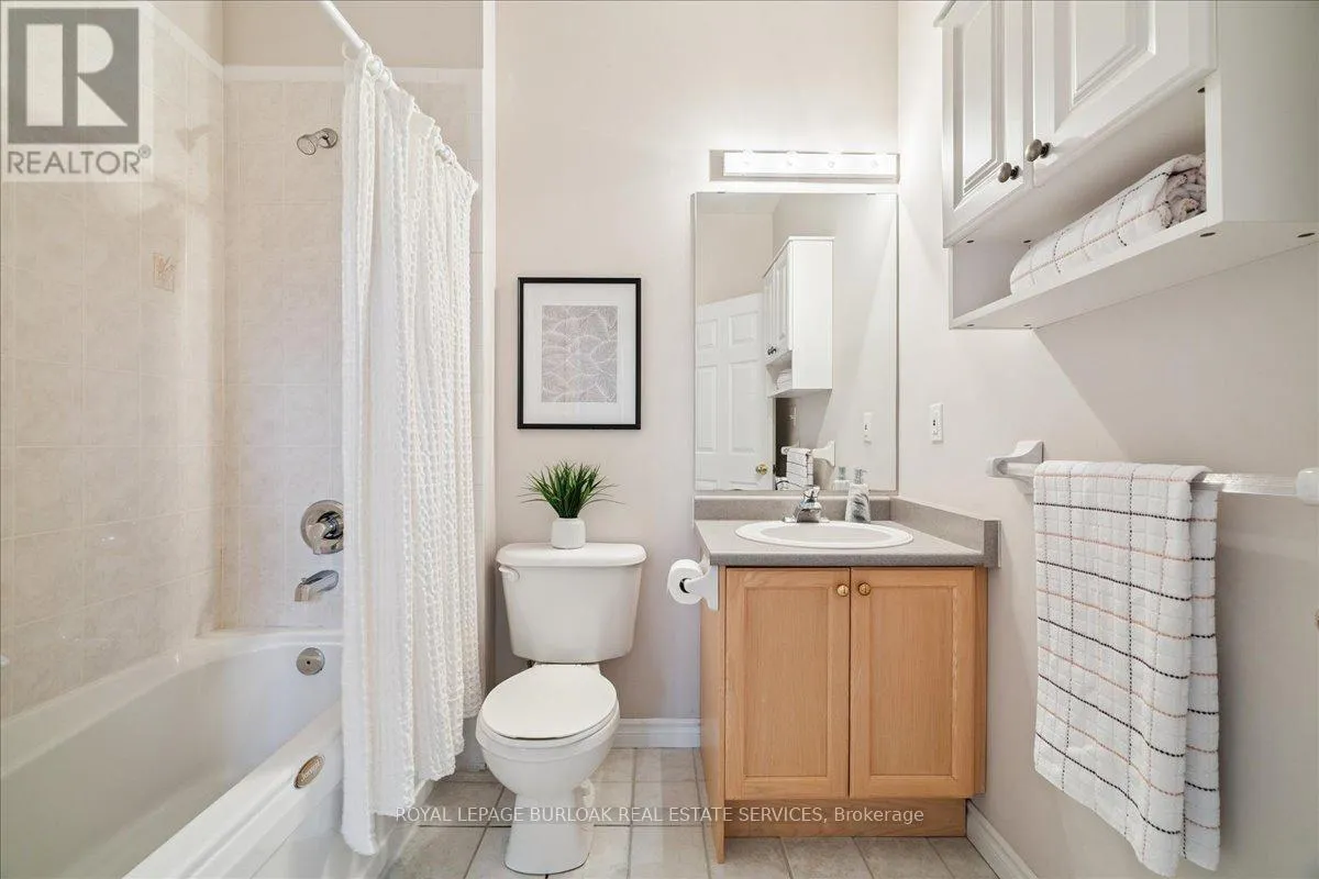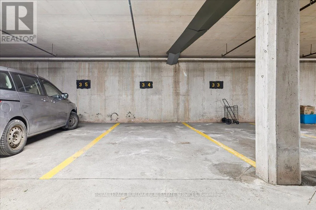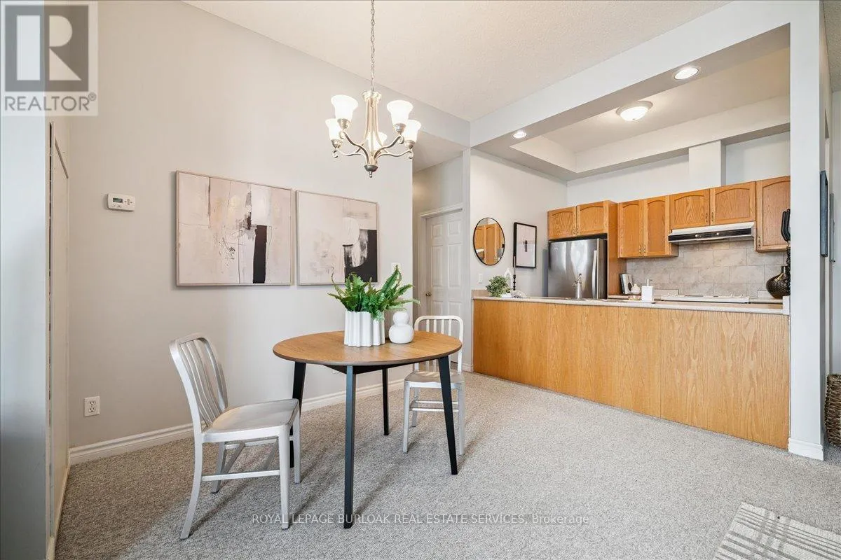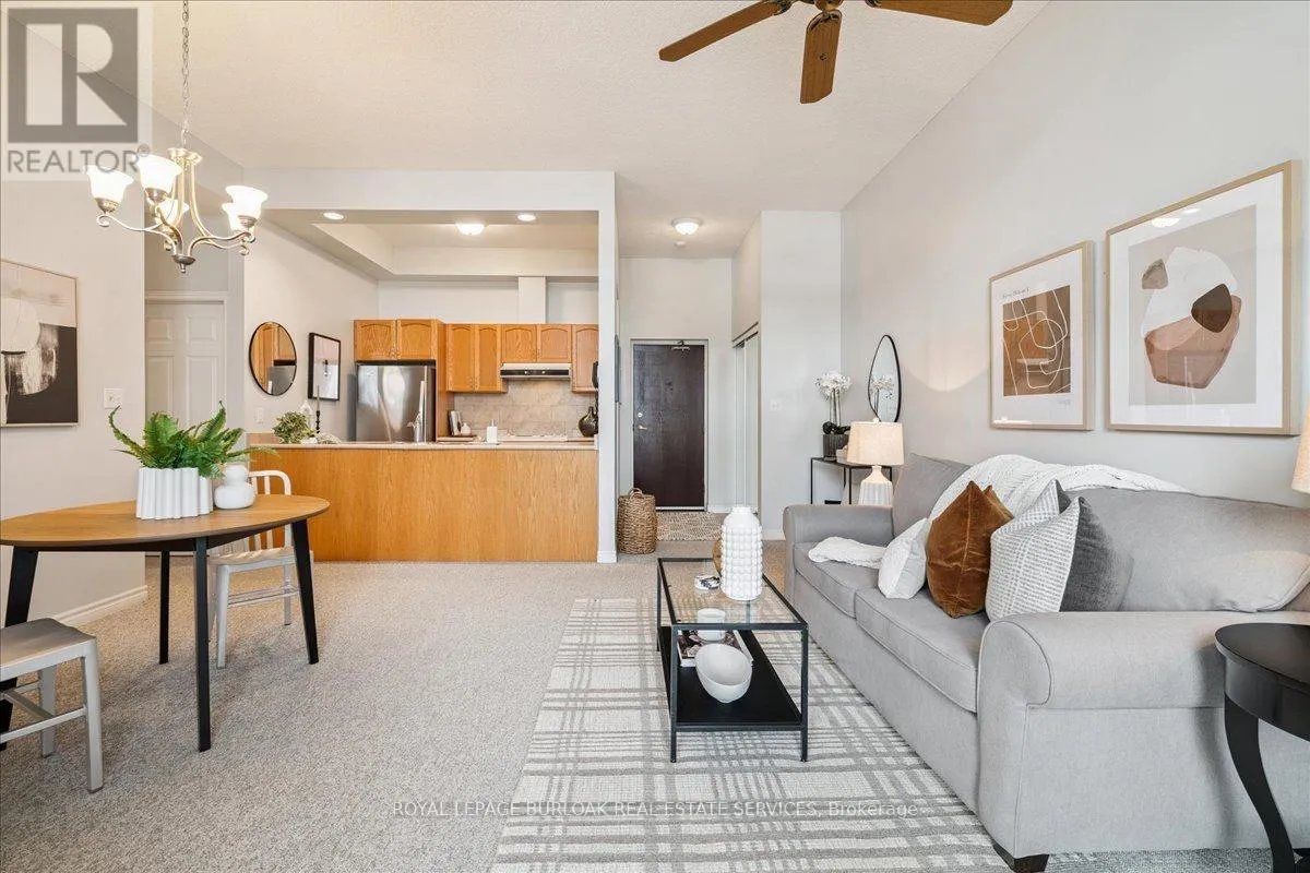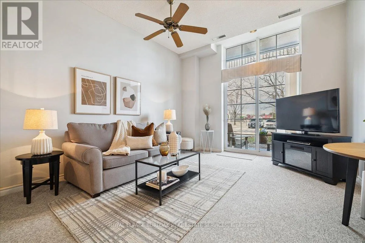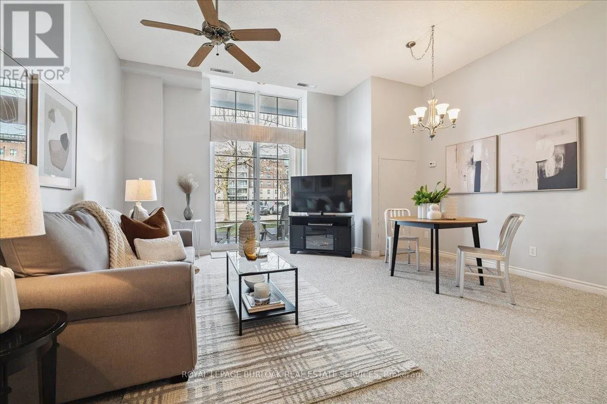 Dundas St. E and Hamilton St. S Welcome to this beautiful and spacious 2 bedroom, 2 full bathroom condo located in the highly sought-after Historic Waterdown High School building. Featuring a desirable open-concept layout with impressive 10 ft ceilings, large windows, and transom details, this unit offers a bright and inviting living space filled with natural light. The thoughtfully designed floor plan provides comfortable living and dining along with two well-proportioned bedrooms, including a primary suite complete with its own full ensuite. A sliding door leads to your personal patio space, extending the living area for morning coffees or sunset beverages. Ideally positioned on the first floor and located near the east building entrance, this unit offers exceptional accessibility and everyday convenience-making it one of the most convenient locations in the building. Additional features include in-suite laundry, a large storage locker, and two parking spaces-one underground and one surface space located directly across from the unit. Situated in the heart of Waterdown, this condo is just steps from local shops, restaurants, parks, and everyday amenities, offering comfortable, low-maintenance living in one of the community's most charming and walkable locations. (id:27476)