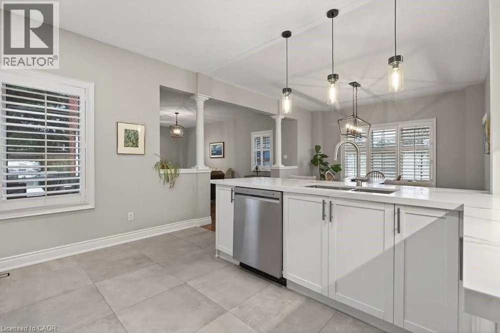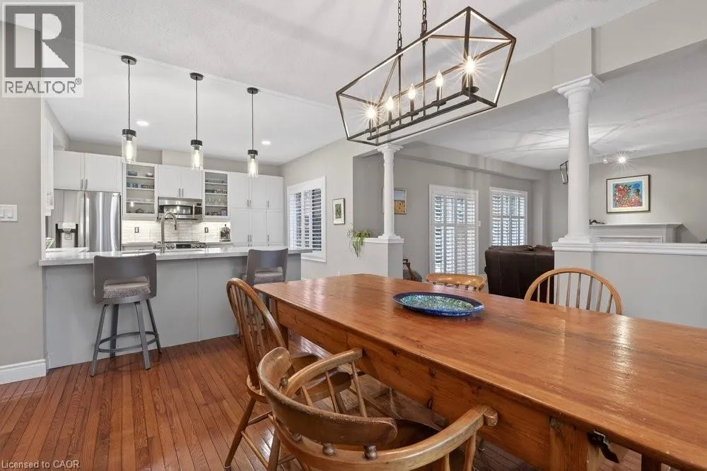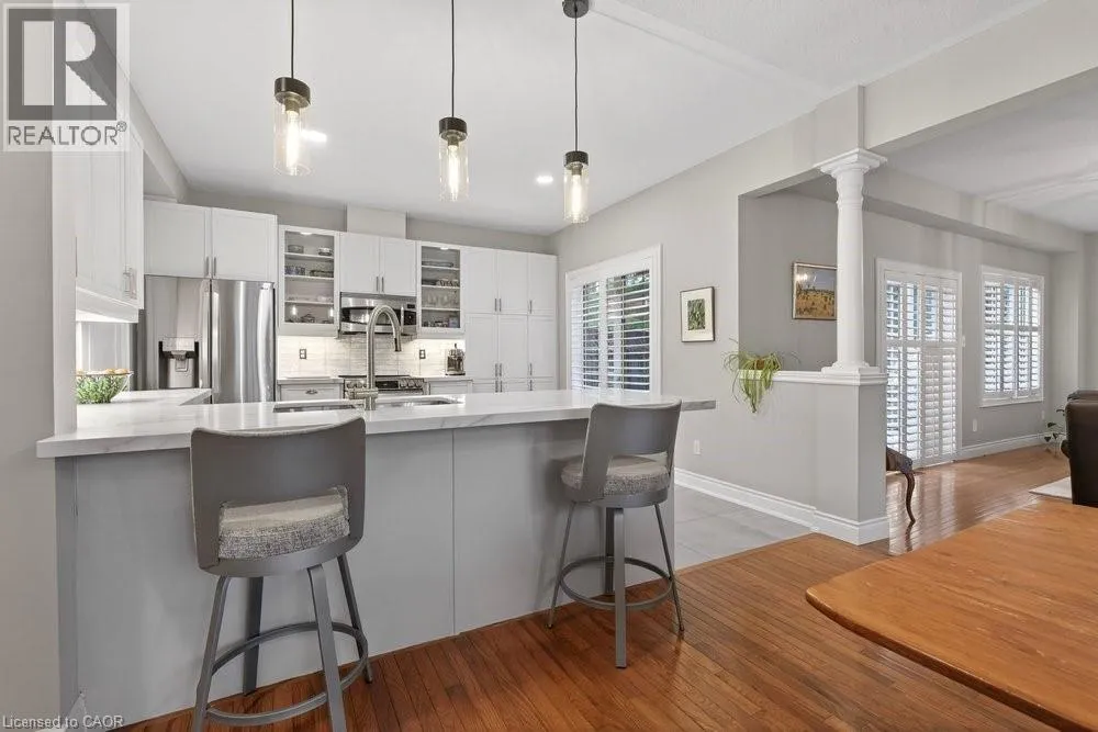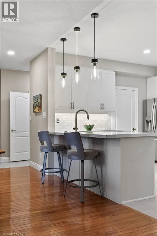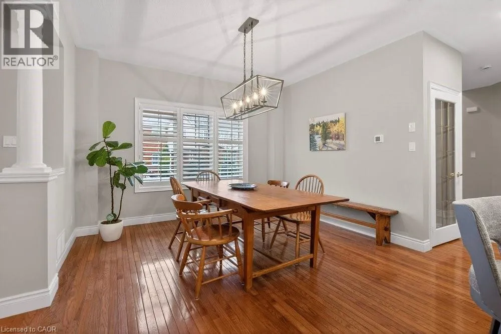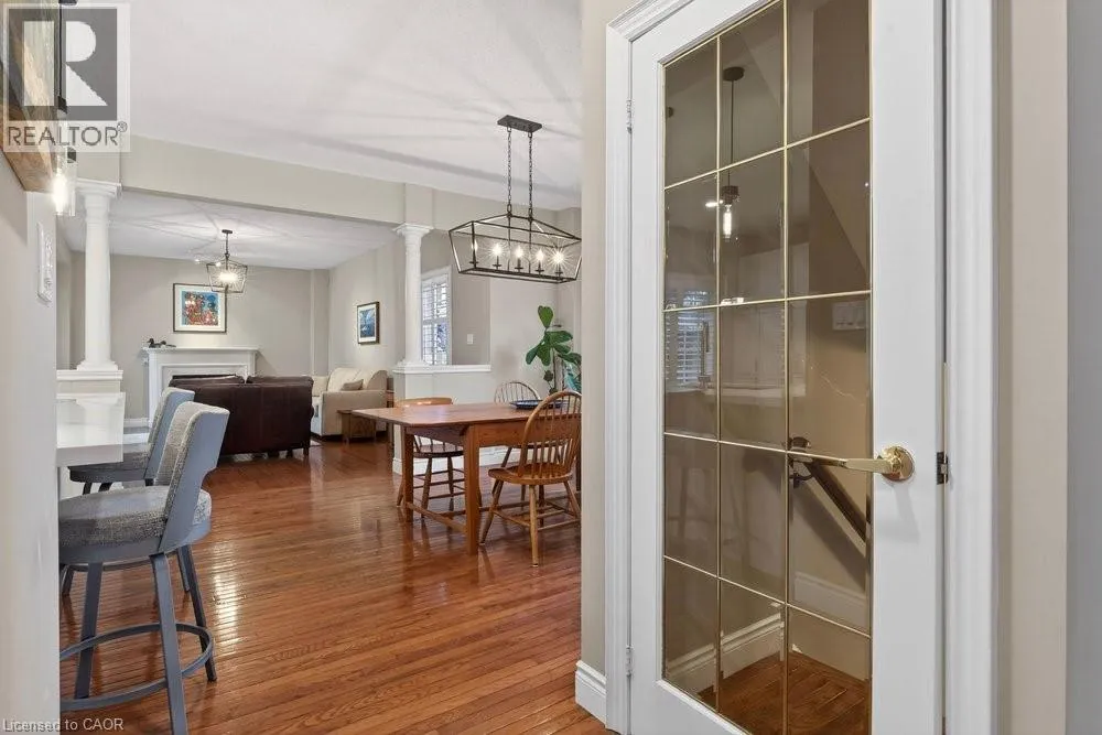 ABERDEEN TO STUDHOLME RD TO BEDDOE DR TO 100 Complex entry Welcome to this bright end-unit townhome with the rare feature of a double-car garage, located in the Fairways at Chedoke of the south Kirkendall community. Beautifully maintained, this home offers a wonderful blend of comfort, convenience, and a low-maintenance âlock-and-goâ lifestyle. Extra windows unique to end units fill the home with natural light. The main level welcomes you with a two-storey foyer that opens to the living and dining rooms, highlighted by gleaming hardwood floors and a cozy gas fireplace. Sliding doors lead to your private deck and yardâperfect for relaxing or entertaining. The stunning kitchen is designed for everyday living and hosting, featuring abundant cabinetry, quartz countertops, a peninsula for casual seating, tile backsplash, and stainless steel built-in appliances, including an induction stove. Upstairs, the spacious primary suite offers two closets, including a walk-in, and a 5-piece ensuite with separate shower and soaker tub. Two additional bedrooms and a 4-piece bath complete the level. California shutters enhance most windows, while blackout blinds in the bedrooms add comfort. Extended living space in the fin'd bsmt. with a large Rec room, a den or gym, a 3-piece bathroom, and storage. A main-floor powder room and laundry with inside entry from the garage add convenience. Enjoy views of Chedoke Golf Course as you come and go. 100 Beddoe Drive offers visitor parking and a central park with walking path and playground. Monthly condo fees of $494.23 include exterior maintenance and insurance, common elements, snow removal, landscaping, and water. Steps to Chedoke Golf Course, the Bruce Trail, conservation lands, and scenic walking paths, and just minutes to schools, McMaster University, Innovation Park, Locke Street Village, and Westdale Village. With easy access to the 403, GO Transit, and bus routes, commuting is simple. Flexible possession available, including the possibility of an early closing. (id:27476)