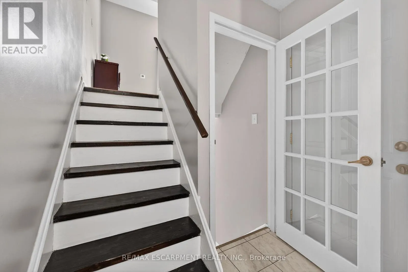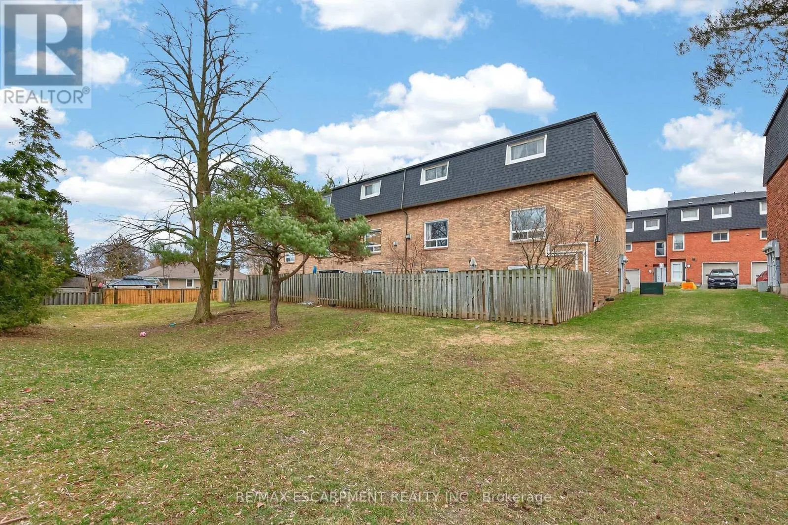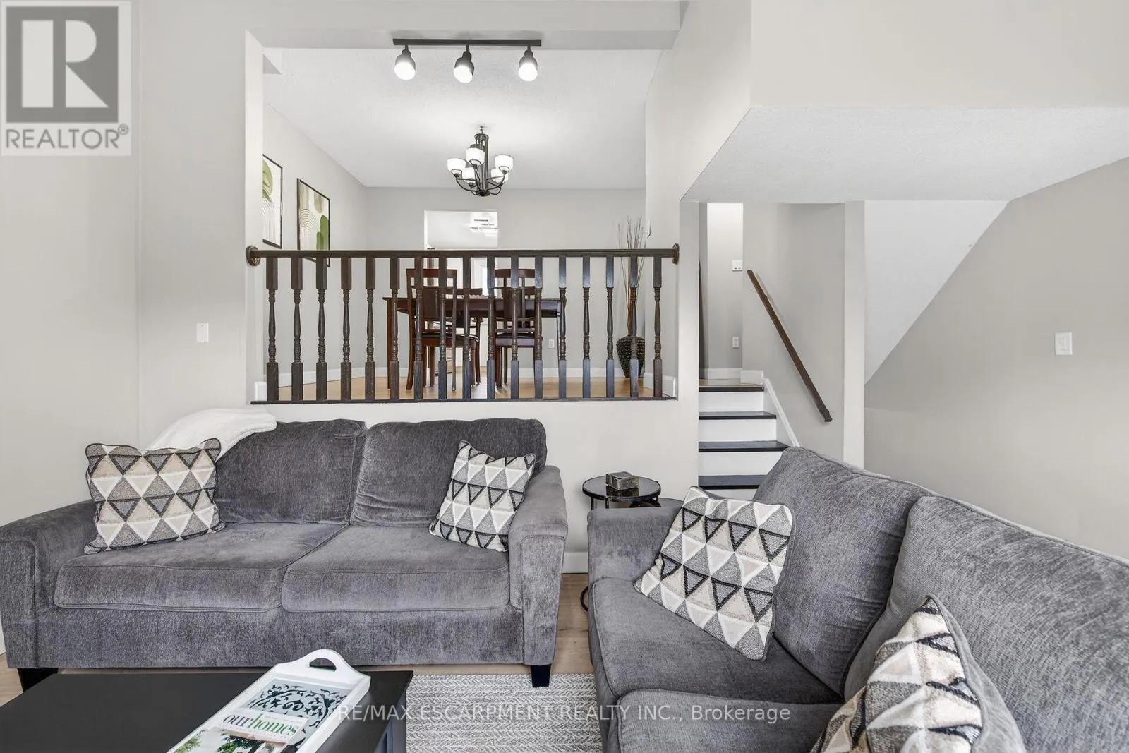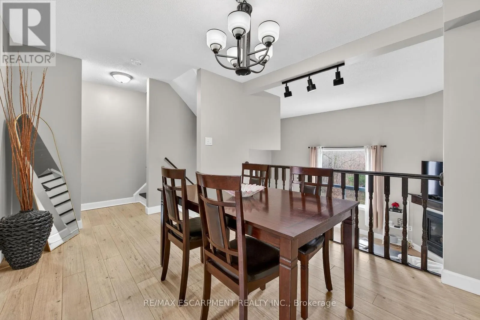 Cross Streets: King St East and New Mountain Road. ** Directions: -. Rarely offered multi level townhouse at the base of the Escarpment in downtown Stoney Creek. Impressive and bright main floor space with a high vaulted ceiling and gas fireplace. Updated kitchen and appliances with extended eat-in area. Upper level with large primary bedroom and updated bathroom. Lower level walk-out to private backyard area. Well managed and maintained complex. Located in a quiet and low traffic cul-de-sac within a short walk or drive to Stoney Creek amenities and instant access to the Escarpment via Mountain Road. A great start for first time buyers entering the market! (id:27476)