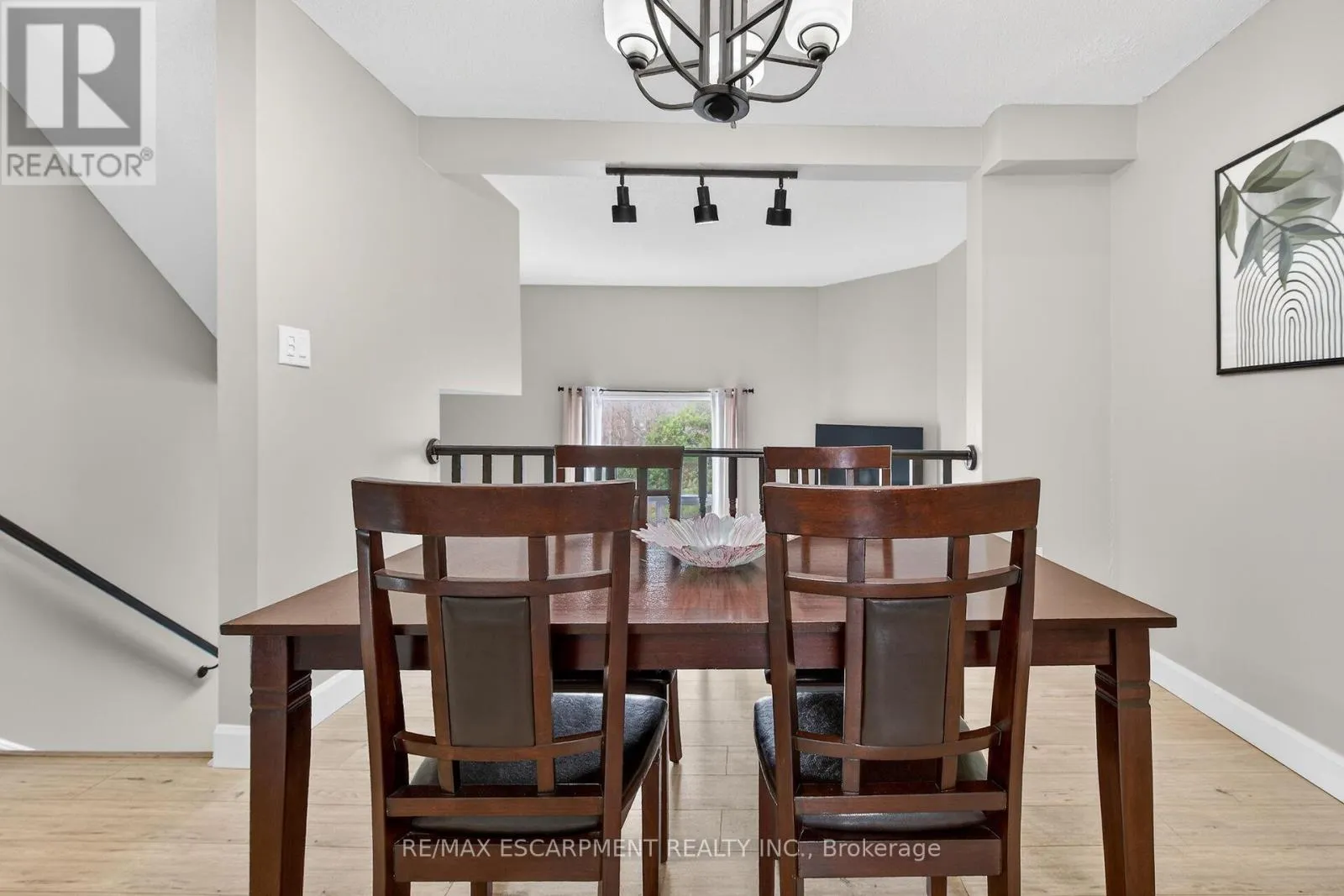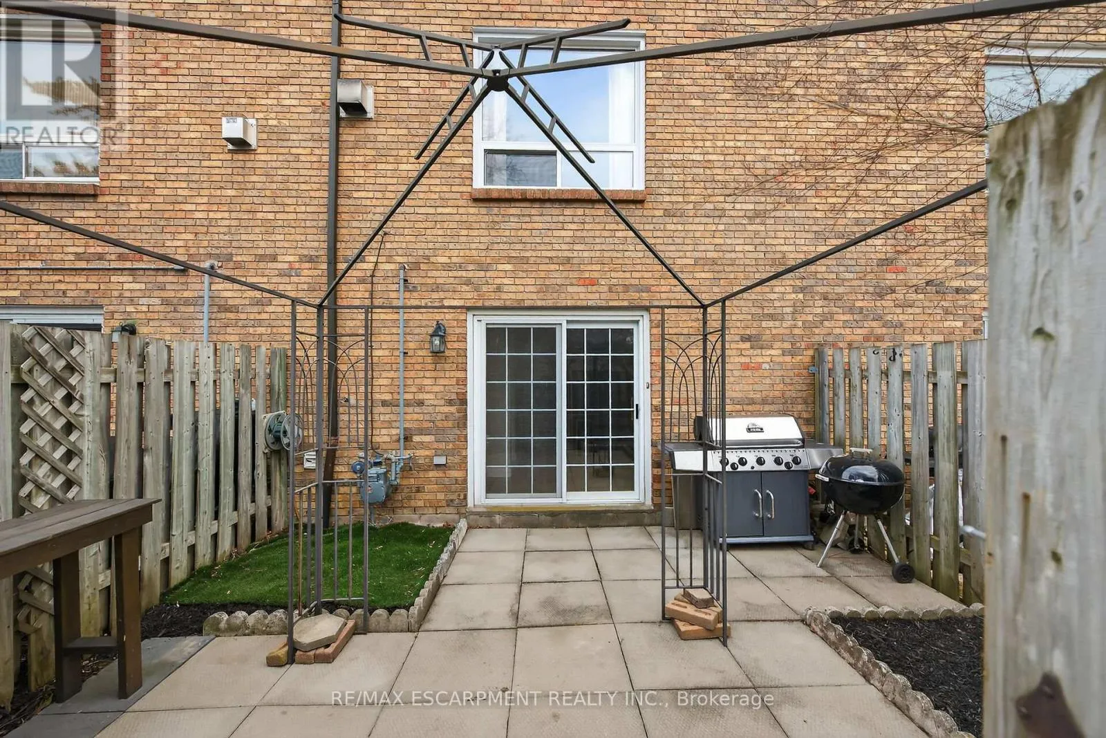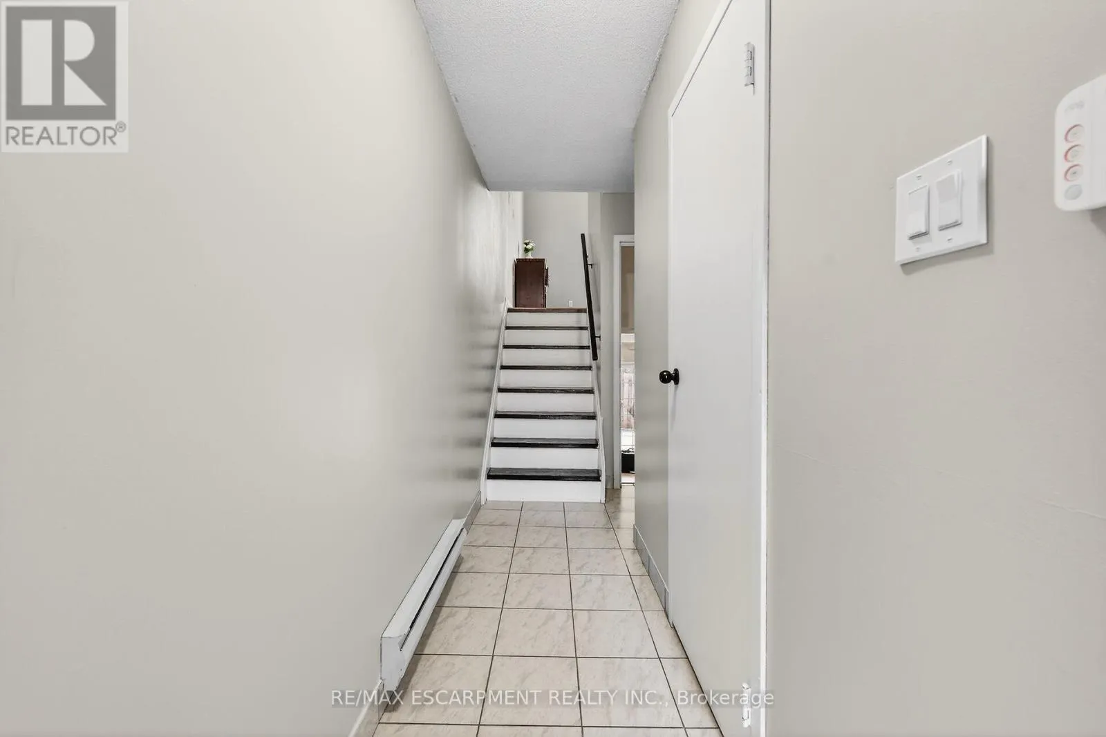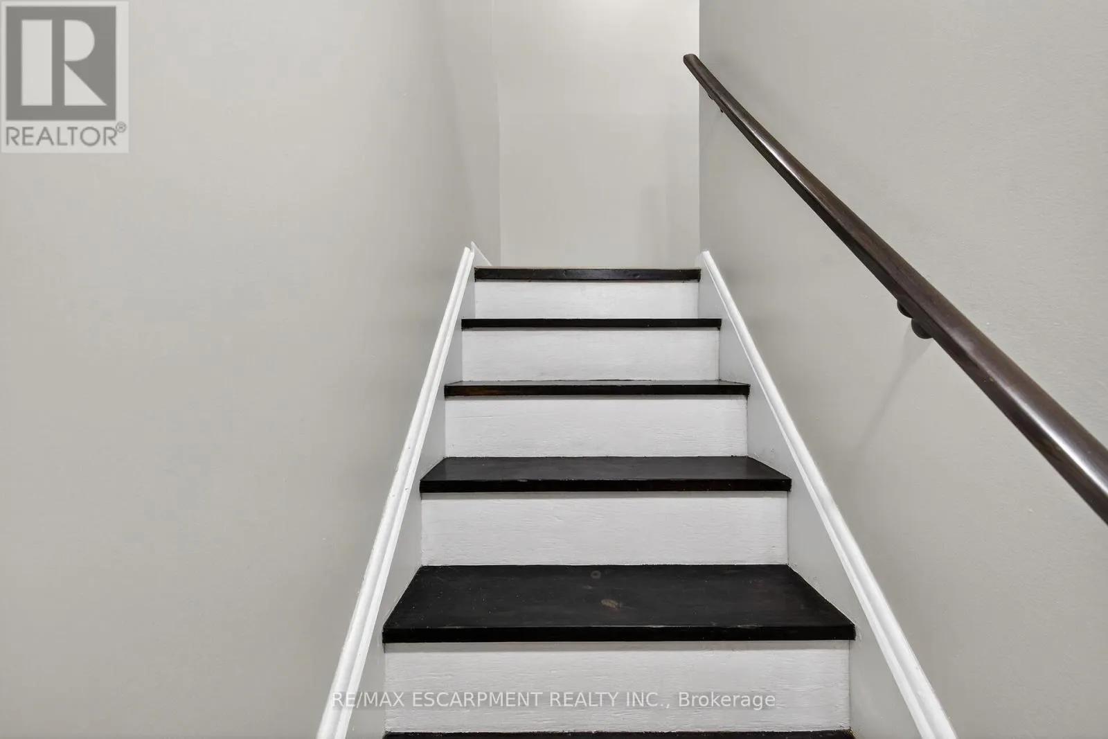 Cross Streets: King St East and New Mountain Road. ** Directions: -. Rarely offered multi level townhouse at the base of the Escarpment in downtown Stoney Creek. Impressive and bright main floor space with a high vaulted ceiling and gas fireplace. Updated kitchen and appliances with extended eat-in area. Upper level with large primary bedroom and updated bathroom. Lower level walk-out to private backyard area. Well managed and maintained complex. Located in a quiet and low traffic cul-de-sac within a short walk or drive to Stoney Creek amenities and instant access to the Escarpment via Mountain Road. A great start for first time buyers entering the market! (id:27476)