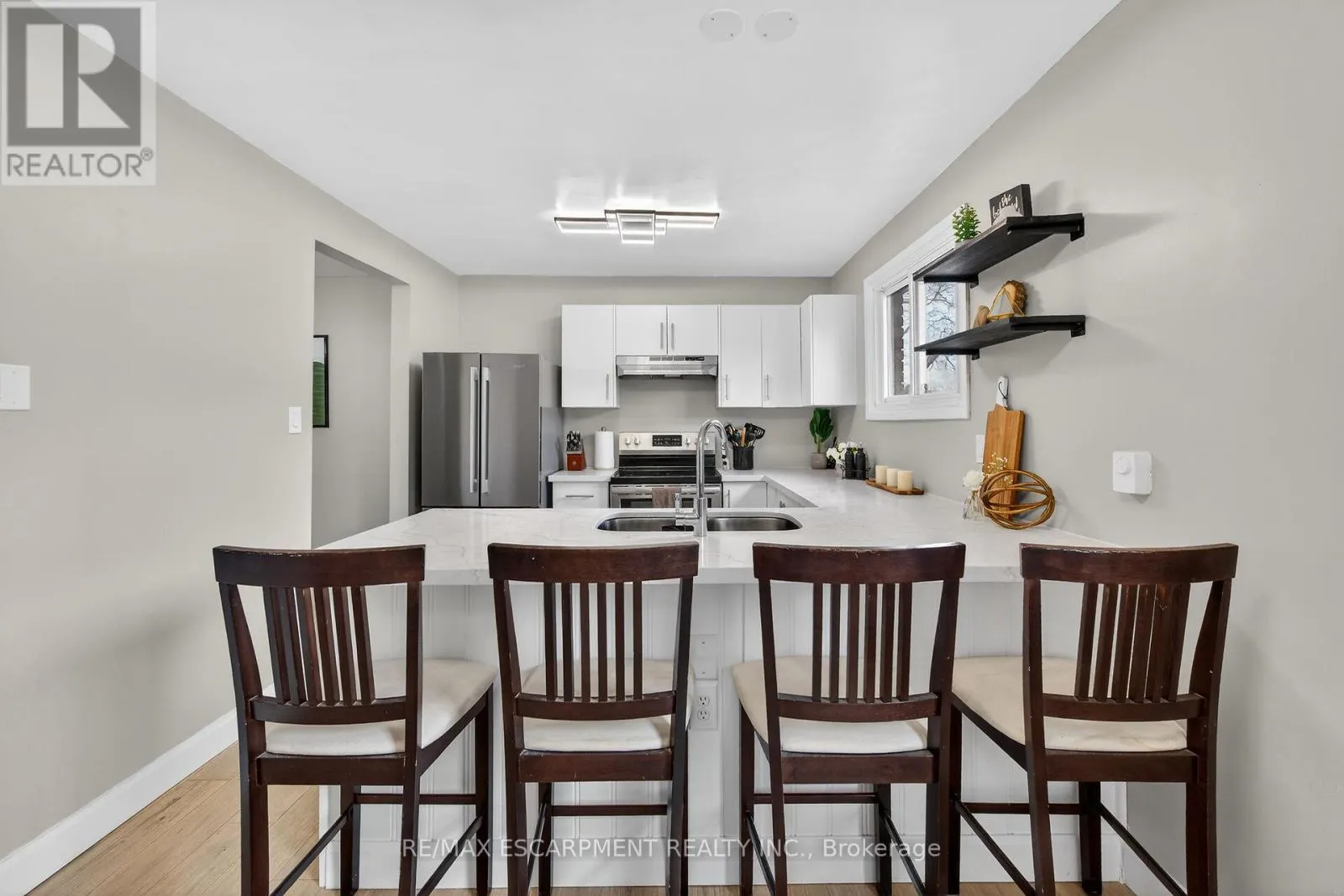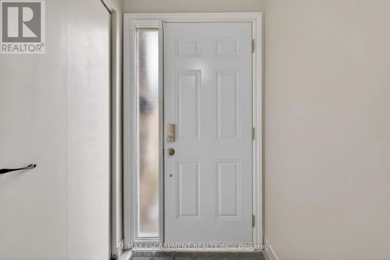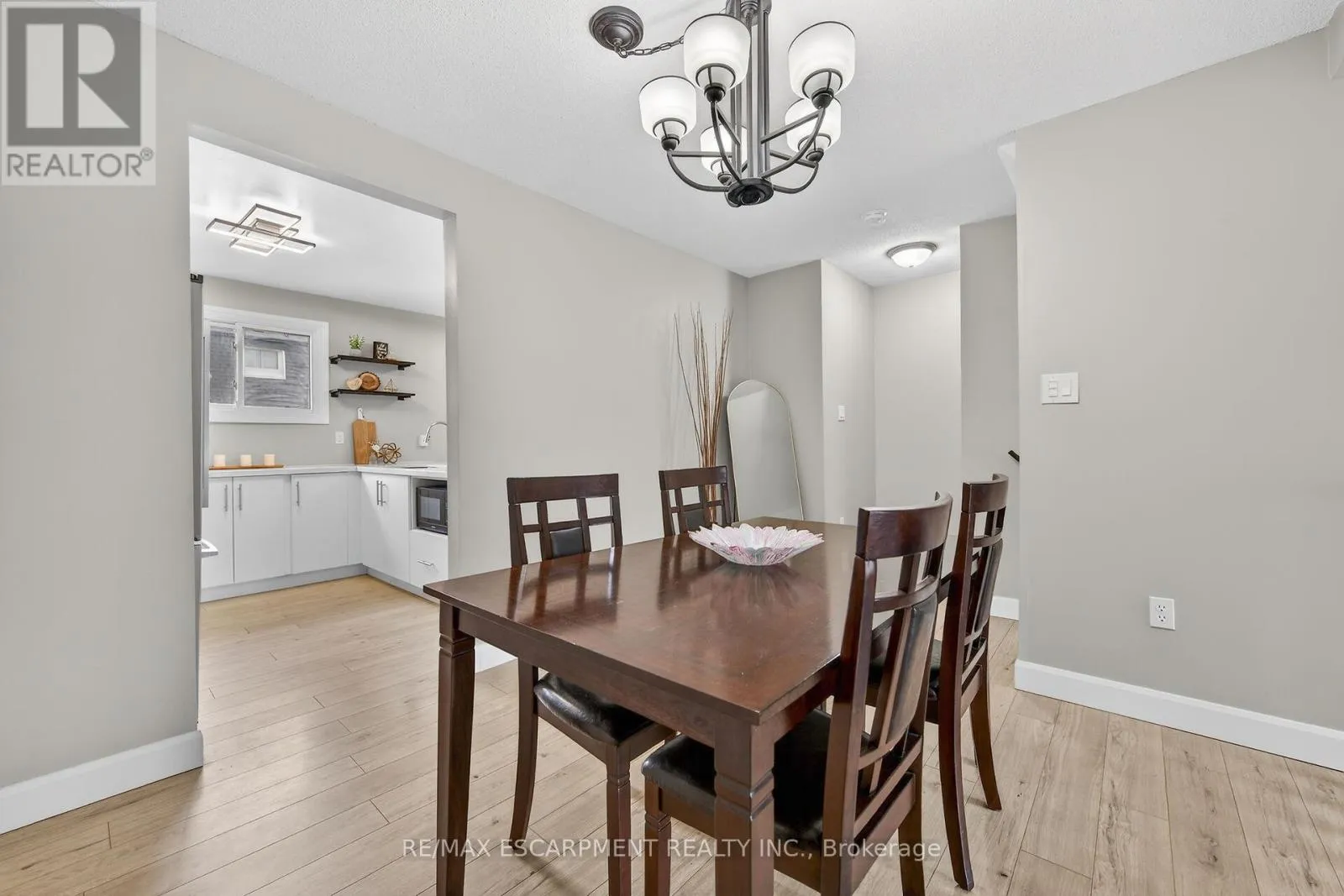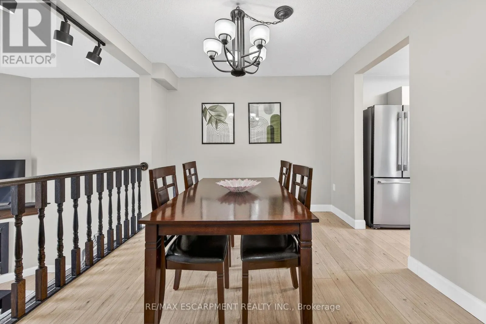 Cross Streets: King St East and New Mountain Road. ** Directions: -. Rarely offered multi level townhouse at the base of the Escarpment in downtown Stoney Creek. Impressive and bright main floor space with a high vaulted ceiling and gas fireplace. Updated kitchen and appliances with extended eat-in area. Upper level with large primary bedroom and updated bathroom. Lower level walk-out to private backyard area. Well managed and maintained complex. Located in a quiet and low traffic cul-de-sac within a short walk or drive to Stoney Creek amenities and instant access to the Escarpment via Mountain Road. A great start for first time buyers entering the market! (id:27476)