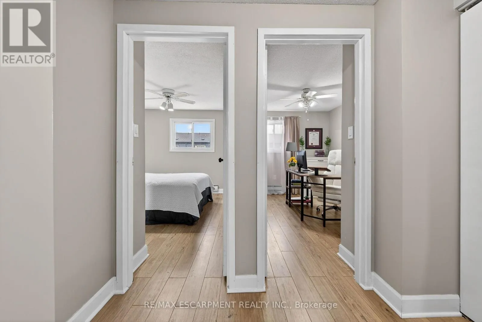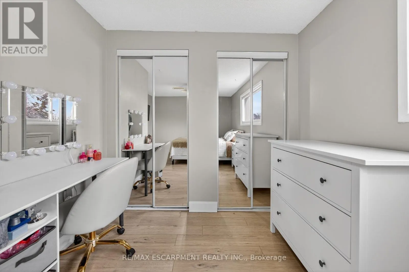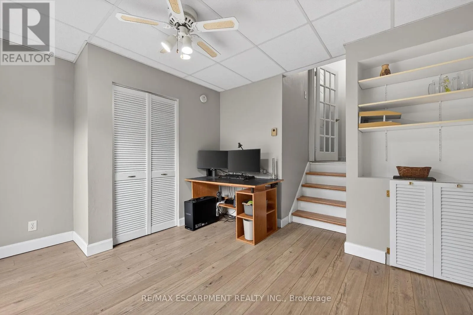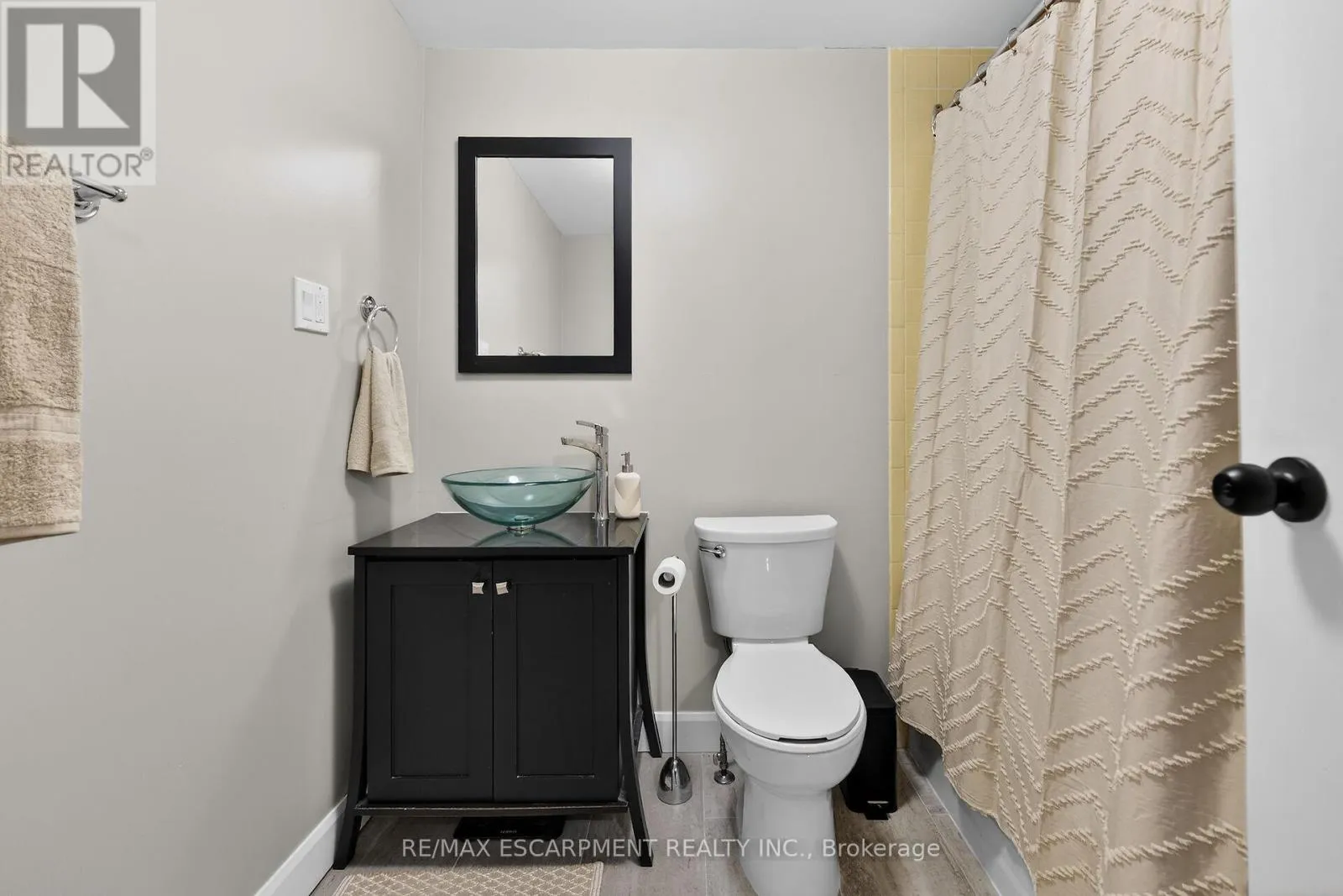 Cross Streets: King St East and New Mountain Road. ** Directions: -. Rarely offered multi level townhouse at the base of the Escarpment in downtown Stoney Creek. Impressive and bright main floor space with a high vaulted ceiling and gas fireplace. Updated kitchen and appliances with extended eat-in area. Upper level with large primary bedroom and updated bathroom. Lower level walk-out to private backyard area. Well managed and maintained complex. Located in a quiet and low traffic cul-de-sac within a short walk or drive to Stoney Creek amenities and instant access to the Escarpment via Mountain Road. A great start for first time buyers entering the market! (id:27476)