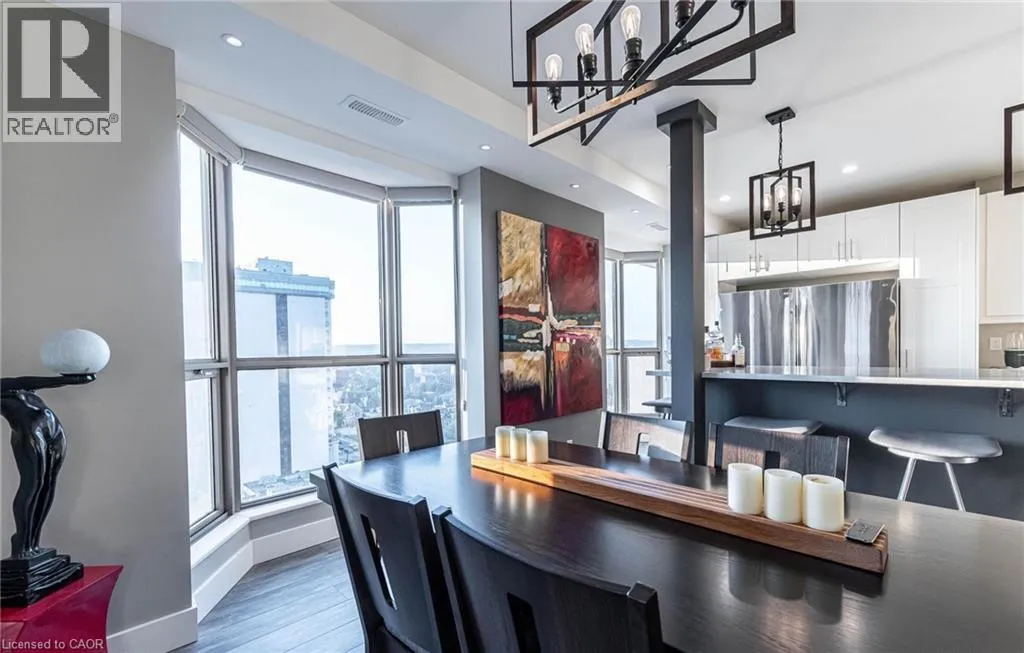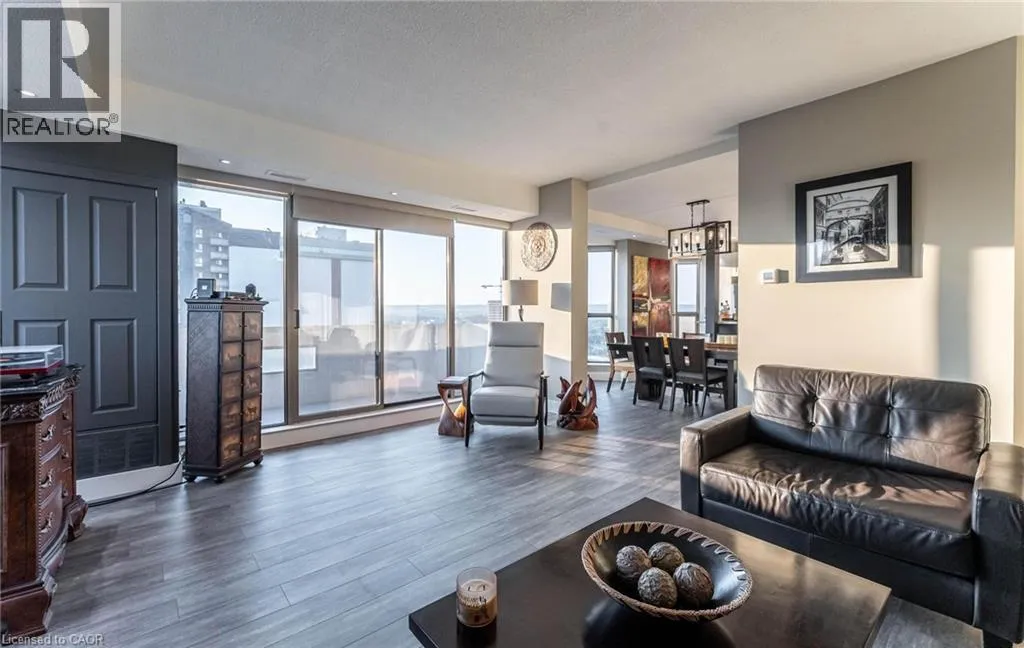 Bay St to Jackson St W to Caroline St S Fantastic Bentley Place!! Once you come in you wont want to leave. Great west Hamilton location. Panoramic views of city escarpment and lake Ontario. Beautiful open living, dining and kitchen area with 9' foot ceilings. Kitchen , baths and most flooring renos done since 2020. Kitch Island 3'.5 x 8' Accent LED lighting throughout. Wrap around balcony off living room. 2nd Balcony from primary bedroom with ensuite bath. Furnace and central air replaced in 2020.Windows and sliding doors replaced March,2025. One excusive underground parking spot. A must to view. (id:27476)