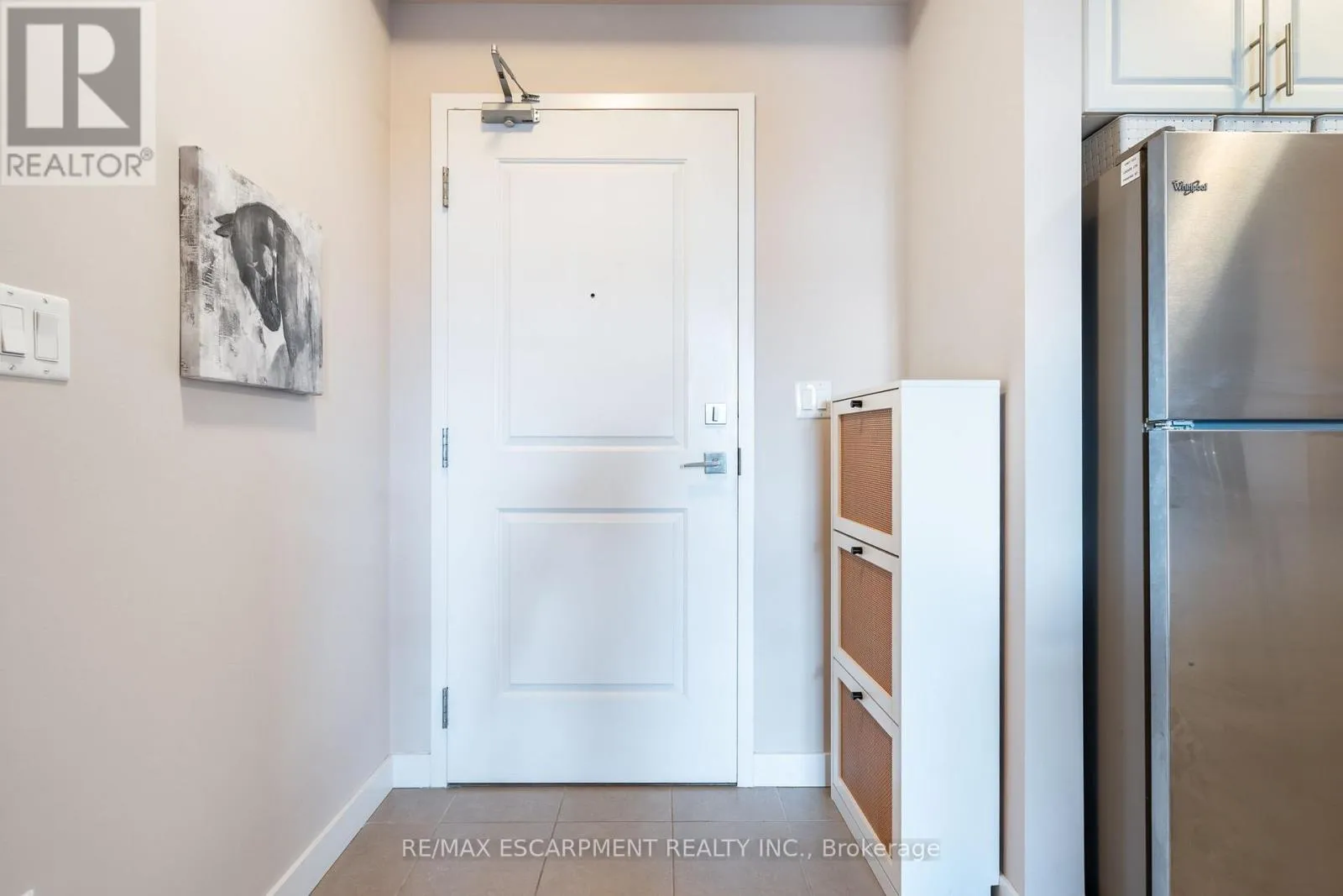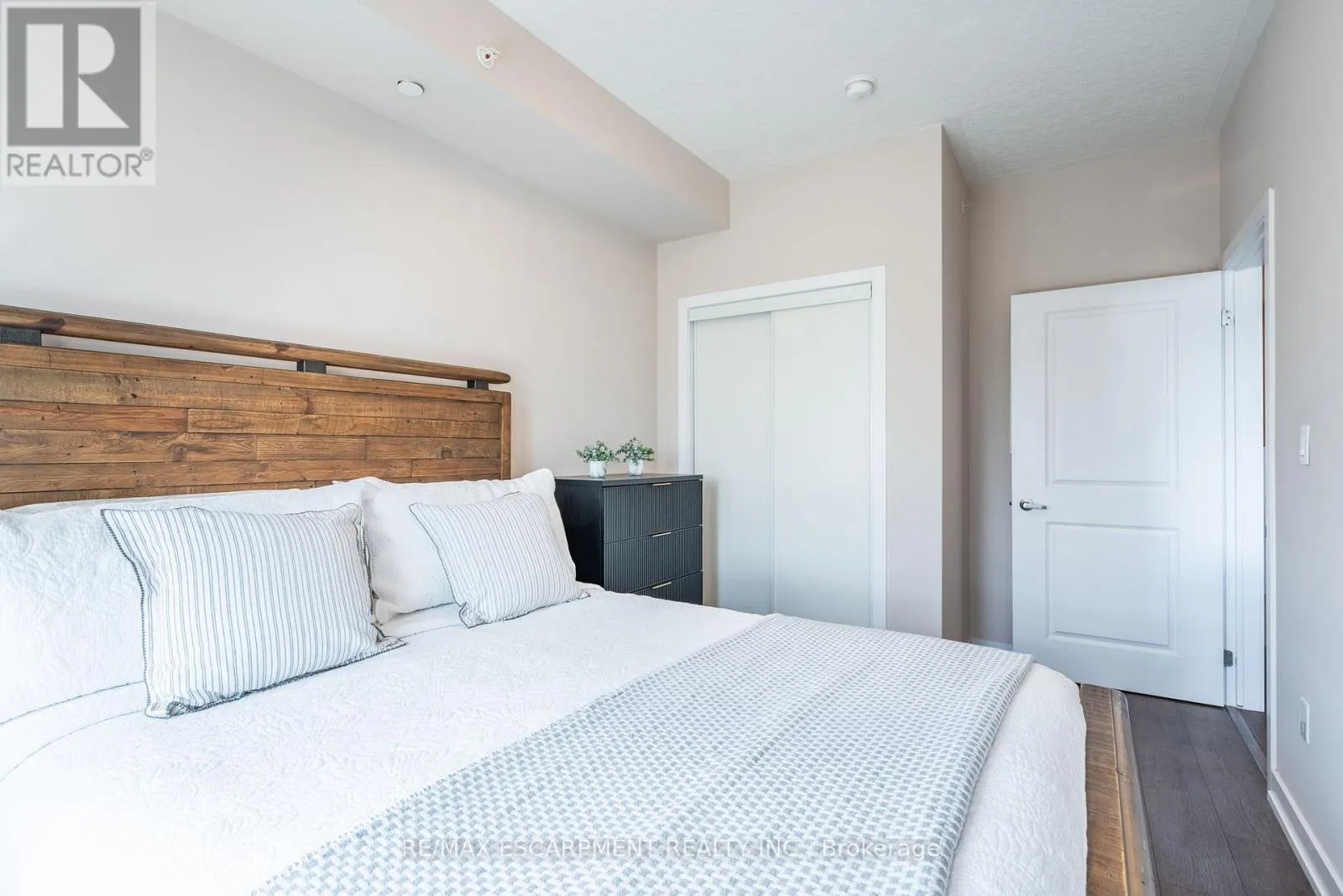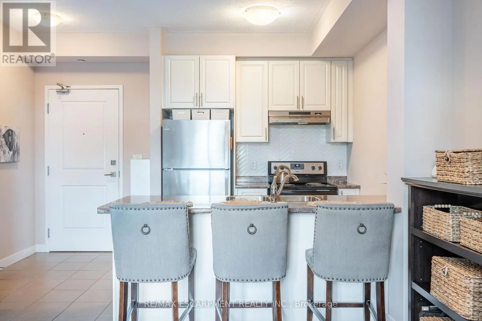 Cross Streets: Frances Ave. ** Directions: N Service Rd to Green Rd to Frances Ave to Southshore Cres. Discover boutique lakeside living in this stylish one-bedroom condo at the Waterfront Trails in Stoney Creek. Located in a charming four-storey building right on the lake, this freshly painted unit features newer wide plank flooring, a modern kitchen with stainless steel appliances and a breakfast bar. This unit features in-suite laundry and sliding doors that open to a private balcony. Enjoy the convenience of one owned underground parking space and one owned locker along with building amenities including a rooftop terrace with stunning lake views, an exercise room, bicycle storage and ample visitor parking! With a walking trail at your doorstep, easy beach access, quick access to the QEW and local amenities, this condo is a perfect opportunity for first-time buyers or investors seeking a turn-key property in a prime waterfront location. ADDED BONUS: The Seller will pay the first 2 months of condo fees upon completion. RSA. (id:27476)
