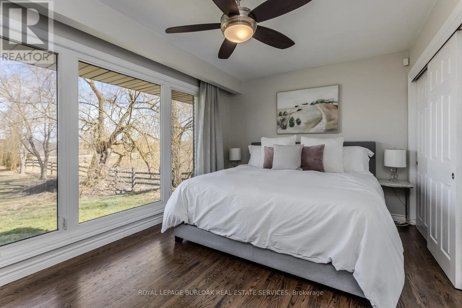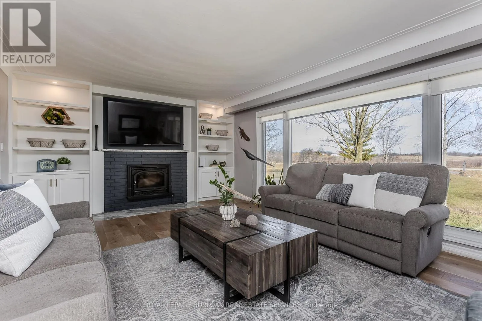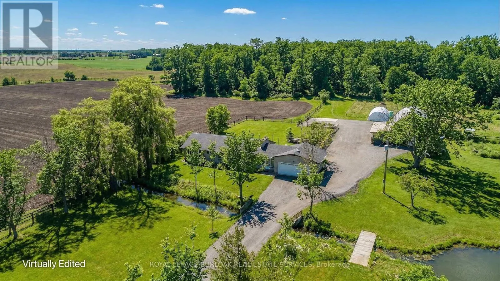 Cross Streets: Harrison Road. ** Directions: Hall Rd to Harrison Rd. Experience peak rural hobby farm living on this breathtaking property designed for those who value space, nature, and lifestyle. Set on a picturesque lot just under 12 acres with access to beautiful nature trails, this remodelled ranch-style bungalow offers the ideal balance of modern comfort and tranquility-ideal for horse or nature enthusiasts, all within a short drive to both downtown Binbrook and Hamilton. Arrive home to a newly expanded double-lane driveway with parking for 20 cars, framed by 8 blazing autumn maple trees. A creek flows through the front yard and connects to a peaceful pond, complete with upgraded LED lighting for magical winter evenings skating. Inside, the home has been thoughtfully updated with new engineered hardwood throughout the main level. The inviting living room features an oversized window with motorized blinds, fireplace, and custom built-in media wall. The luxurious kitchen showcases Cambria countertops, tile backsplash, custom cabinetry, new SS appliances, and a dining area accented by elegant wall paneling and walkout access to the backyard. The serene primary bedroom features wall-to-wall windows with stunning views, while 2 additional bedrooms and a 4pc bathroom with dual sink vanity complete the main floor. The finished lower level adds even more living space with new vinyl flooring, spacious rec room, and a family room featuring wood beams, stone feature wall, and fireplace. An additional bedroom and 3pc bathroom with oversized glass shower offer flexibility for guests or family. Outdoors, the property truly shines. Enjoy a 600sf Permacon paver patio, Douglas fir shade structures w/ UV sails, putting green, landscape lighting, perennial gardens, and expansive green space. Trails lead through a 2-acre forest, while the horse barn offers 6 stalls, hay mow, a 50-amp RV plug, and fenced paddocks & pastures ready for your horses. Don't miss this true rural gem. (id:27476)