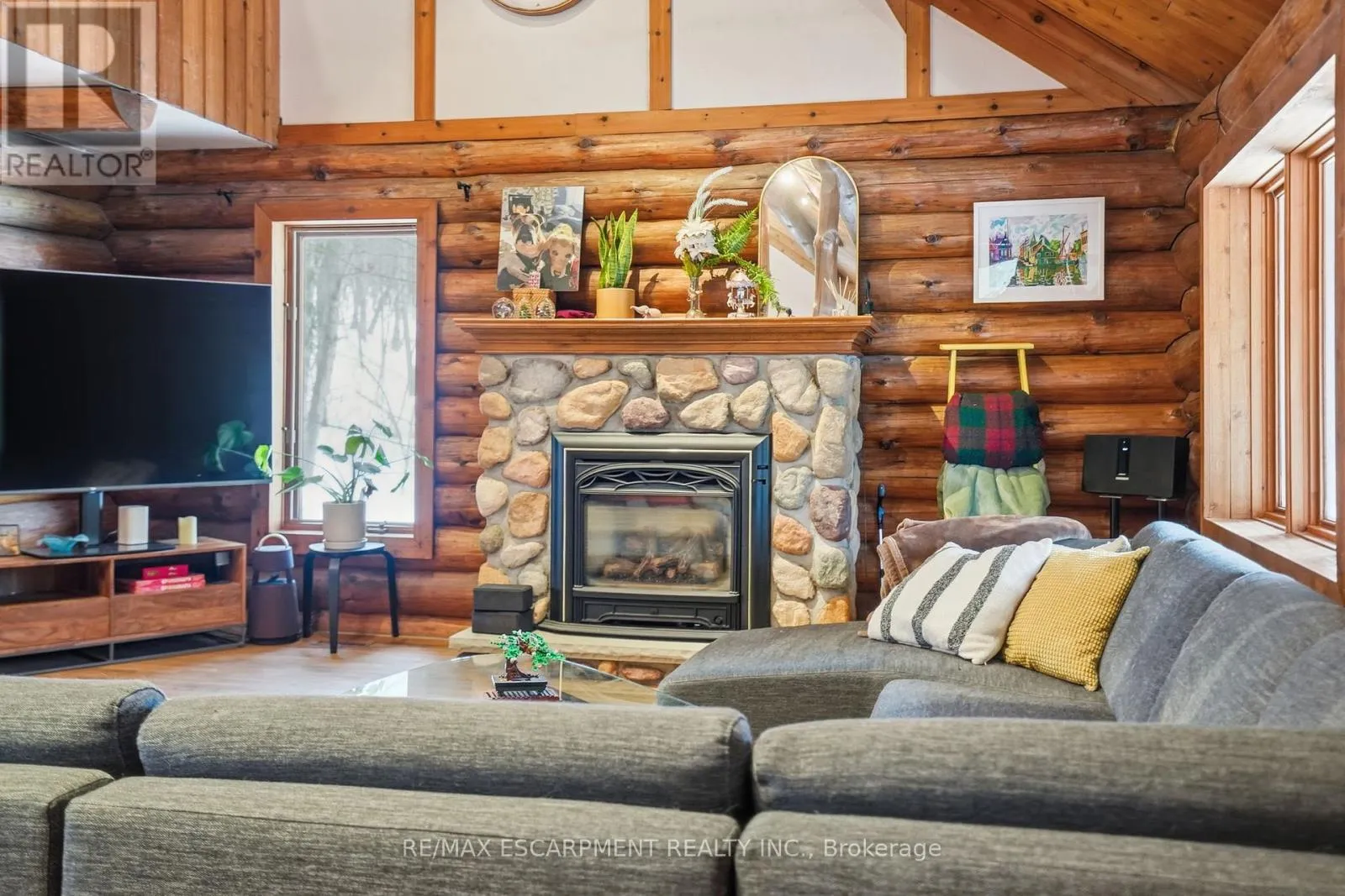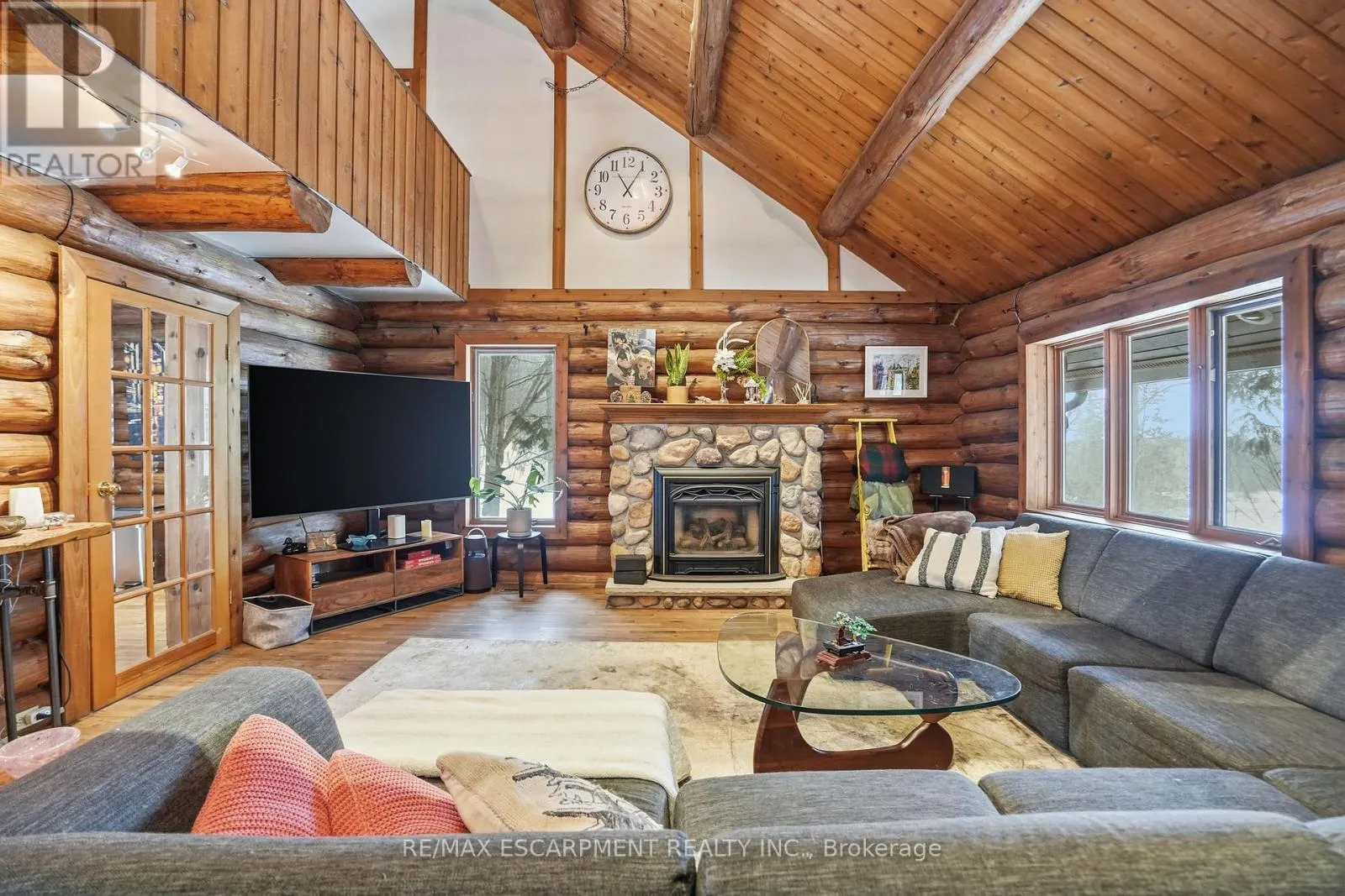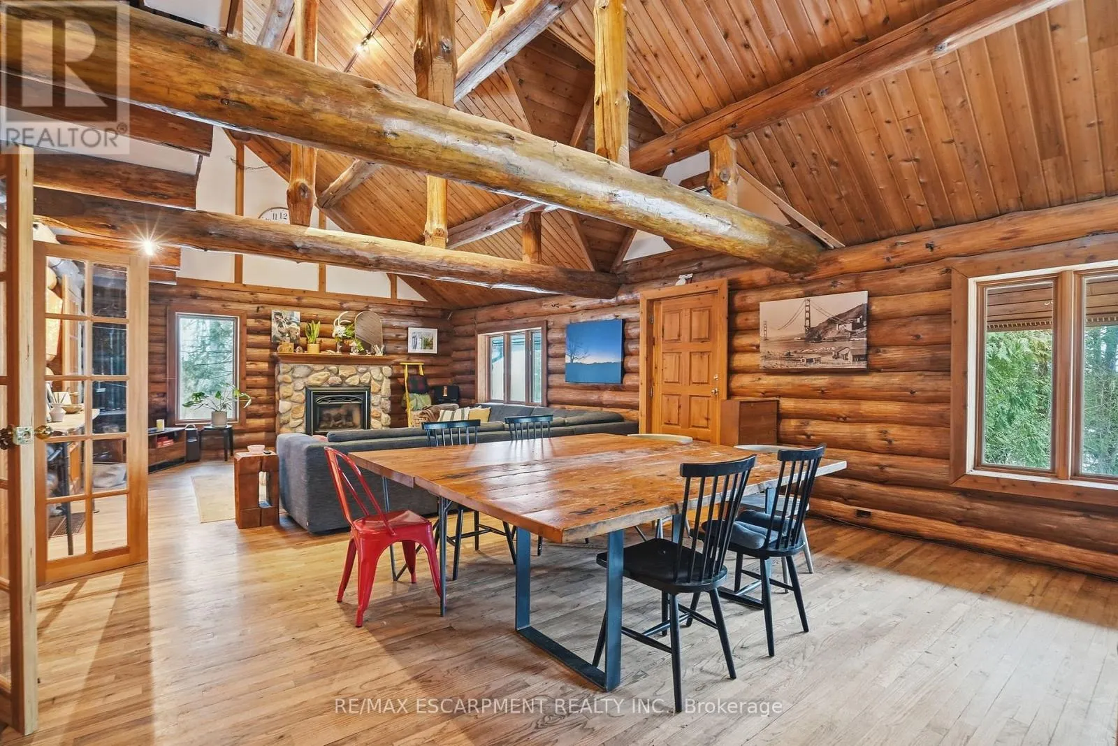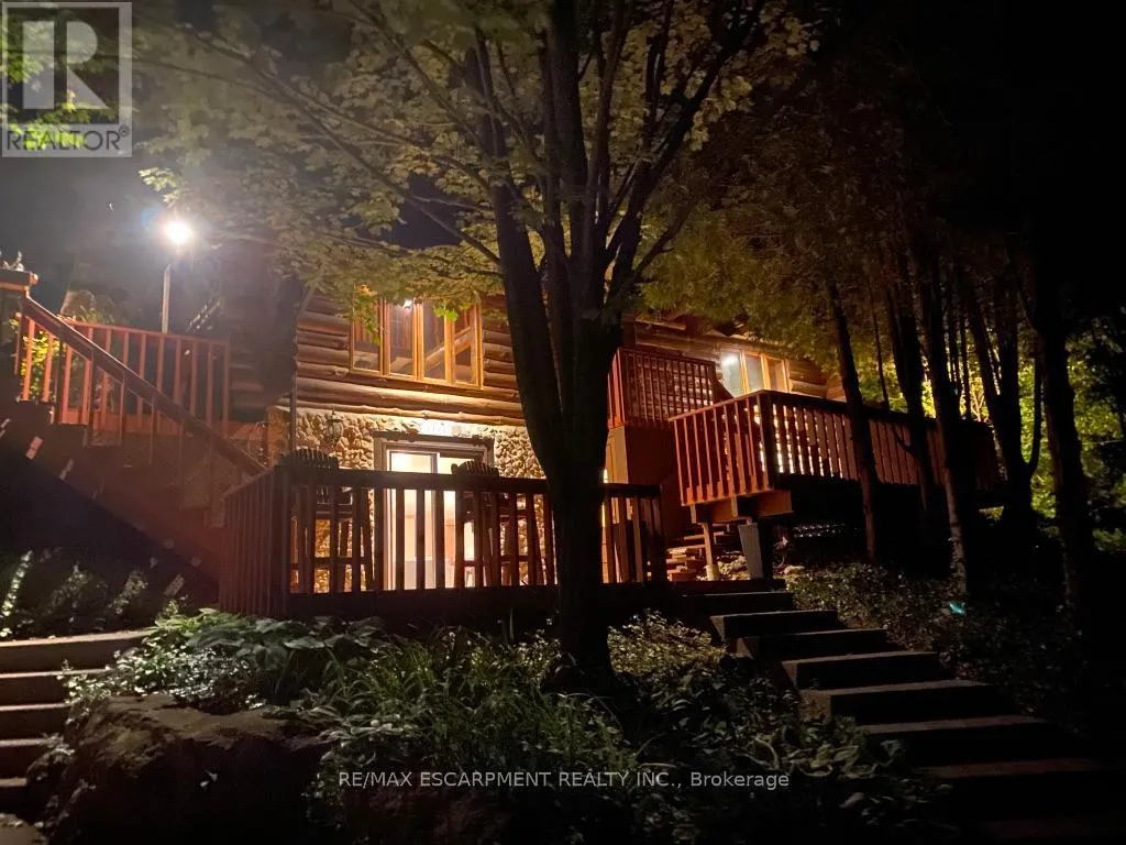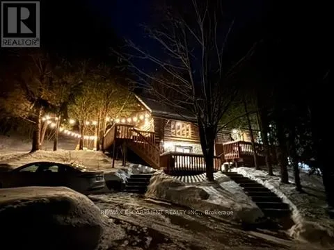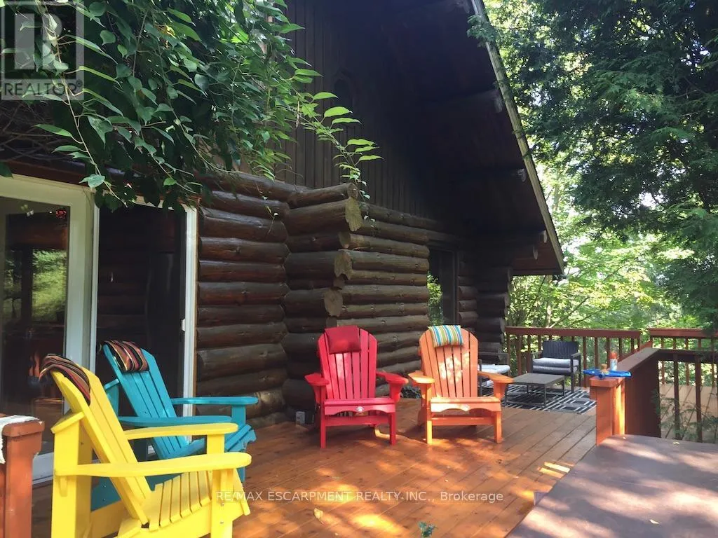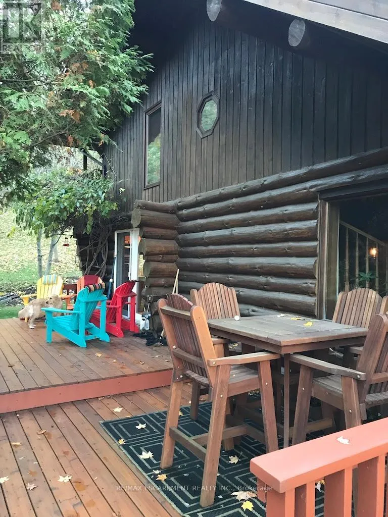 Brock Road & Safari Road Introducing this beautifully crafted 1,771 square foot log bungaloft offering the perfect blend of rustic charm and modern comfort in a peaceful country setting. Soaring vaulted ceilings with exposed log beams create a warm and inviting first impression in the massive living and dining area, complete with a cozy gas fireplace. The spacious kitchen features abundant counter space and overlooks the welcoming family room warmed by an Elmira wood stove, ideal for gatherings year-round. Step outside to enjoy two separate decks, one off the family room and another off the kitchen, perfect for entertaining or relaxing in nature. The upper-level primary retreat offers a generous walk-in closet; large enough to double as a nursery or home office and a beautifully renovated ensuite with dual vanities and a glass-enclosed shower. The finished walk-out lower level adds exceptional living space with two well-sized bedrooms, an updated 3-piece bath and a comfortable rec room with its own gas fireplace. Outdoors, you'll find a detached single-car garage, a charming chicken coop and a powered shed with 100-amp service-originally planned as a home office. A concrete pad is ready for your future hot tub, while walking trails right at your doorstep complete this serene and private country lifestyle. This is more than a home-it's a retreat. RSA. (id:27476)