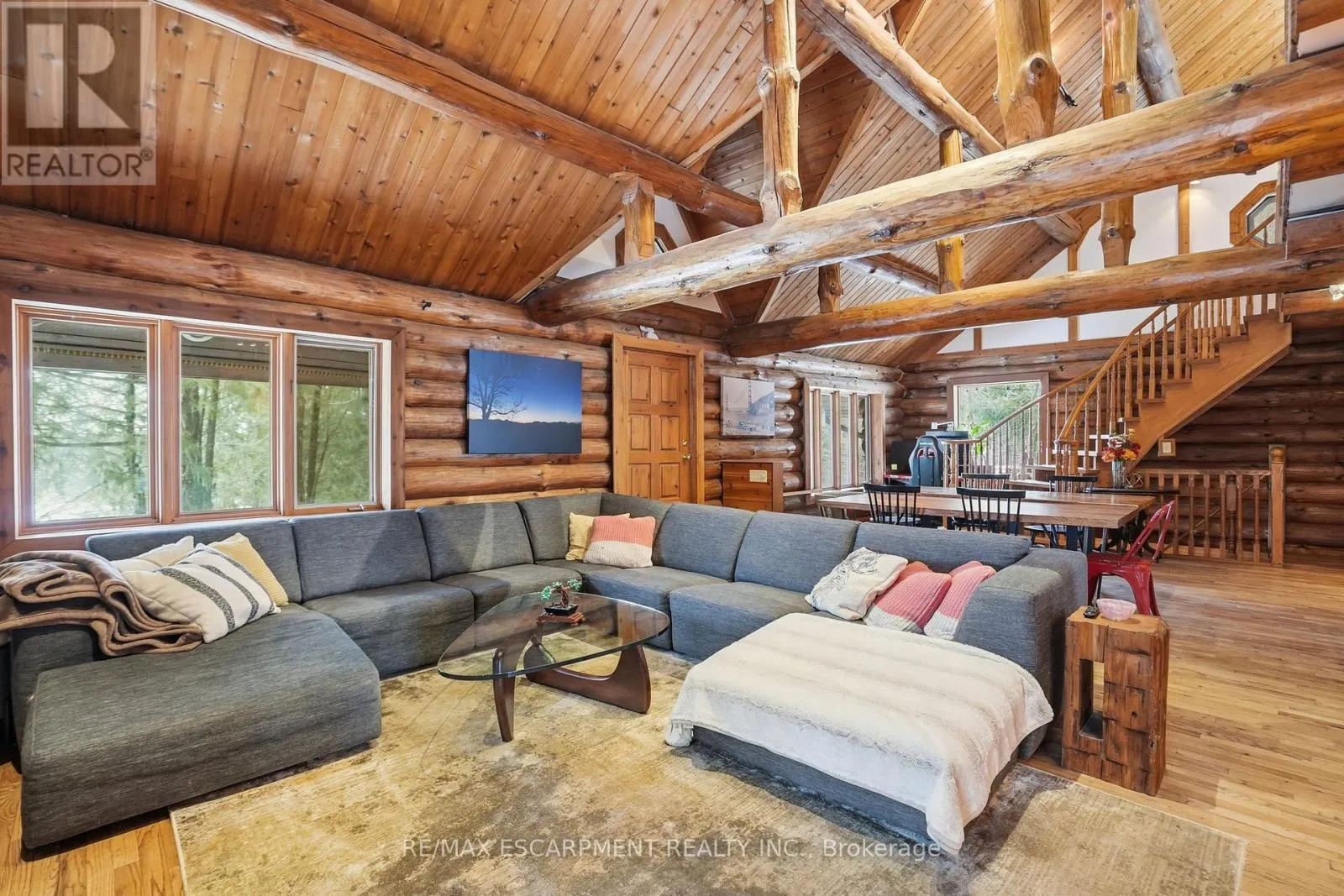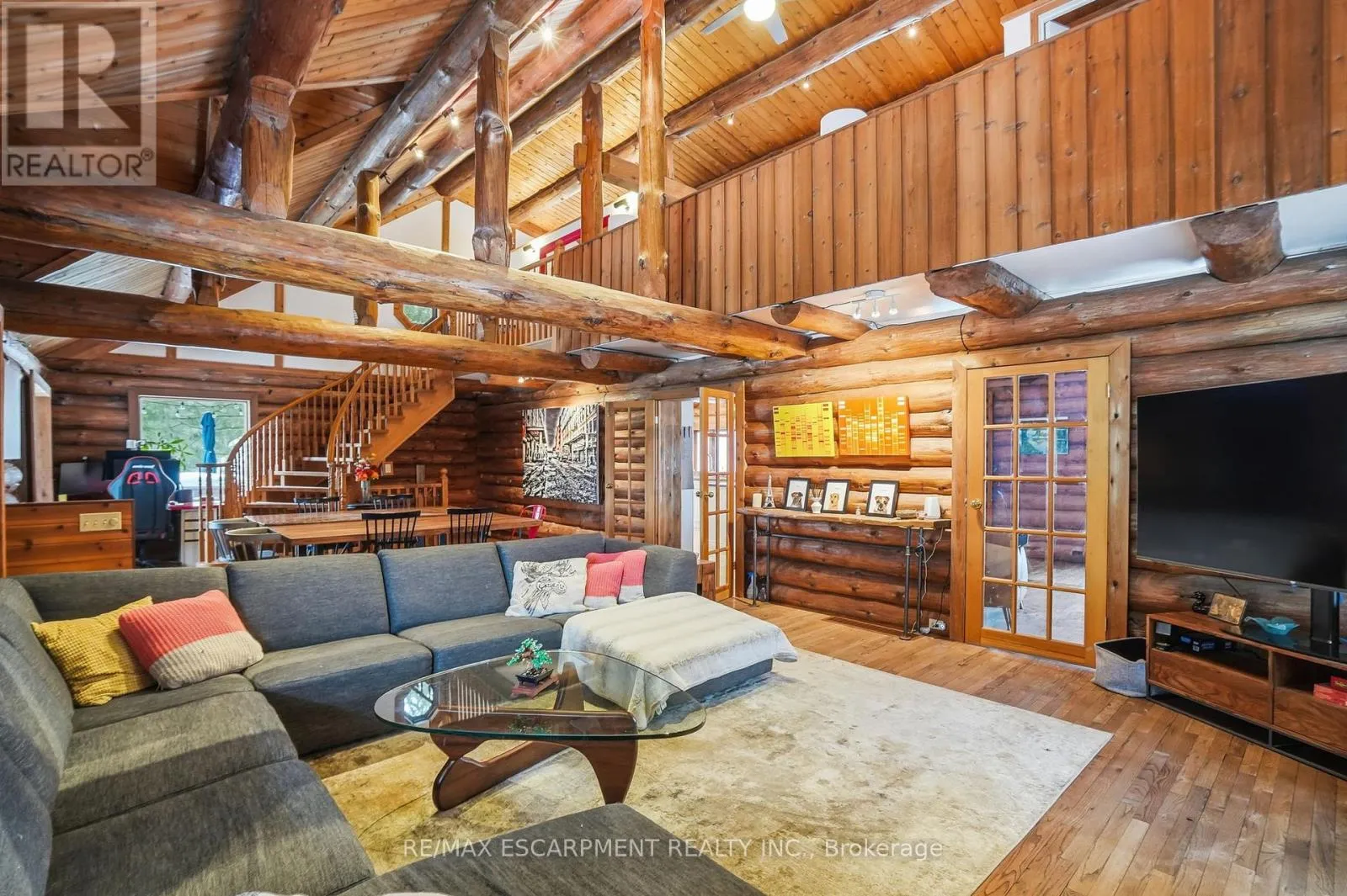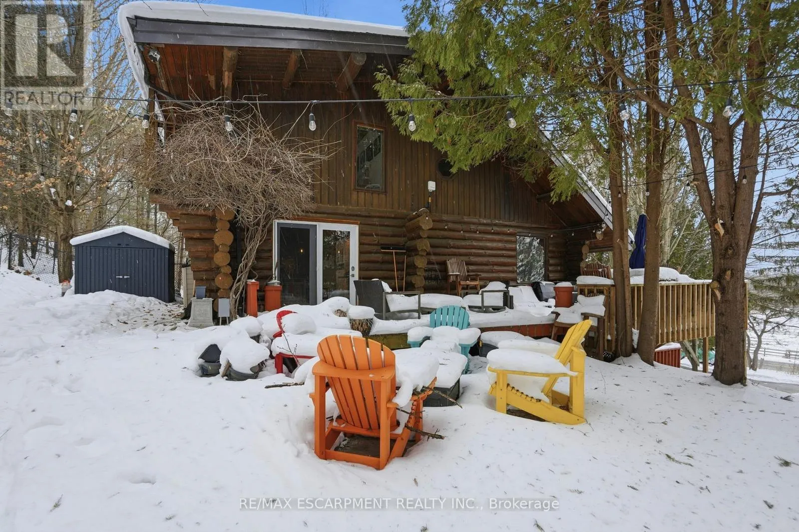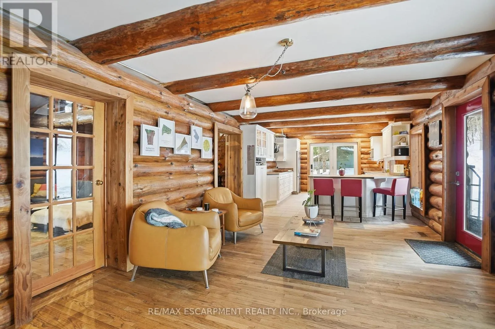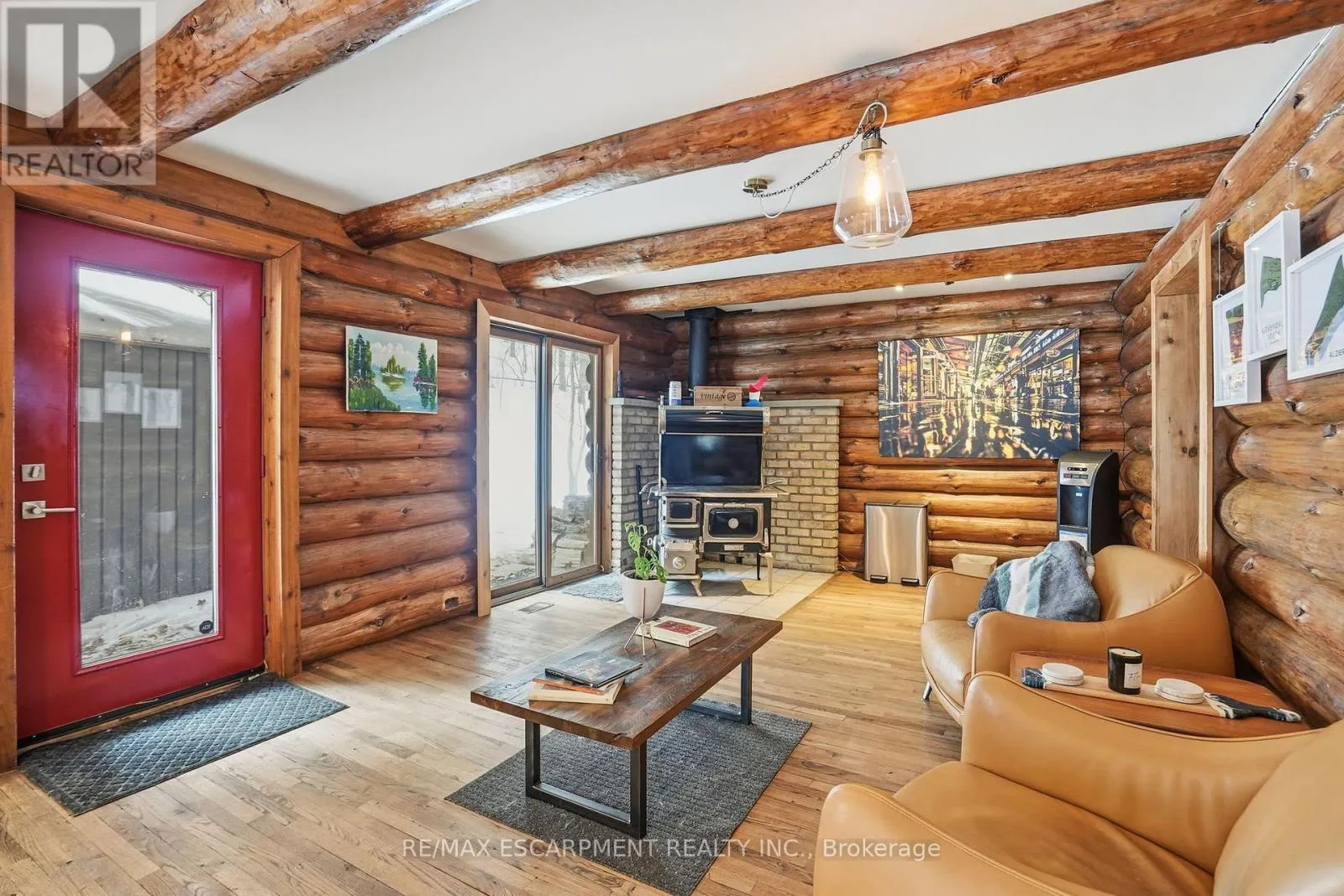 Brock Road & Safari Road Introducing this beautifully crafted 1,771 square foot log bungaloft offering the perfect blend of rustic charm and modern comfort in a peaceful country setting. Soaring vaulted ceilings with exposed log beams create a warm and inviting first impression in the massive living and dining area, complete with a cozy gas fireplace. The spacious kitchen features abundant counter space and overlooks the welcoming family room warmed by an Elmira wood stove, ideal for gatherings year-round. Step outside to enjoy two separate decks, one off the family room and another off the kitchen, perfect for entertaining or relaxing in nature. The upper-level primary retreat offers a generous walk-in closet; large enough to double as a nursery or home office and a beautifully renovated ensuite with dual vanities and a glass-enclosed shower. The finished walk-out lower level adds exceptional living space with two well-sized bedrooms, an updated 3-piece bath and a comfortable rec room with its own gas fireplace. Outdoors, you'll find a detached single-car garage, a charming chicken coop and a powered shed with 100-amp service-originally planned as a home office. A concrete pad is ready for your future hot tub, while walking trails right at your doorstep complete this serene and private country lifestyle. This is more than a home-it's a retreat. RSA. (id:27476)