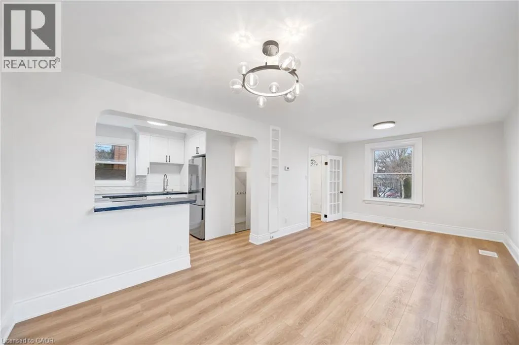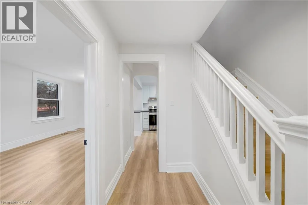 From York Blvd head south on Ray St N turn onto Peter St. Orfrom Queen St N, turn onto Peter St. Welcome to this standout 2-storey solid brick gem. A beautifully updated century home that offers stylish curb appeal and a modern layout in a much sought-after West Hamilton neighbourhood. Step inside to a bright, refreshing space that is completely move in ready. New luxury vinyl flooring has been laid throughout the main level, while the brand new kitchen showcases clean contemporary finishes, stainless steel appliances and a breakfast bar open to the living and dining area. This layout is ideal for everyday living and entertaining. Upstairs features hardwood floors, 3 good-sized bedrooms and a 4PC bathroom. Downstairs, the unfinished basement offers good ceiling height and is well lit, providing excellent storage or the opportunity to finish for additional living space. Off of the side entrance, enjoy a low maintenance private courtyard and access to a paved parking space. Suited to many buyers including young families, first time buyers, downsizes and investors. Situated close to James St N arts district and Locke St S, where you can enjoy trendy restaurants, boutique shops, and a vibrant community life. Just minutes to the Hamilton GO Centre with easy access to Highways 8 and 403, making commuting a breeze. Parks, amenities, and excellent schools are all nearby. In addition to the with new flooring and kitchen, the home was also freshly painted from top to bottom in Dec 2025. There is nothing for you to do but move in and enjoy this beautiful home. Book your viewing today! RSA. (id:27476)