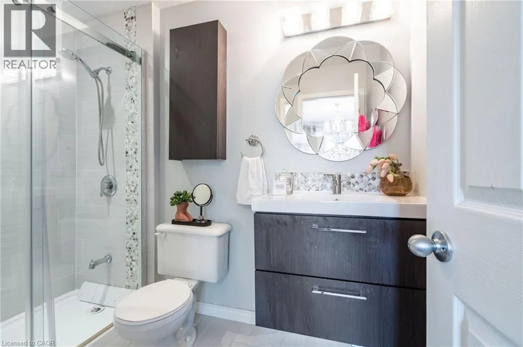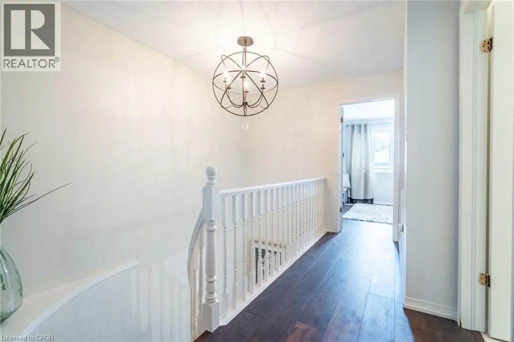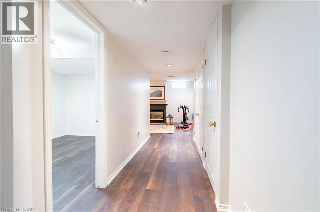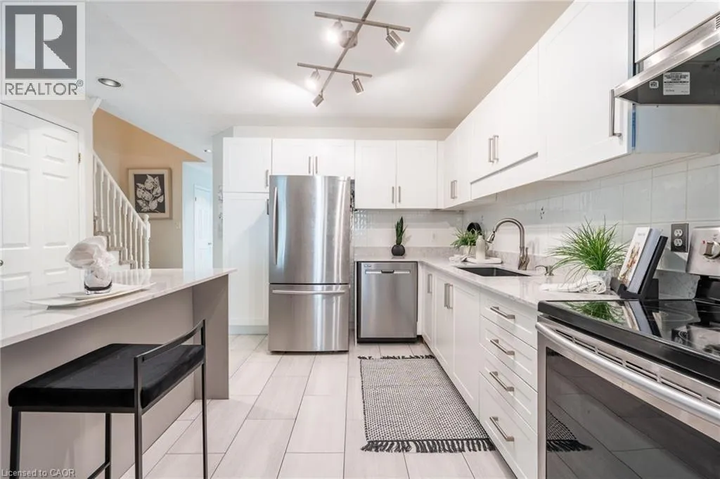 From Rymal Rd E turn South to Upper Wentworth St and left on Vineberg Dr Charming End Unit Townhouse with Stylish Updates! Welcome to this beautifully maintained end unit townhouse, condo fees include lots of maintenance items, as well as water, Cable TV and high speed internet! From the moment you drive up you can see how well cared for it is, the entrance steps recently done with aggregate concrete. Step inside and you will find new flooring leading up to the newer kitchen with modern cabinetry and new sleek stone countertops. Includes all stainless steel appliances, fridge, stove and b/i dishwasher. Open kitchen to the living room area that has gorgeous oak hardwood floors and features a sleek electric fireplace. Interior entrance from attached garage. As you go up the stairs you will find new carpet on the stairs, fresh paint throughout the home, and all new laminate flooring on the second level. Large master with walk-in closets and newly renovated master ensuite bath featuring oversized walk-in shower. All new light fixtures in the bedrooms. In the basement you will find a nice space for a rec room with a cozy gas fireplace and an additional room that can be used as office space, den or even 4th bedroom. With a fully fenced backyard you can enjoy privacy when you relax outside. Come check out this 3 bed, 3 bath decked out townhouse, all you have to do is move-in! Perfect location for young families or downsizers providing a quiet space and convenience with lots of amenities nearby. Limeridge mall and LINC highway are just a 5 minute drive. (id:27476)