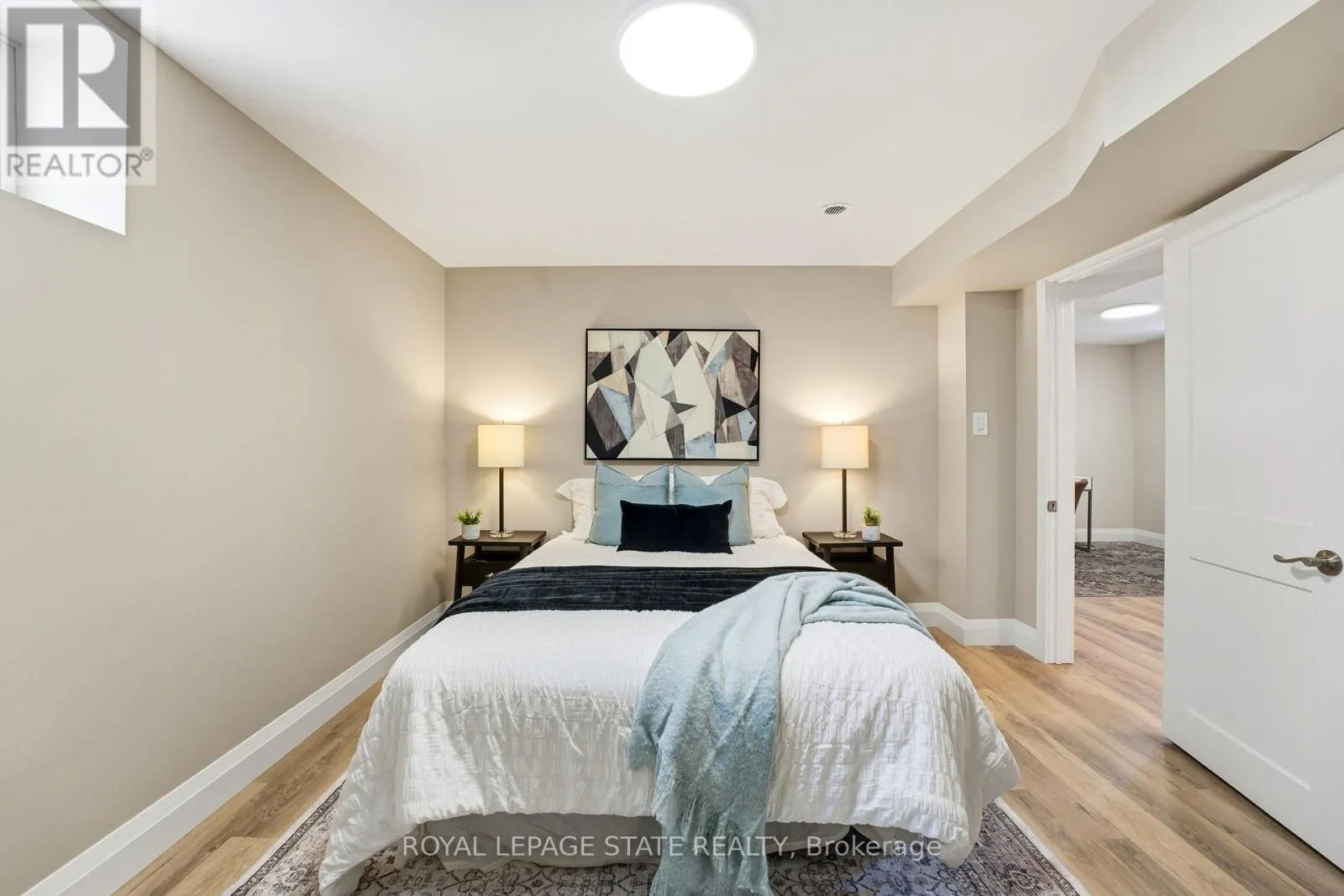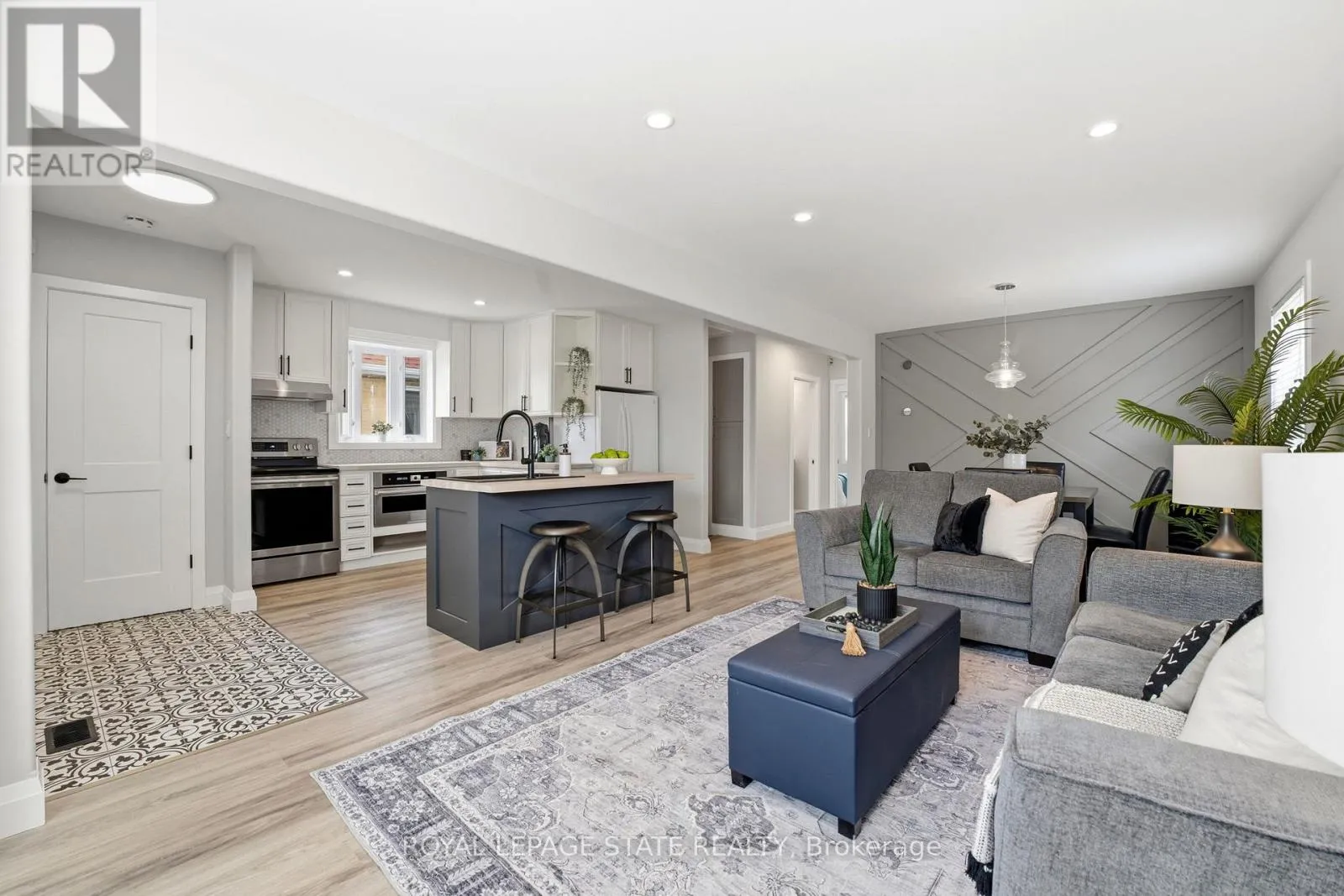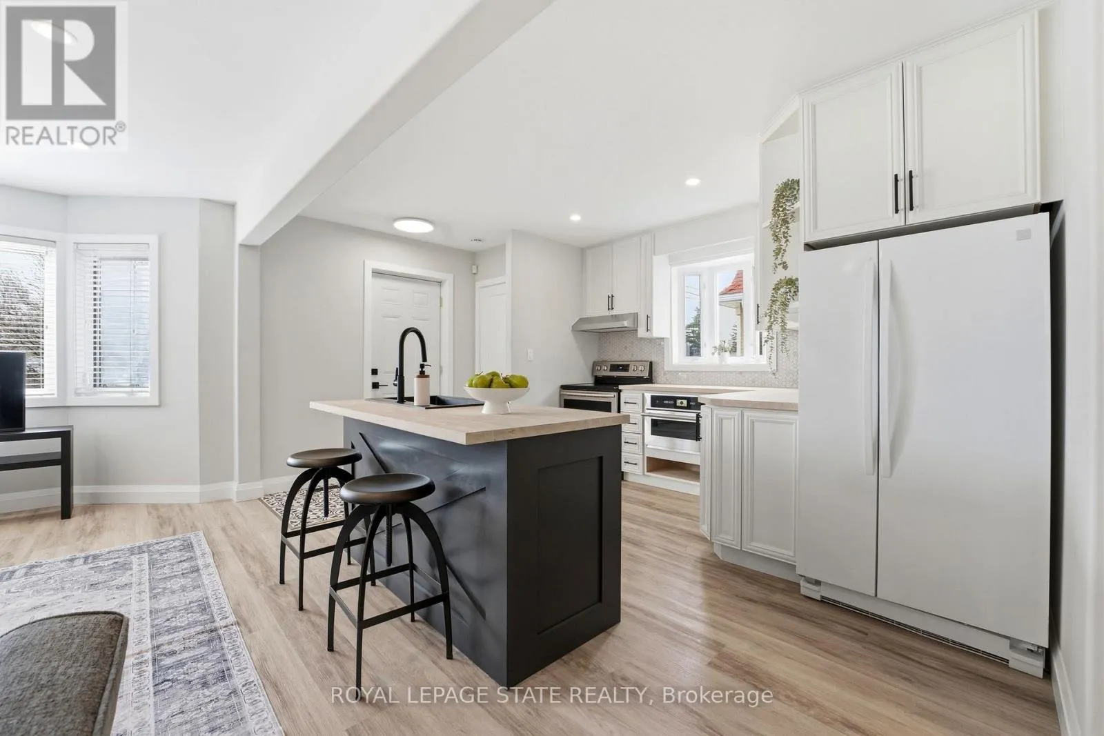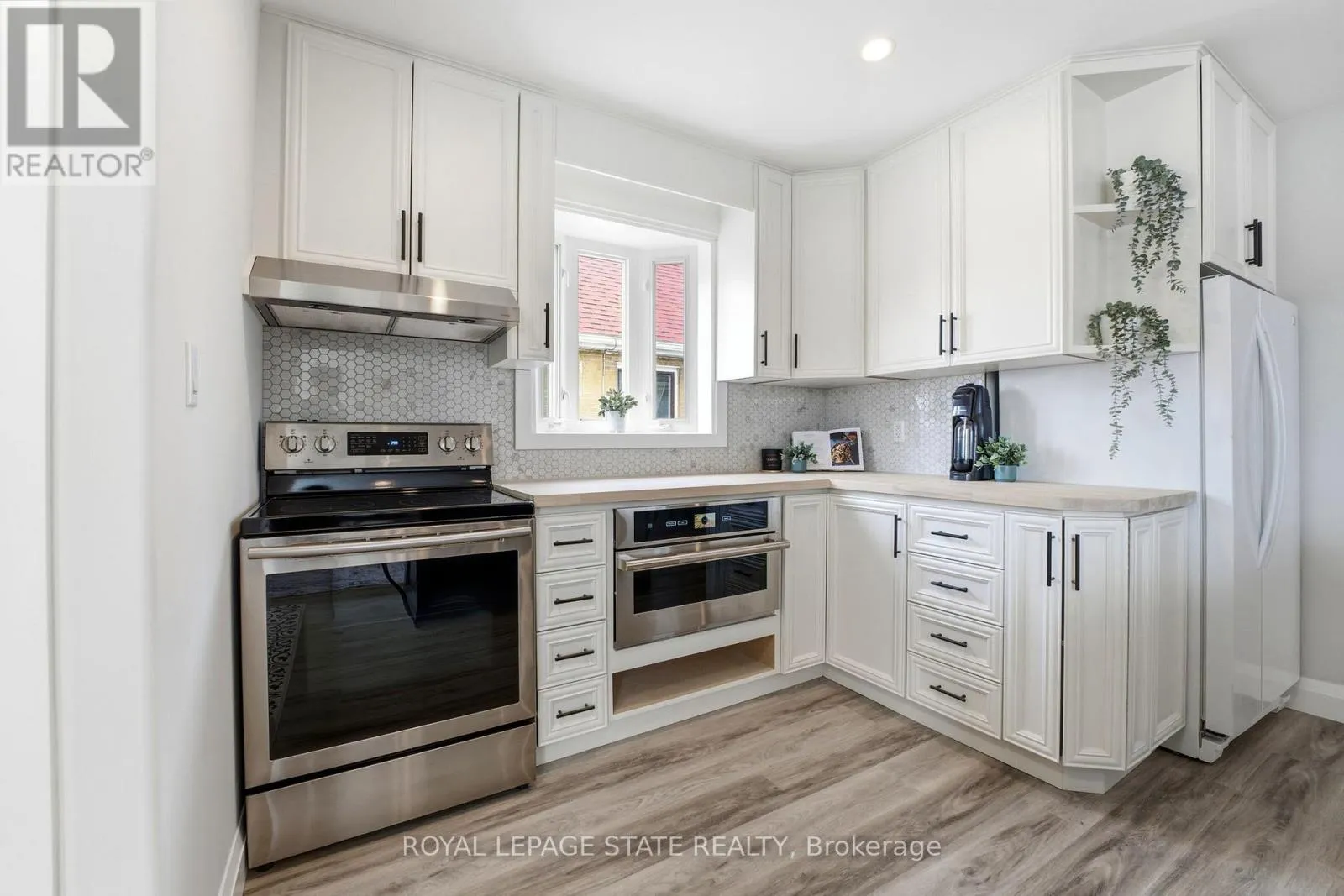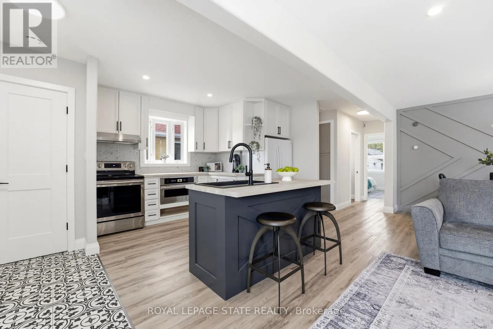 Cross Streets: Upper Gage and Queensdale. ** Directions: Upper Gage to Queensdale Avenue East. Nestled in the Sunninghill neighborhood, this charming brick bungalow offers a thoughtfully updated home perfect for young buyers and downsizers alike. The home welcomes you with an inviting, open concept living space designed to maximize natural light and functional flow. At its heart sits a modern kitchen featuring a central island, butcher block countertops, a stylish backsplash, and ample storage with a built-in microwave. The interior has been extensively transformed including new framing, drywall, and insulation bringing the home up to modern standards of energy efficiency. High quality updates include a new oak staircase with matching handrails, new flooring and trim, lighting and potlights throughout, freshly painted interior and exterior, every detail has been handled with care. The versatility of this property extends to the finished lower level, which is accessible via a separate side entrance. This additional living space includes a cozy family room, a third bedroom, a laundry room and one of the home's two newly renovated bathrooms. Outside, the private backyard and patio offer a quiet escape, complemented by the convenience of a detached garage and a long private driveway. Easy access to local schools, parks, shopping and major transit routes, making it an ideal blend of modern comfort and established charm. (id:27476)