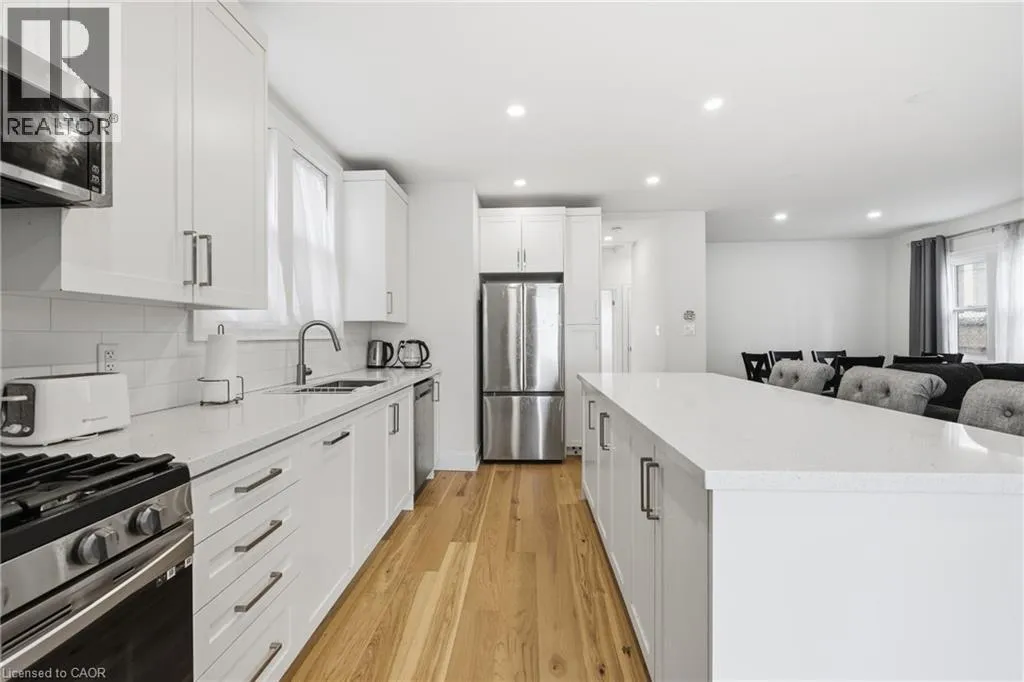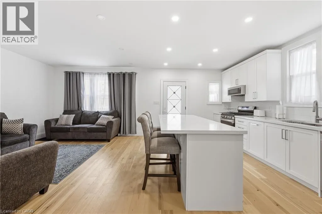Jackson St West between Bay St S and Caroline Street S Beautifully renovated open-concept bungalow in the heart of trendy Durand, offering over 1,500 sq ft of finished living space including a fully finished lower level. The home sits on the historic grounds of the former Wesanford Estate gardens and still showcases the charming original iron and stone wall, adding a unique touch of character. The custom kitchen is filled with natural light from updated windows and features stainless steel appliances, quartz countertops, and a classic subway tile backsplash, all modern and move-in ready. Major updates completed in 2022 include the roof, soffits, eavestroughs, furnace, HVAC vents, electrical wiring, hardwood flooring throughout both levels, solid wood interior doors, and 6-inch baseboards, all professionally installed. A private driveway and garage-a rare find in this sought-after neighbourhood-add to the home's appeal, along with solid double-brick construction. The spacious deck overlooks a low-maintenance backyard complete with a storage shed and rough-in for a future hot tub, perfect for relaxing or entertaining. Ideally located just minutes from Locke Street scenic trails, shops, restaurants, and convenient GO Train access, offering the perfect blend of lifestyle, charm, and convenience. (id:27476)