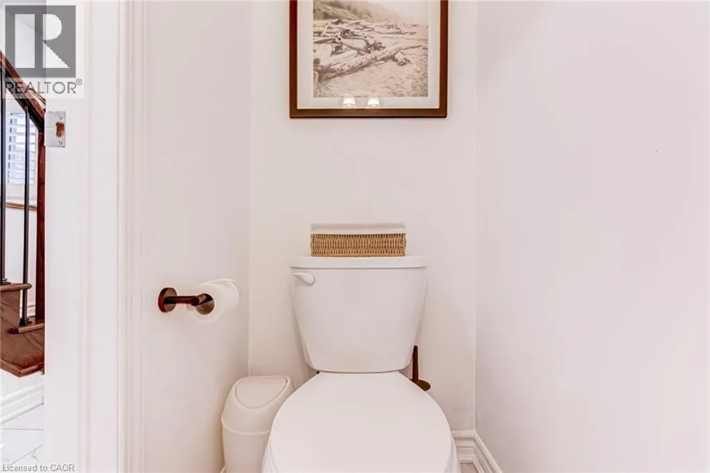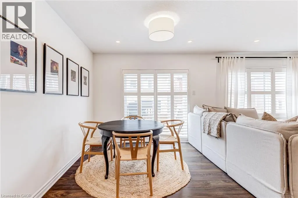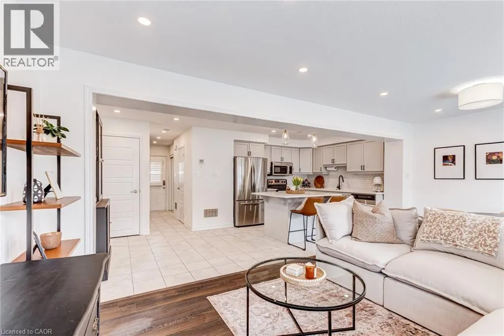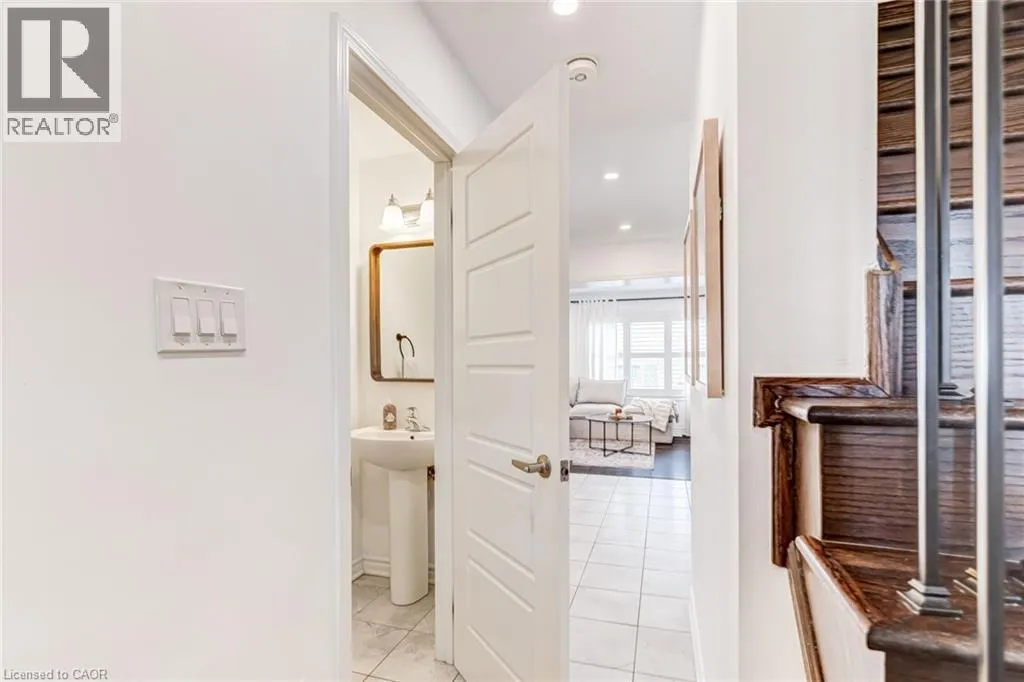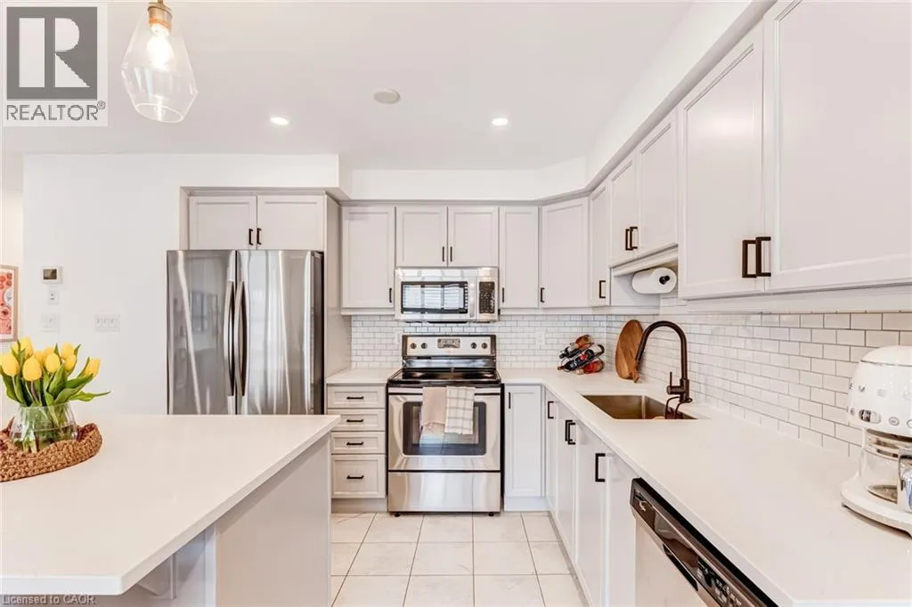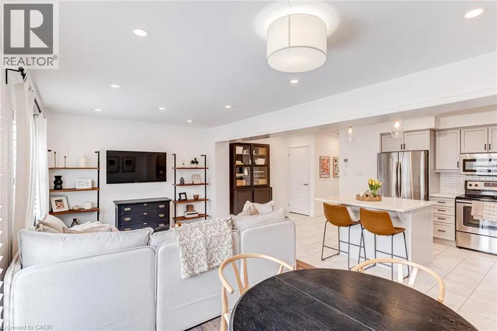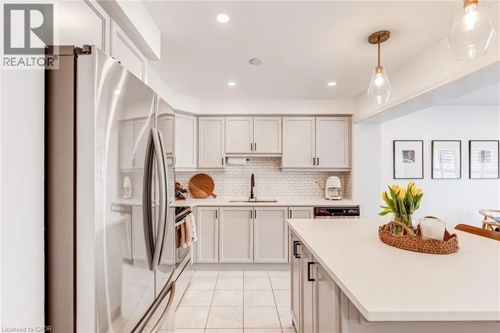 Spring Creek Drive to McMonies Drive FREEHOLD 2-storey home in the charming neighbourhood of Waterdown East! This 3 bedroom, 2.5 bathroom home has just under 1400 square feet and has been wonderfully maintained. The main floor has been refined with tasteful updates throughout ownership. The kitchen features painted cupboards with upgraded hardware, stone countertops with a stainless steel under-mount sink, stainless steel appliances and a large kitchen island with added seating. The spacious dining/living room boasts a flexible layout with two options for a dining area, cozy lounging space and a walk-out to the backyard. The main level is complete with a 2-piece powder room, smooth ceilings, neutral colour palette and pot lights. The second level has great functionality with 3 spacious bedrooms and an additional 4-piece bathroom. The primary bedroom features amazing storage with TWO large walk-in closets and a 4-piece ensuite. The unfinished basement can be customized to any buyers wants and needs and adds an additional 600 square feet to the overall living space, with an oversized double window for plenty of natural light, laundry space and storage space. This property is situated at the back of a very quiet street with a large covered front porch, serene fully fenced backyard, 1-car garage and 2-car driveway. A short drive to all the restaurants and amenities of Downtown Waterdown, a quick walk to parks and trails. (id:27476)